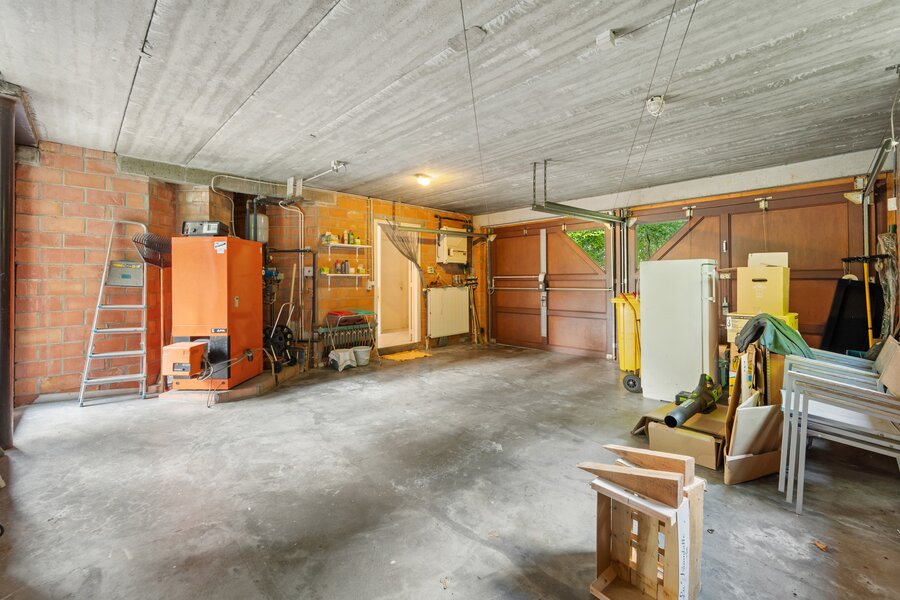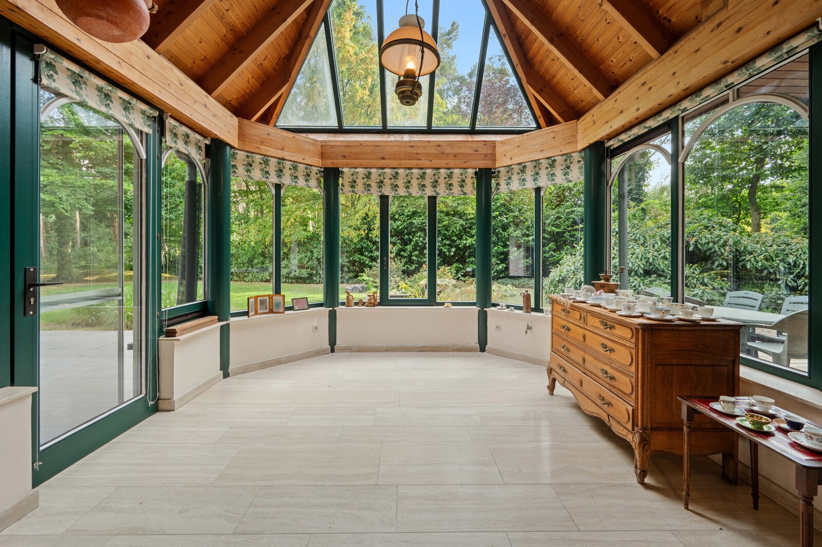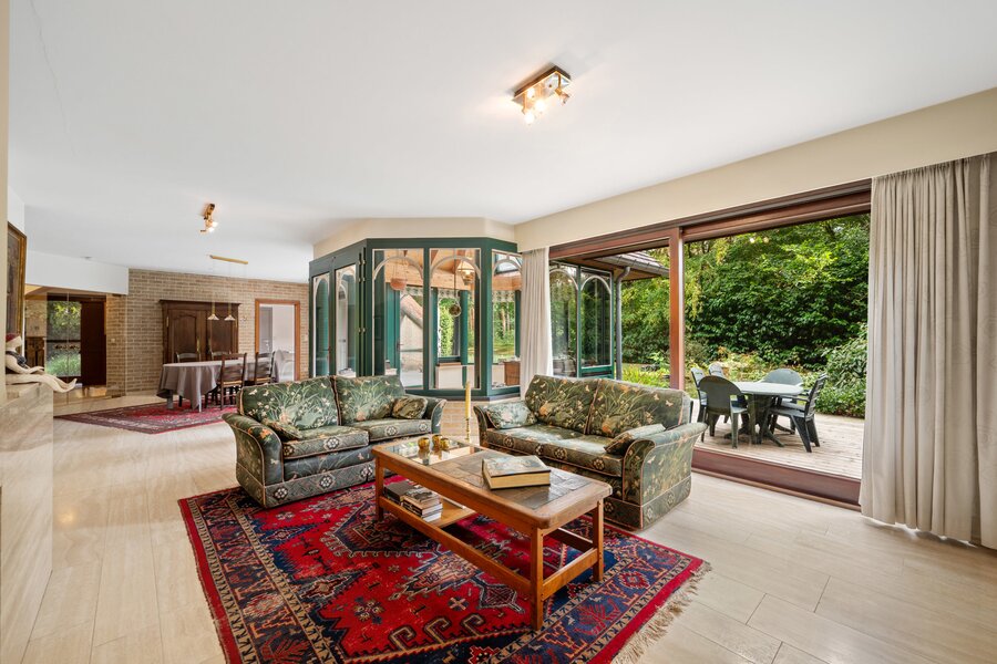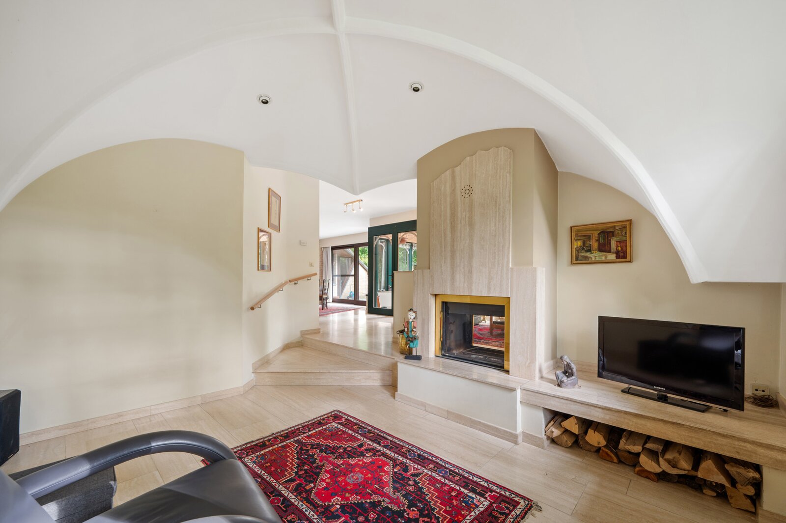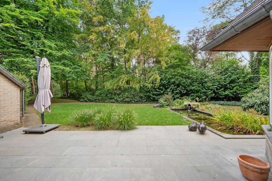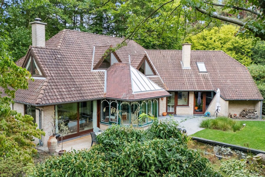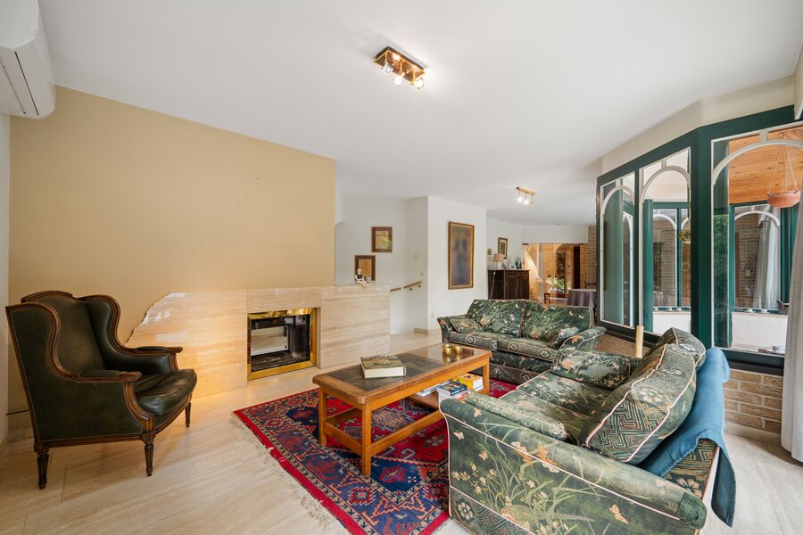 Bij binnenkomst via de inkomhal met vide treft u een gastentoilet en vestiaire/berging. Vanuit de hal komt u in de lichtrijke leefruimte met uitzicht op de tuin en de vijver. De living is ingedeeld in een gezellige zithoek en een aparte tv-ruimte, met een open haard die extra warmte en sfeer brengt. Aansluitend bevindt zich een sfeervolle orangerie, ideaal als eetplaats of extra zithoek. De keuken sluit mooi aan en leidt verder naar de praktische wasplaats met ingemaakte kasten, die toegang biedt tot de dubbele garage. Op het gelijkvloers is bovendien een aparte bureauruimte voorzien, perfect om thuis te werken.