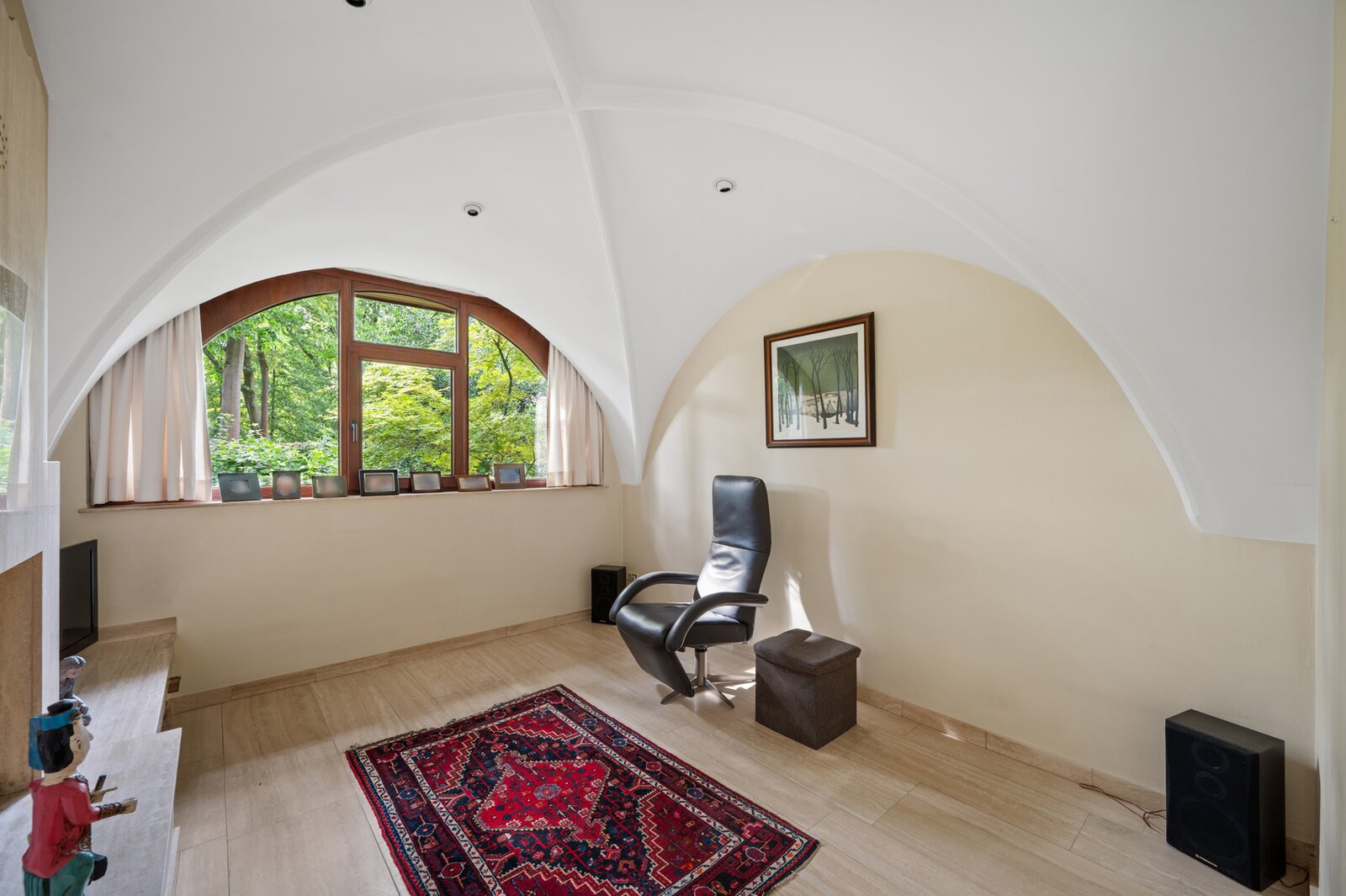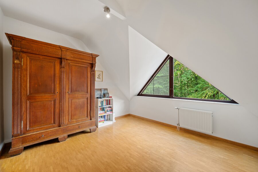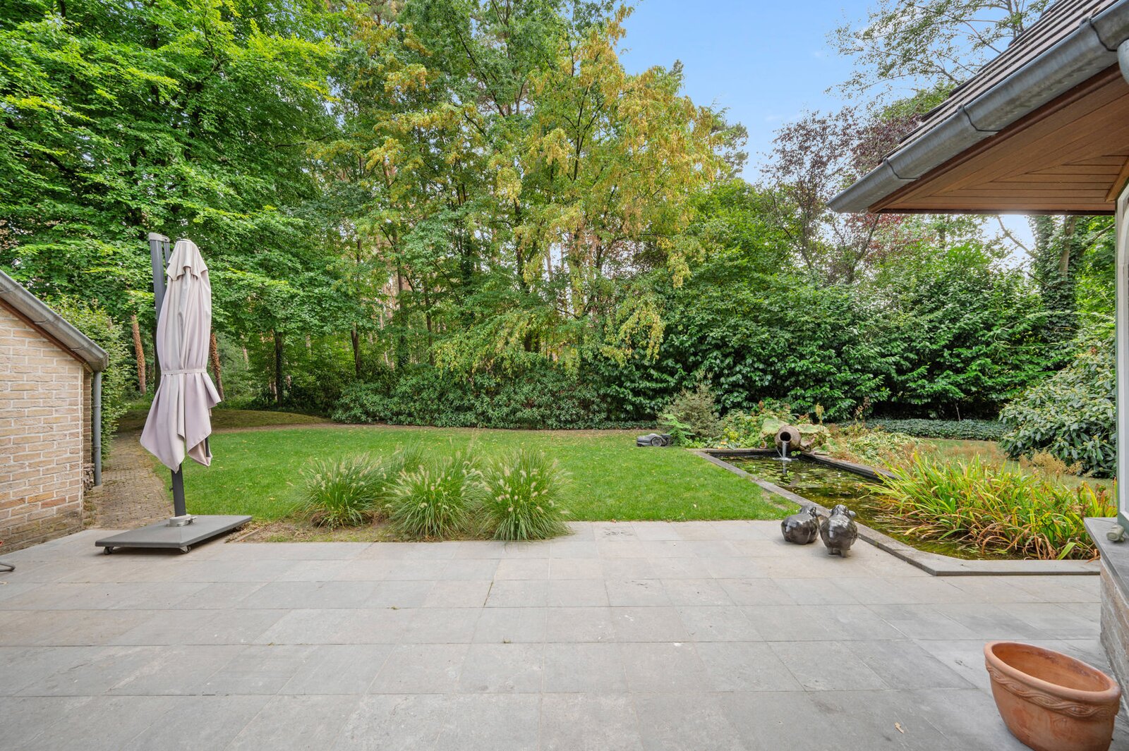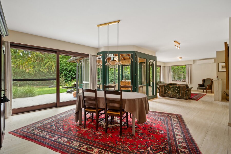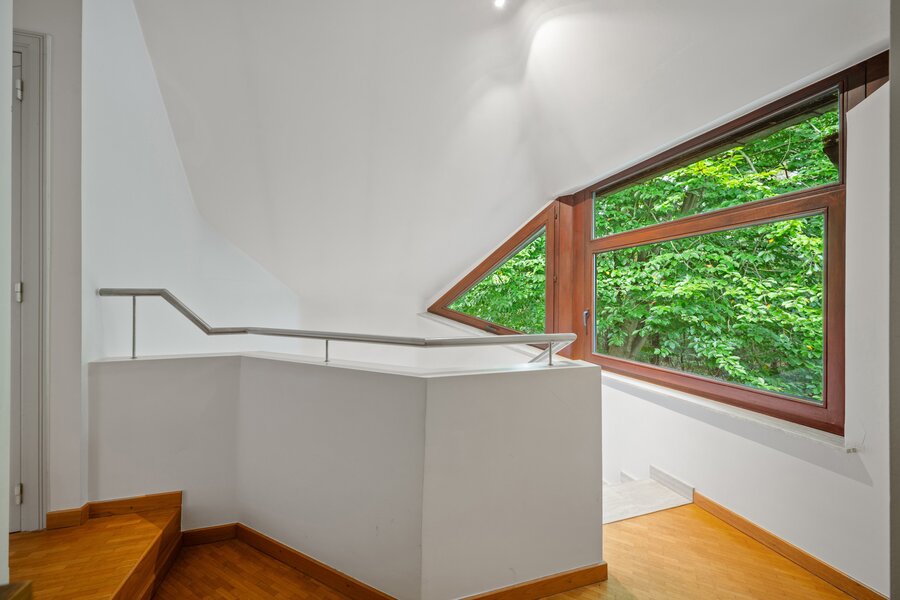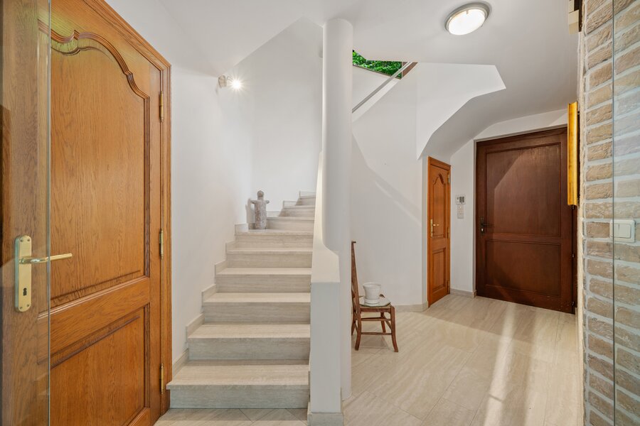 Bij binnenkomst via de inkomhal met vide treft u een gastentoilet en vestiaire/berging. Vanuit de hal komt u in de lichtrijke leefruimte met uitzicht op de tuin en de vijver. De living is ingedeeld in een gezellige zithoek en een aparte tv-ruimte, met een open haard die extra warmte en sfeer brengt. Aansluitend bevindt zich een sfeervolle orangerie, ideaal als eetplaats of extra zithoek. De keuken sluit mooi aan en leidt verder naar de praktische wasplaats met ingemaakte kasten, die toegang biedt tot de dubbele garage. Op het gelijkvloers is bovendien een aparte bureauruimte voorzien, perfect om thuis te werken.