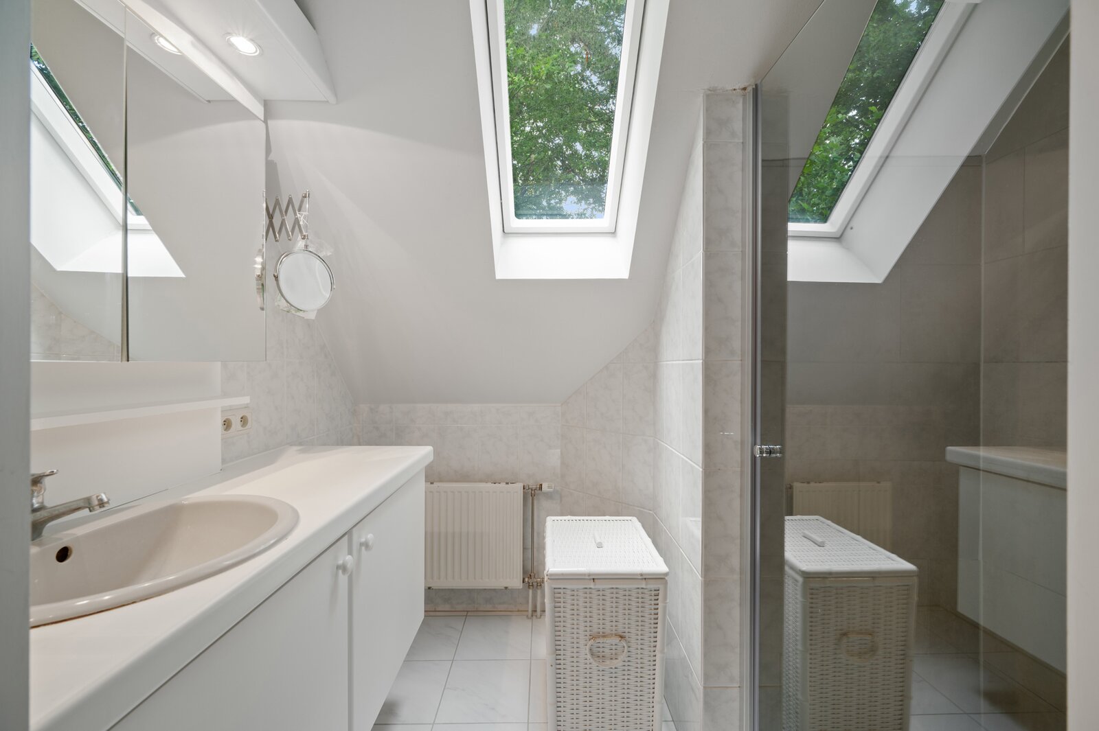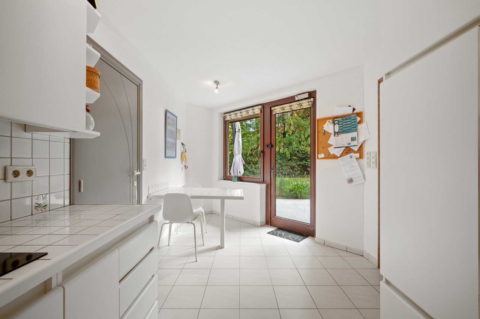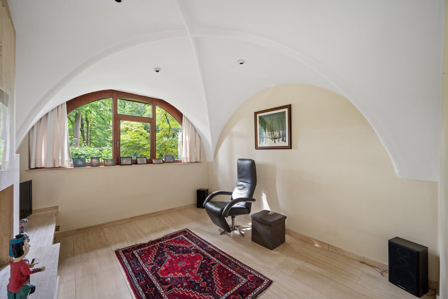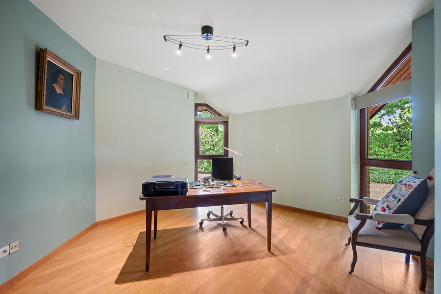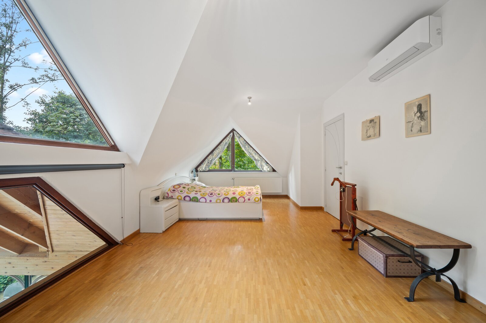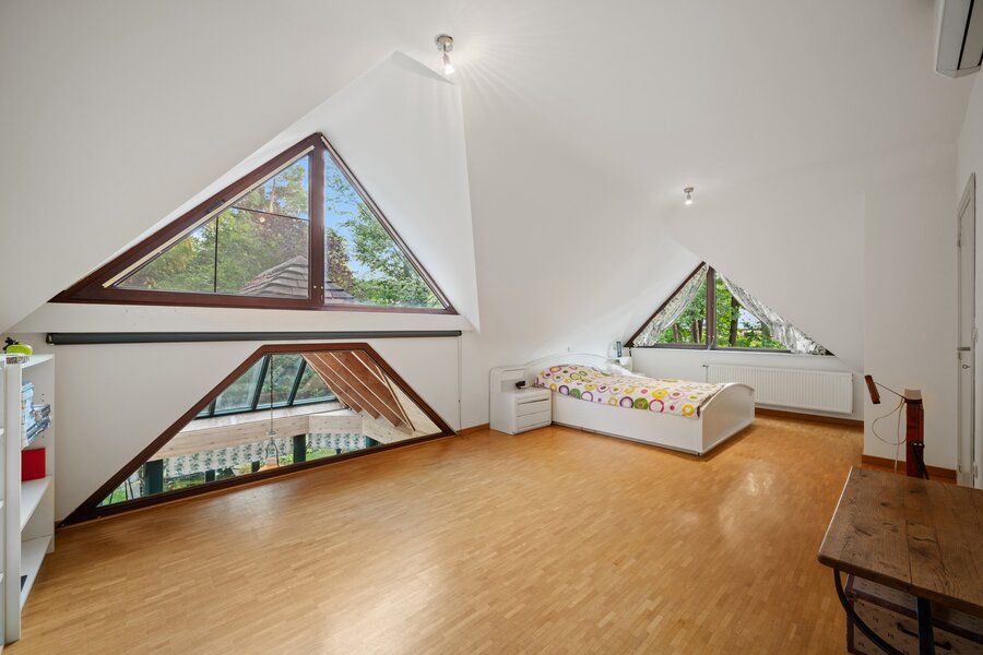 Bij binnenkomst via de inkomhal met vide treft u een gastentoilet en vestiaire/berging. Vanuit de hal komt u in de lichtrijke leefruimte met uitzicht op de tuin en de vijver. De living is ingedeeld in een gezellige zithoek en een aparte tv-ruimte, met een open haard die extra warmte en sfeer brengt. Aansluitend bevindt zich een sfeervolle orangerie, ideaal als eetplaats of extra zithoek. De keuken sluit mooi aan en leidt verder naar de praktische wasplaats met ingemaakte kasten, die toegang biedt tot de dubbele garage. Op het gelijkvloers is bovendien een aparte bureauruimte voorzien, perfect om thuis te werken.
