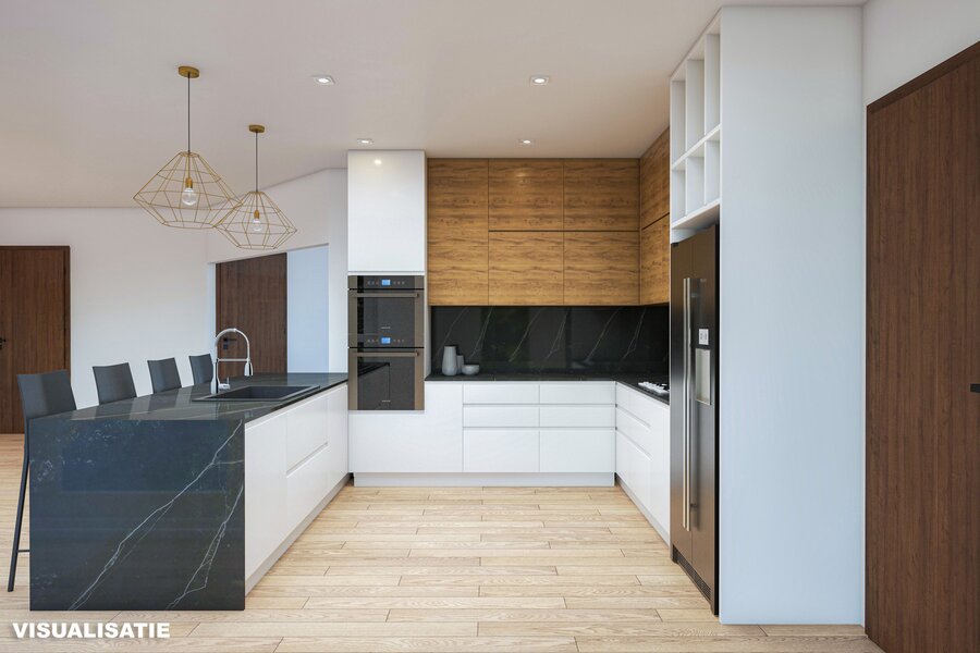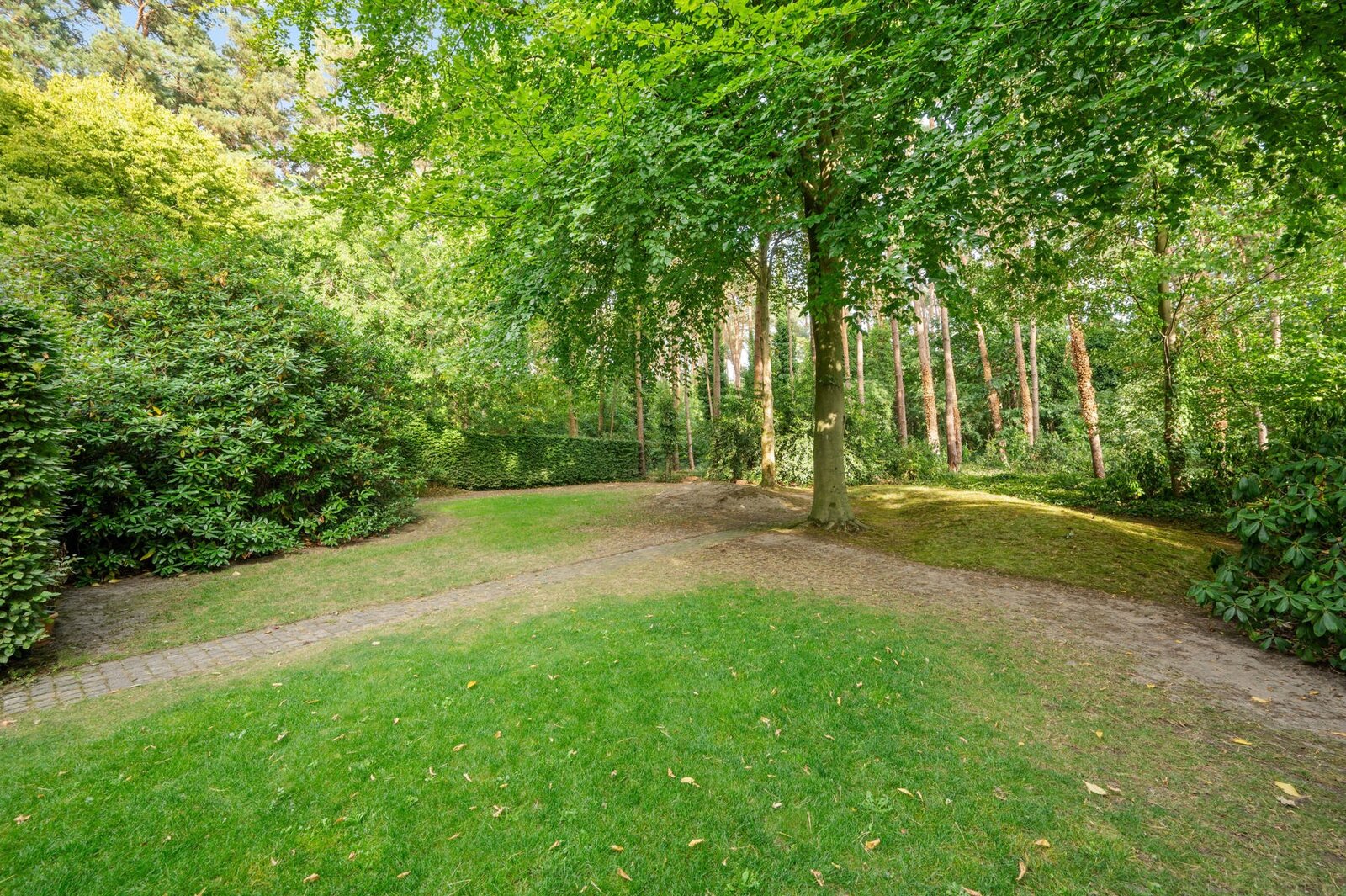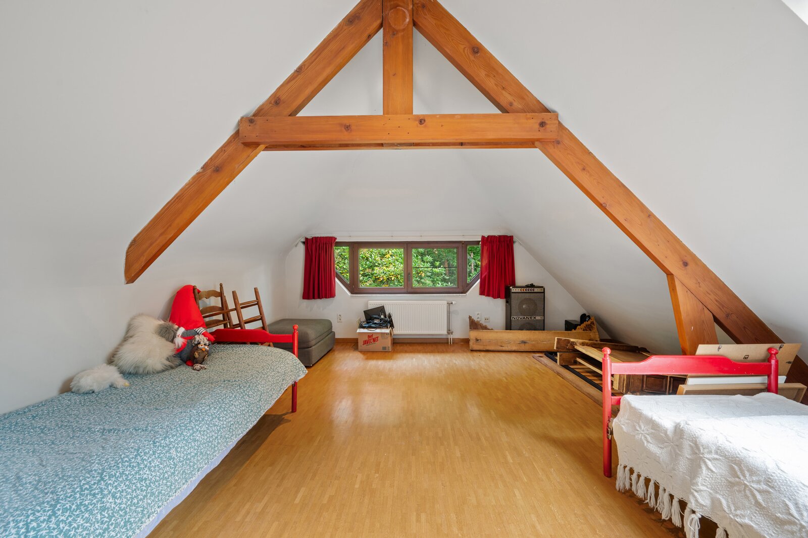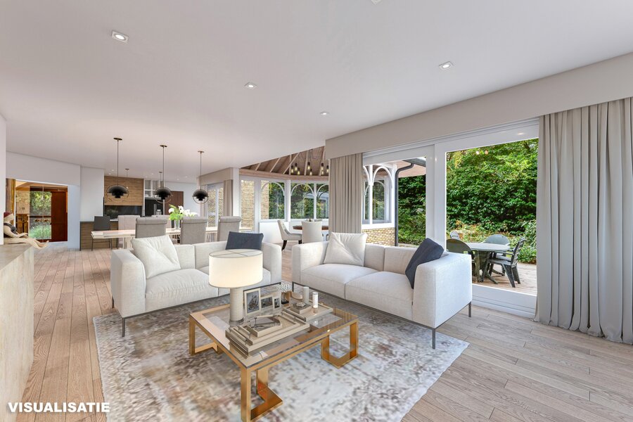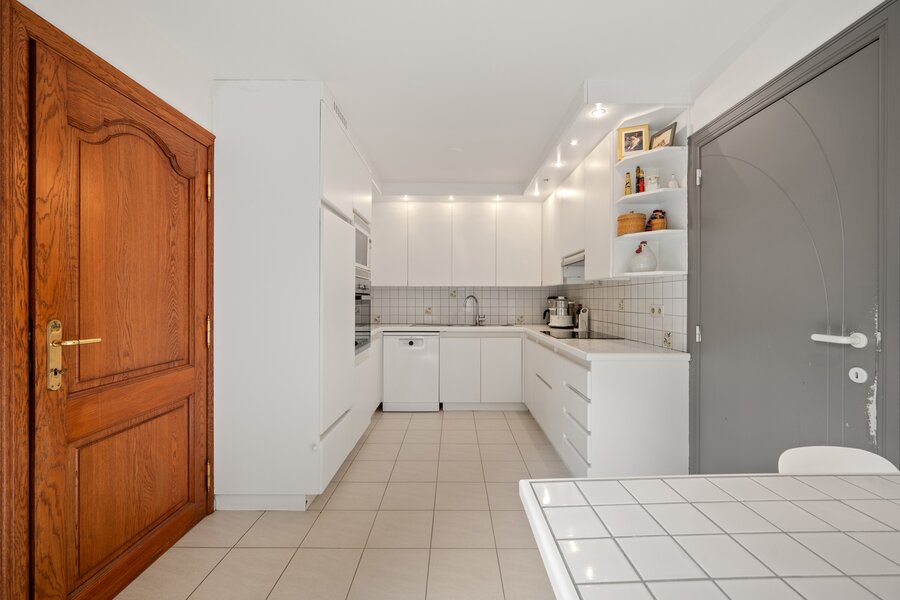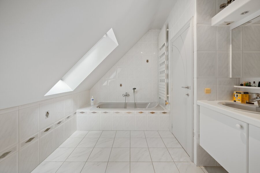 Bij binnenkomst via de inkomhal met vide treft u een gastentoilet en vestiaire/berging. Vanuit de hal komt u in de lichtrijke leefruimte met uitzicht op de tuin en de vijver. De living is ingedeeld in een gezellige zithoek en een aparte tv-ruimte, met een open haard die extra warmte en sfeer brengt. Aansluitend bevindt zich een sfeervolle orangerie, ideaal als eetplaats of extra zithoek. De keuken sluit mooi aan en leidt verder naar de praktische wasplaats met ingemaakte kasten, die toegang biedt tot de dubbele garage. Op het gelijkvloers is bovendien een aparte bureauruimte voorzien, perfect om thuis te werken.