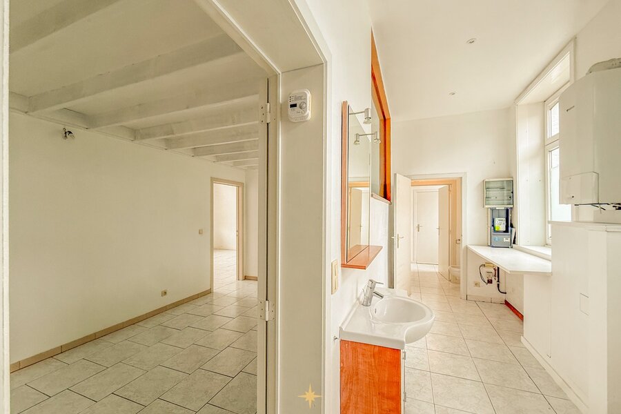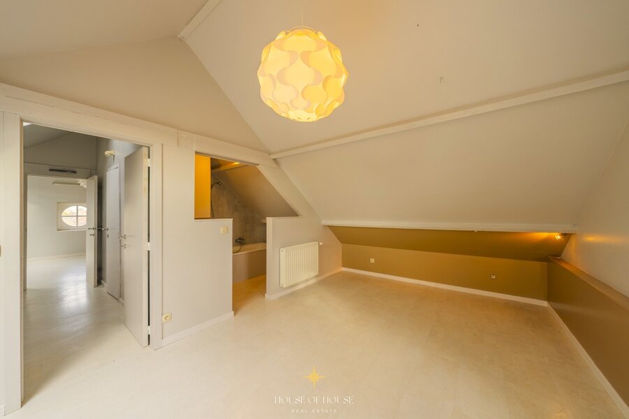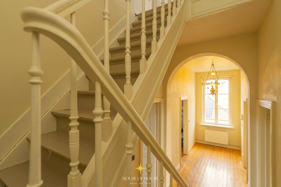De directeurswoning aan de straatzijde maakt meteen indruk met haar hoge plafonds, elegante proporties en de prachtige authentieke trap in de inkomhal. De renovaties uit de jaren ’90, waaronder het raamwerk, werden uitgevoerd met respect voor de historische waarde van het monument. Binnenin bevinden zich vijf slaapkamers, verdeeld over twee verdiepingen. Op de eerste verdieping liggen drie ruime kamers en een badkamer, terwijl de bovenste verdieping twee bijkomende slaapkamers biedt — elk met een eigen karakter — aangevuld met twee afzonderlijke doucheruimtes. De houten vloer op de tussenverdieping versterkt de warmte en klasse van de woning. Met een aparte zij-ingang en een garage geniet deze beschermde woning van een hoge mate van privacy. Ze is verhuurd aan betrouwbare en langdurige huurders en draagt zo aanzienlijk bij aan het stabiele rendement.
