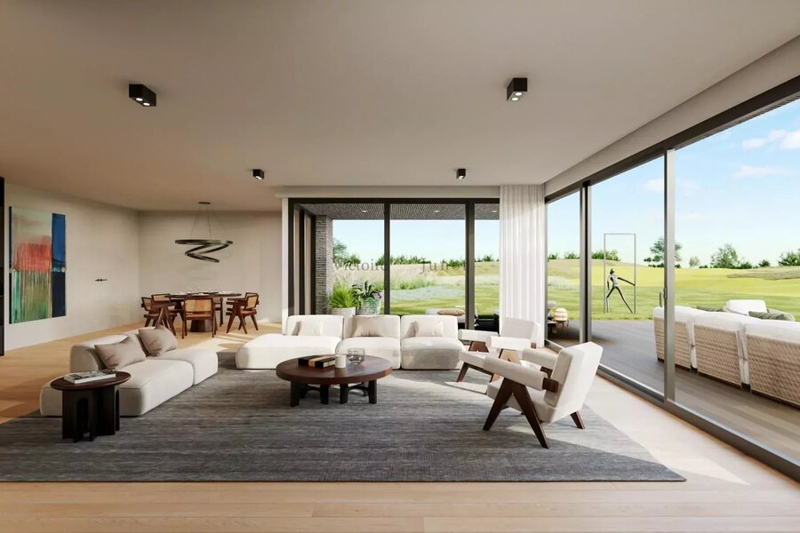 Het gelijkvloers verwelkomt een mooie inkomhal, met checkroom, een gastentoilet, een bureau en de trap die naar de eerste verdieping leidt. Deze hall opent aan de voorzijde naar een groene patio, vervolgens aan de ene kant naar de keuken, de ontbijtzaal en de bijkeuken en aan de andere kant naar de ruime en lumineuze leefruimtes. De zuidgerichte terrassen verlengen het huis mooi en bieden een vrij uitzicht op de golfbaan, de groene ruimtes en de vijvers .