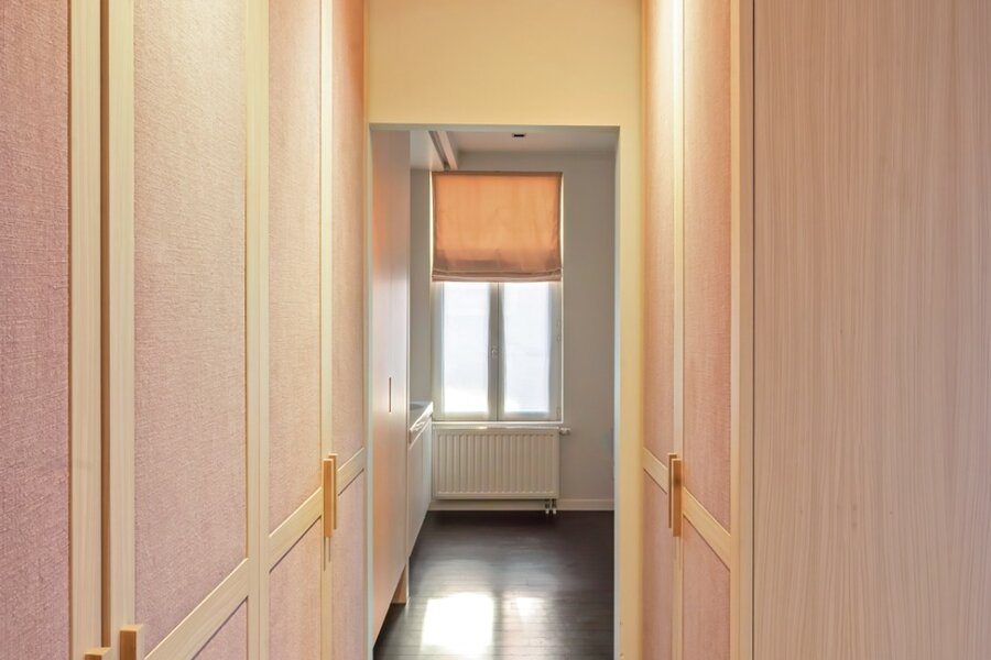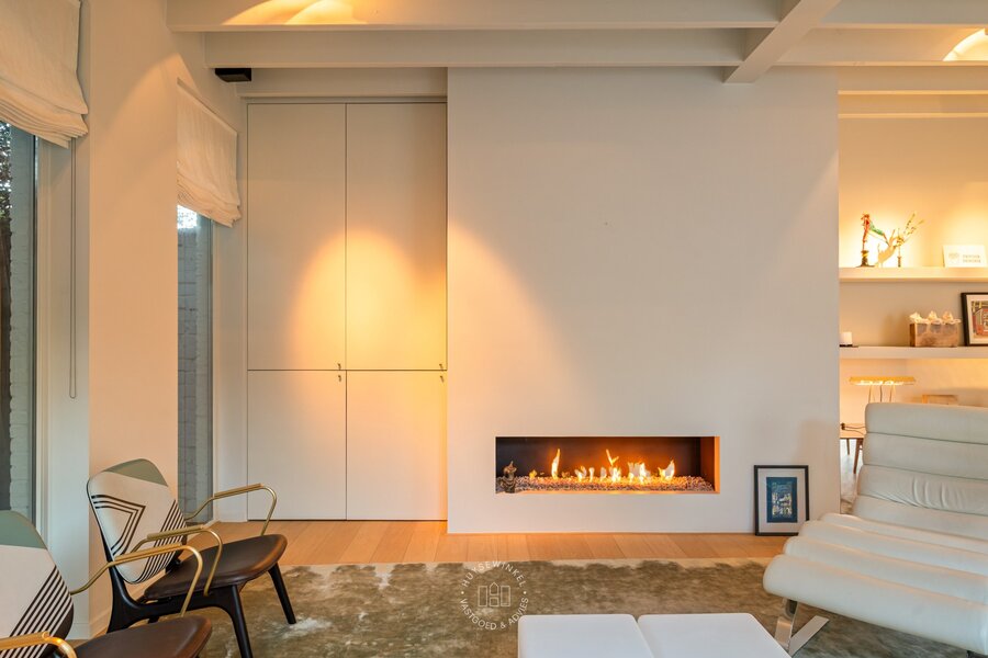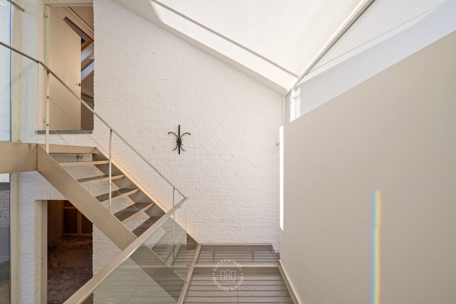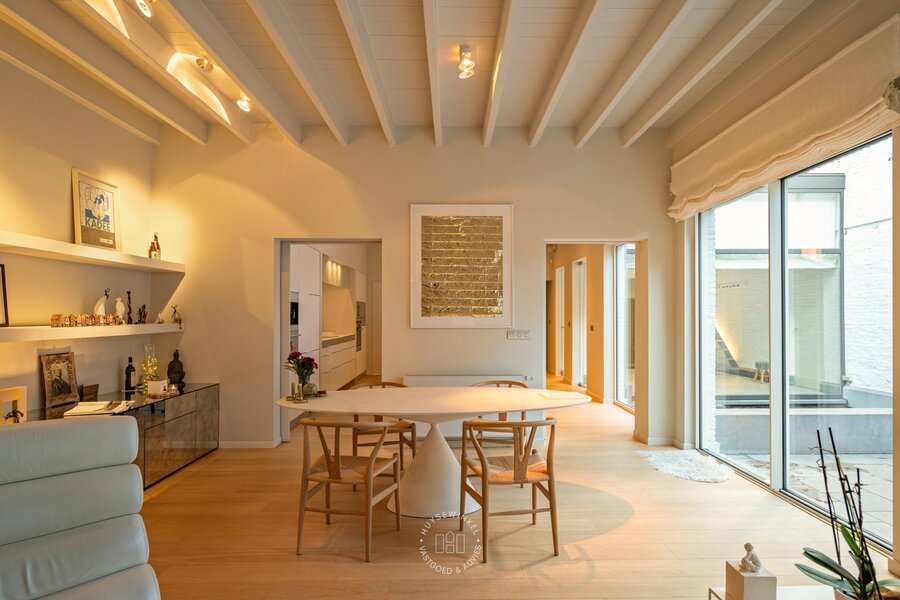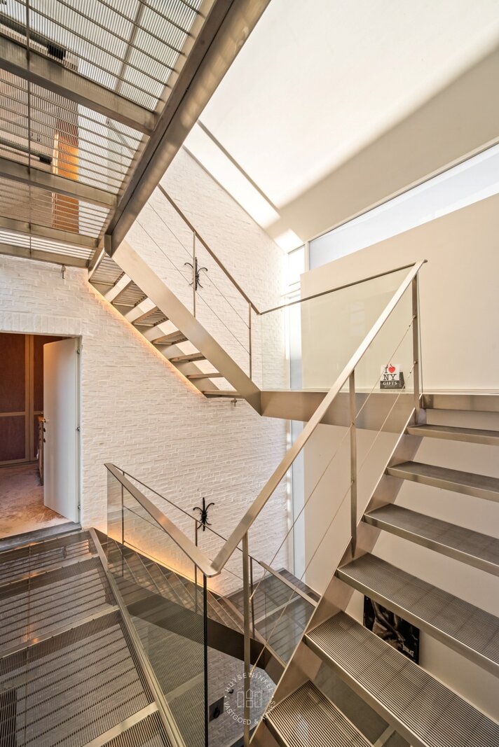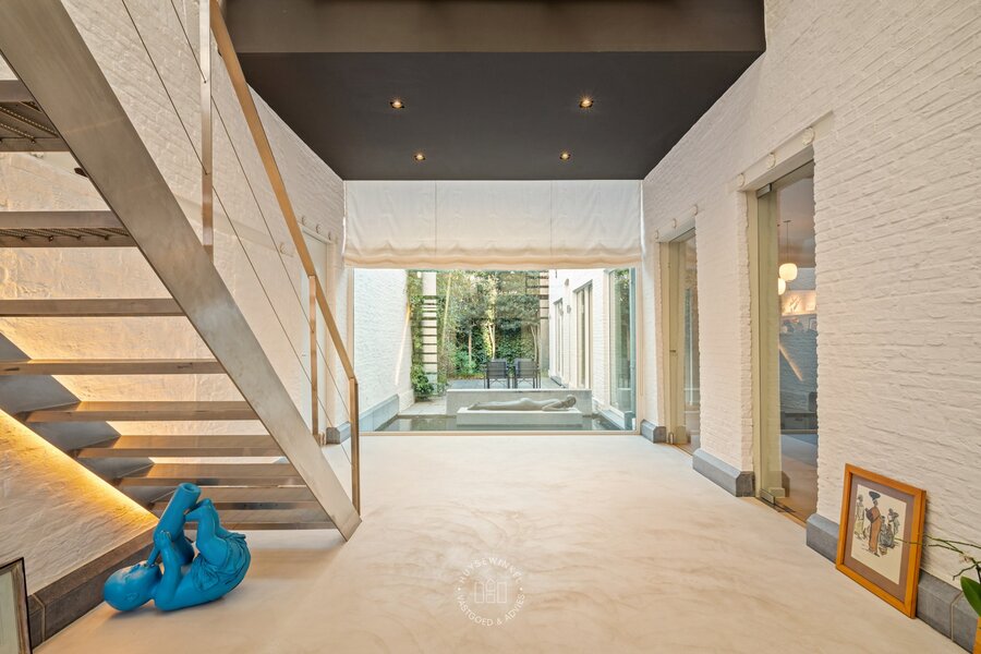 Van zodra u binnenstapt, ervaart u het volume. De inkomhal strekt zich uit over dubbele hoogte en wordt rijkelijk verlicht door achterliggende glaspartijen. De elegante inoxen trap en de open zichtlijnen naar de patio geven de ruimte een bijna galerijachtige uitstraling en zetten meteen de architecturale signatuur van de woning neer. Hier voelt u meteen de combinatie van geschiedenis en hedendaagse architectuur.