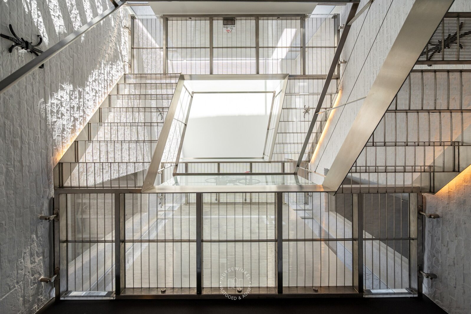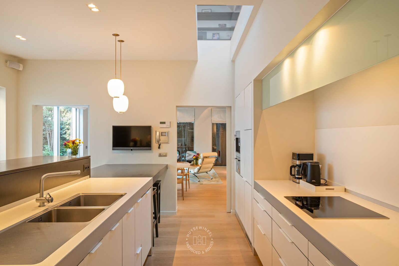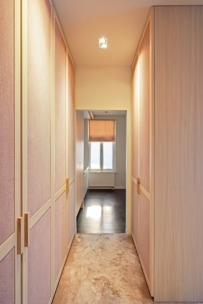 Van zodra u binnenstapt, ervaart u het volume. De inkomhal strekt zich uit over dubbele hoogte en wordt rijkelijk verlicht door achterliggende glaspartijen. De elegante inoxen trap en de open zichtlijnen naar de patio geven de ruimte een bijna galerijachtige uitstraling en zetten meteen de architecturale signatuur van de woning neer. Hier voelt u meteen de combinatie van geschiedenis en hedendaagse architectuur.