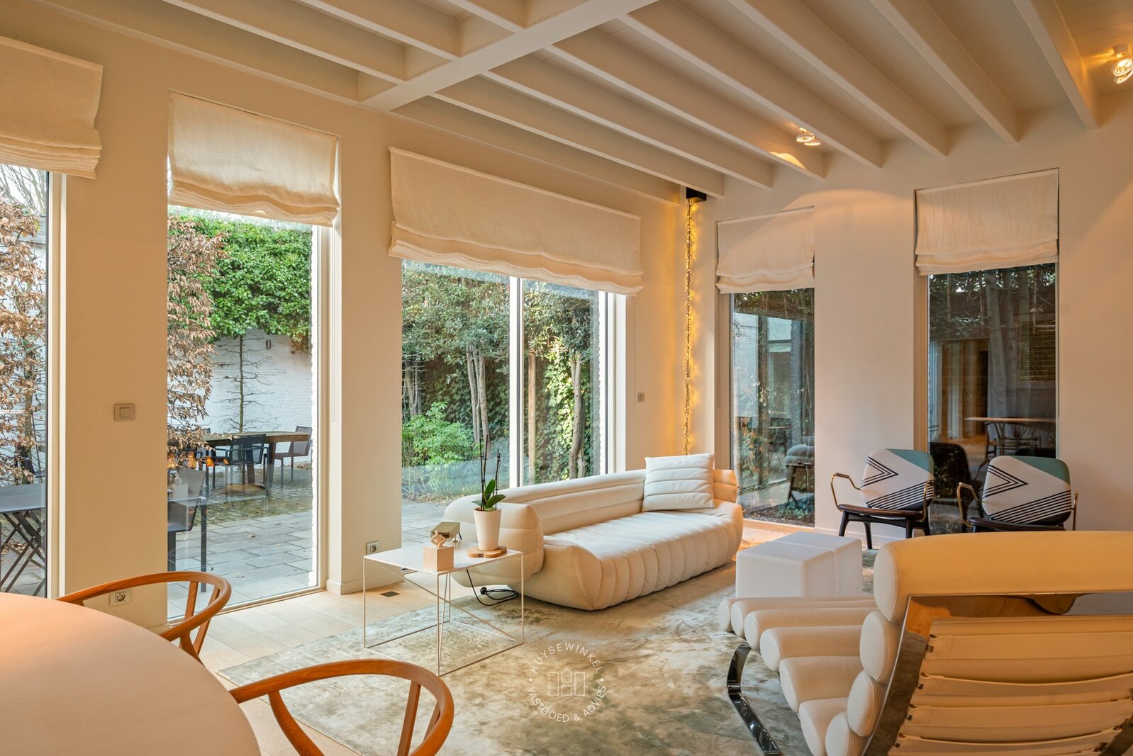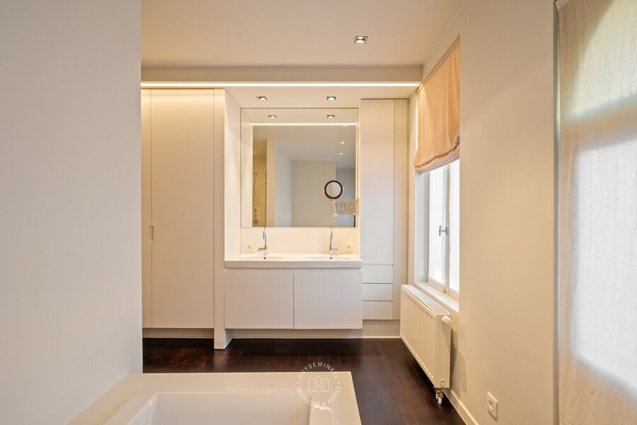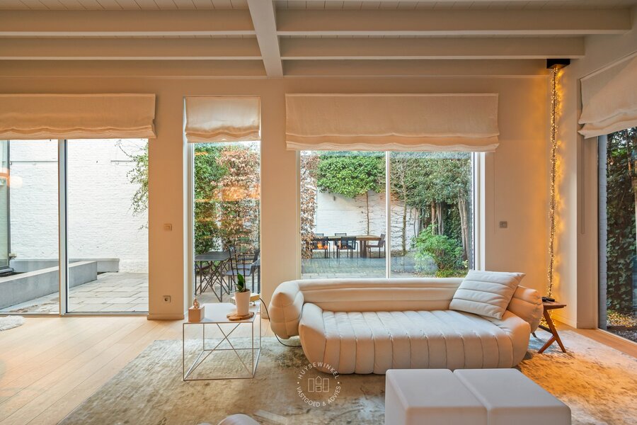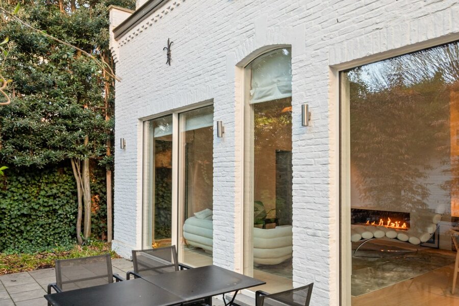 De leefruimte op het gelijkvloers wordt gekenmerkt door licht en openheid. Grote raampartijen verbinden de woonruimte met de zonnige, groene patio, een private buitenkamer midden in de stad. De hoogwaardige Bulthaup-keuken sluit harmonieus aan op de eet- en zithoek, waardoor koken, tafelen en ontspannen moeiteloos in elkaar overvloeien. Aansluitend vindt u in dit gedeelte van de woning een praktische berging, een vestiaire, een gastentoilet en toegang tot de kelderverdieping. Aan de andere zijde van deze benedenverdieping bevindt zich een ruime garage met plaats voor twee wagens.