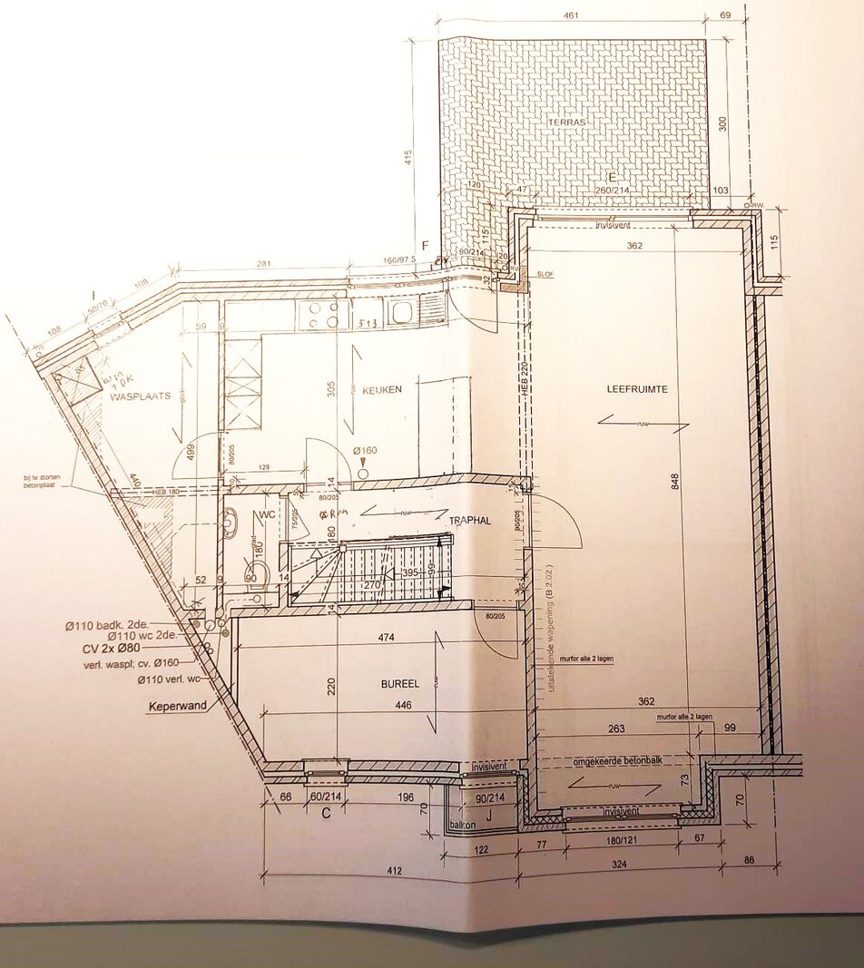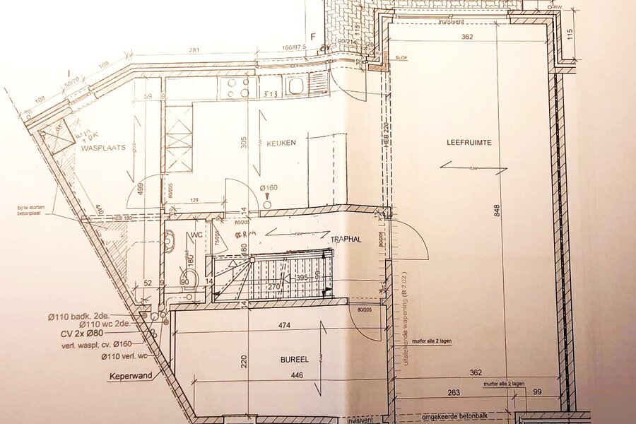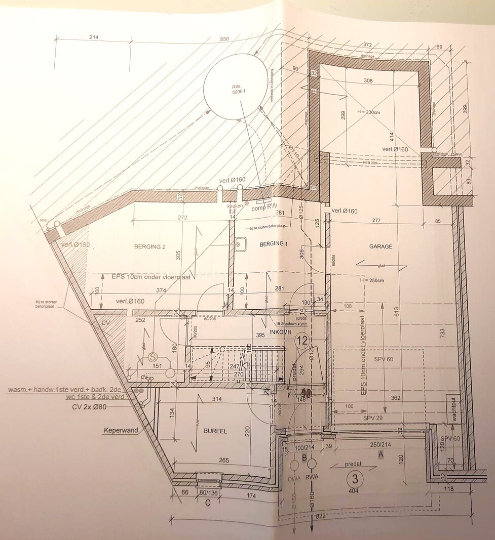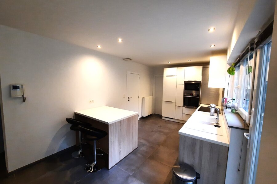 De indeling is functioneel: op het straatniveau bevinden zich de inkomhal, een bureel, verschillende kelders en een garage met plaats voor twee wagens. Op tuinniveau vindt u een gastentoilet, een volledig uitgeruste keuken, een wasplaats, een eetplaats, een ruime woonkamer, een bijkomend bureel en een aangenaam tuin-terras.