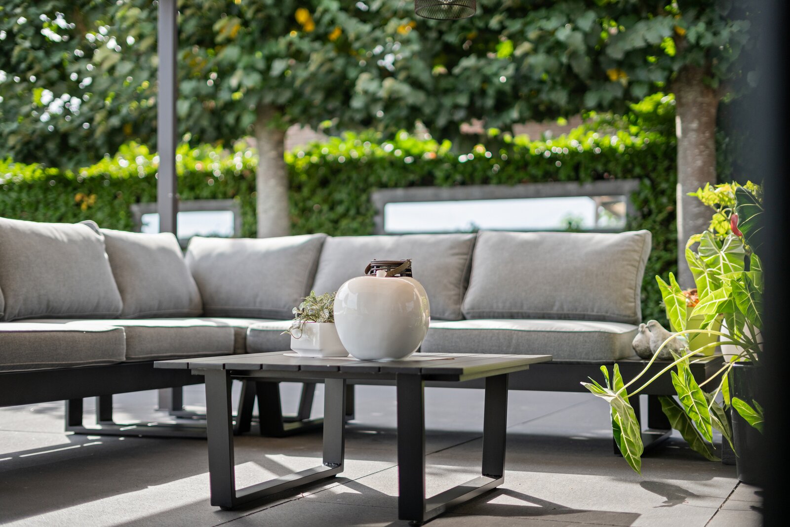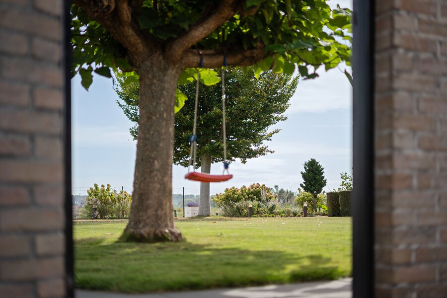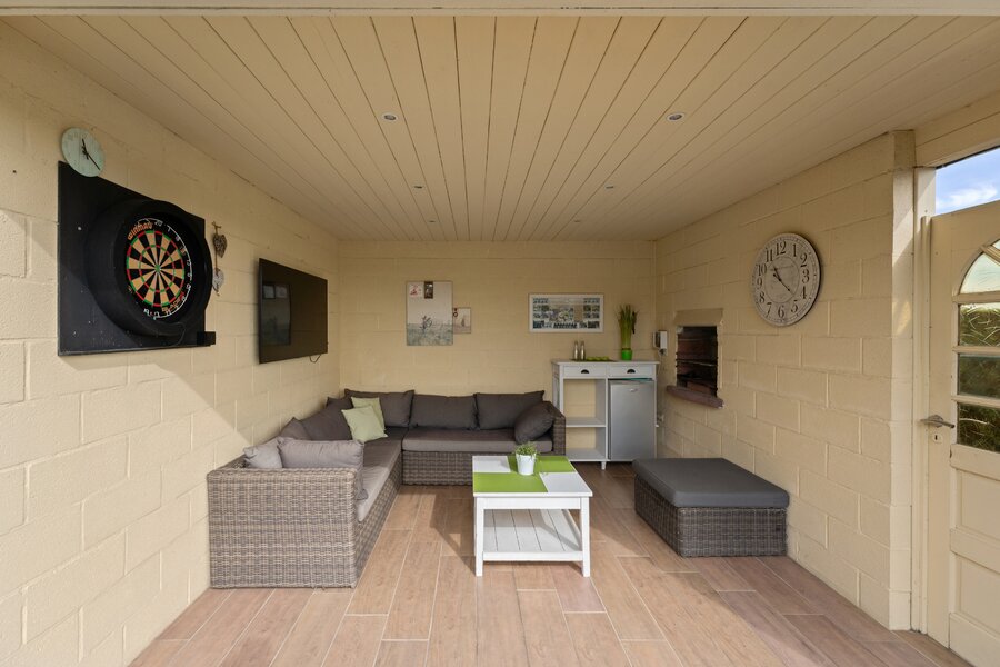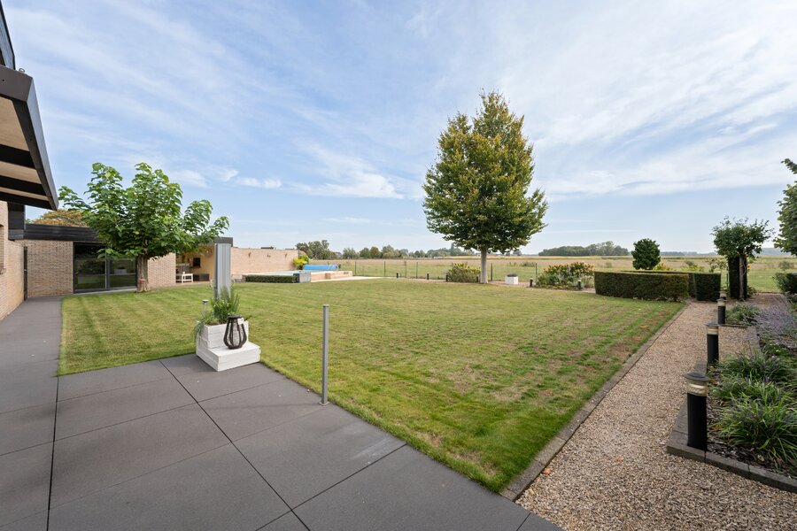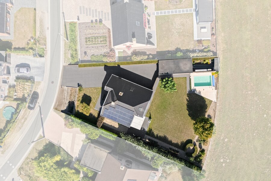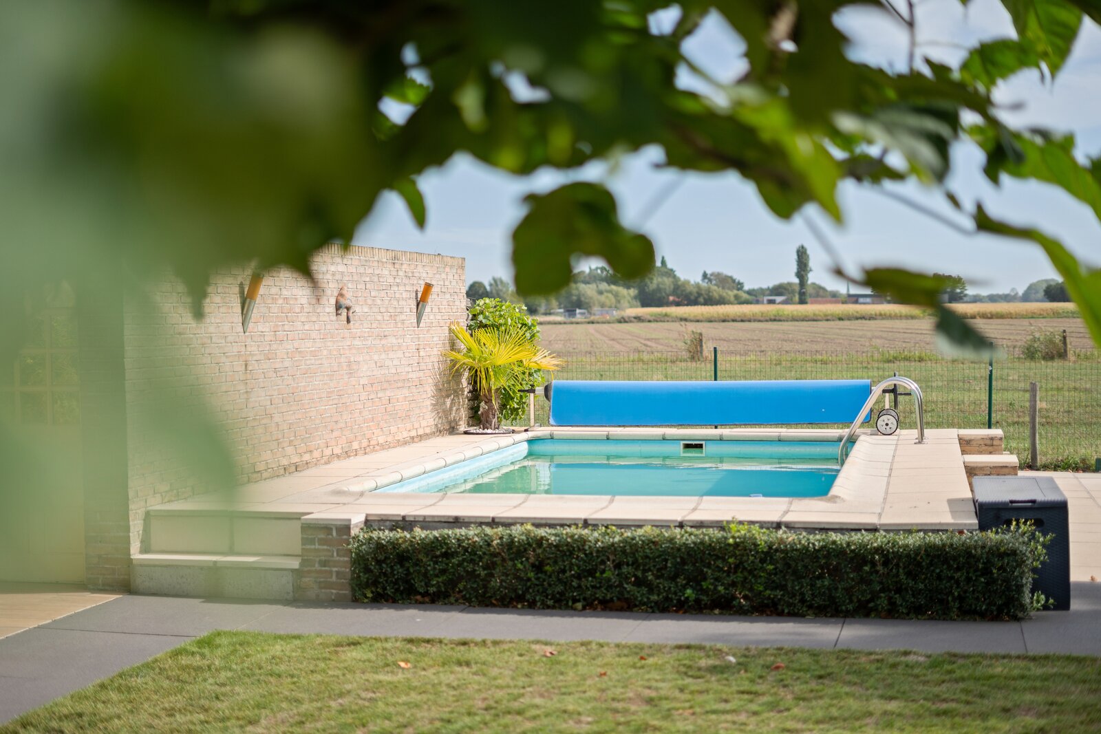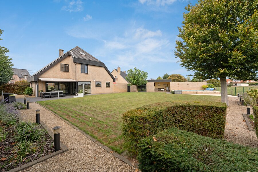 De tuin vormt een oase van rust en ontspanning. Centraal ligt het verwarmde zwembad met zonneterras, geflankeerd door een verzorgd poolhouse en een ruim overdekt terras. Een afzonderlijk garage/tuinhuis voorziet in bijkomende opslag.
