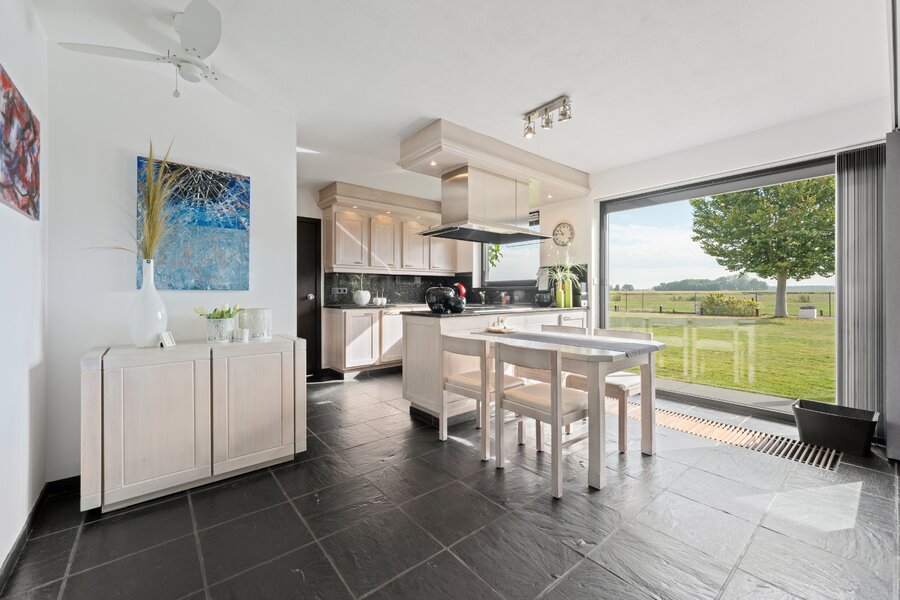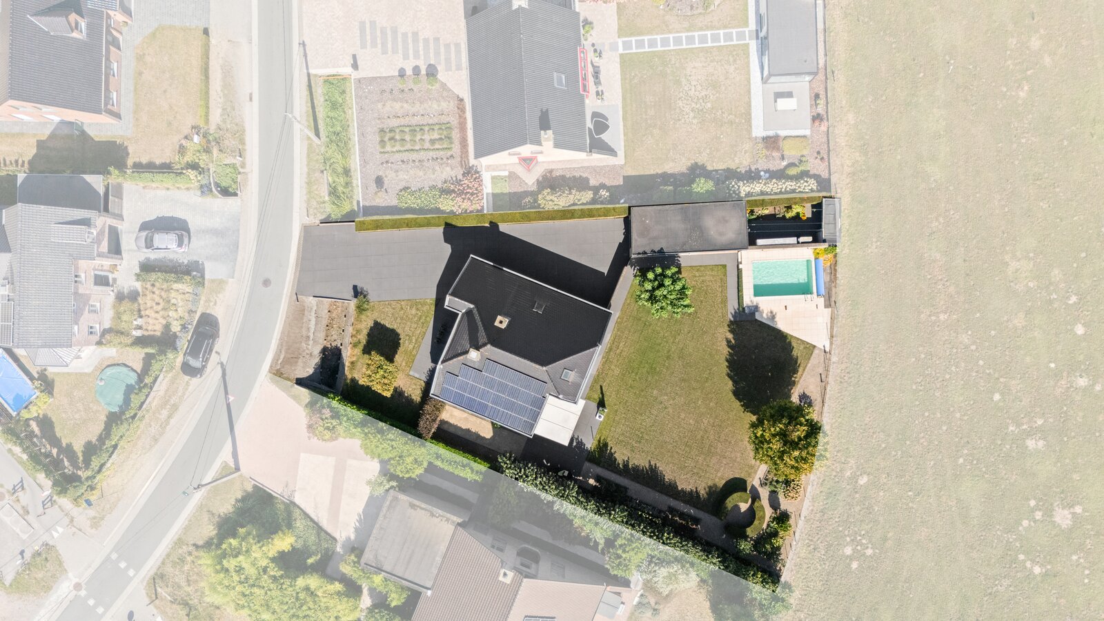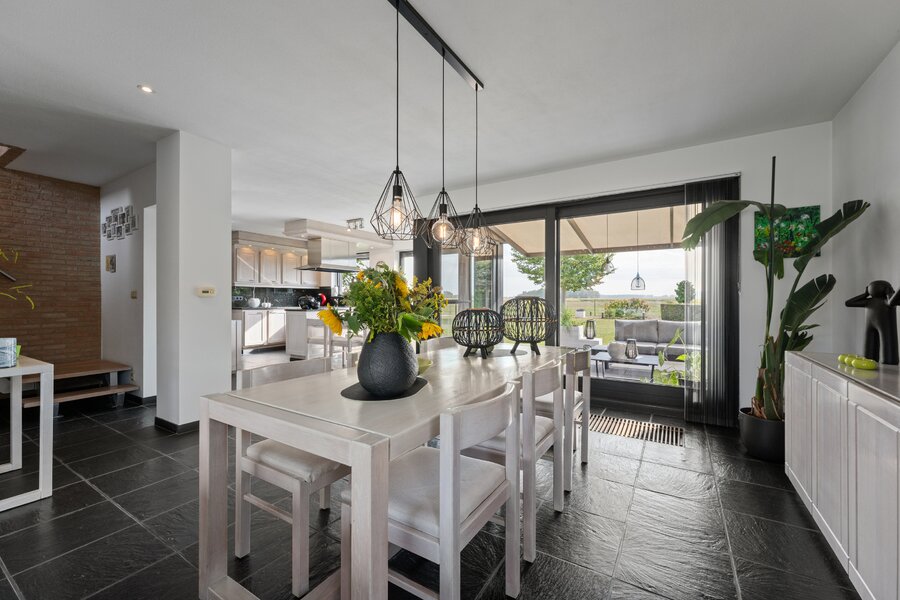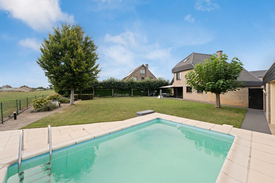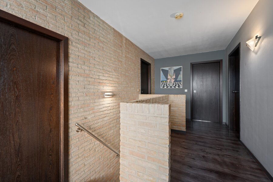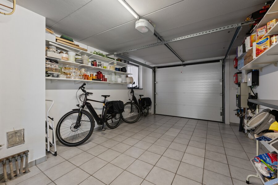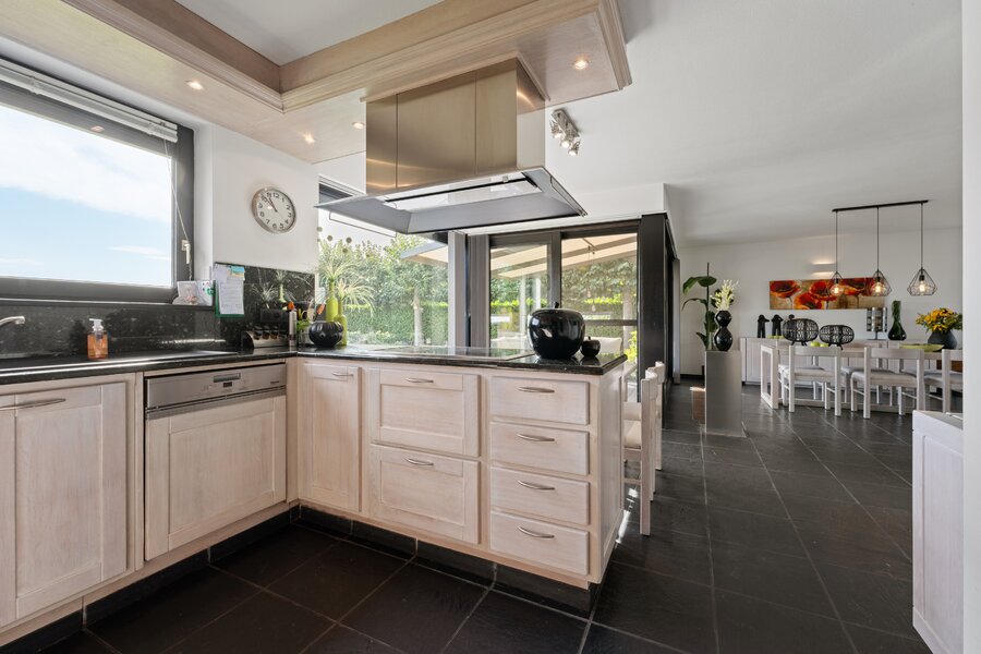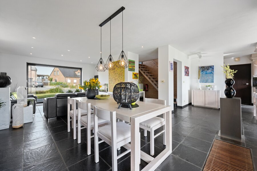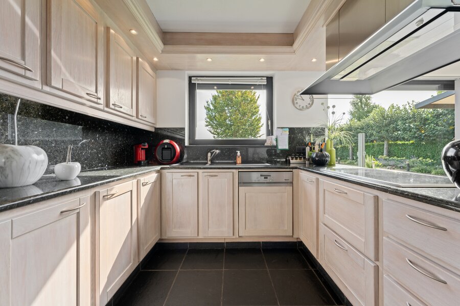 De inkomhal geeft toegang tot de lichtrijke leefruimte, waar grote raampartijen een prachtig zicht bieden op de tuin en het zwembad. De woonkamer sluit naadloos aan op de eetkamer en de volledig ingerichte keuken, waardoor een aangename openheid ontstaat. Elektrische zonne screens zorgen in elk seizoen voor comfort en controle over licht en warmte. Op het gelijkvloers zijn verder een praktische bijkeuken, een inpandige garage en een berging aanwezig.