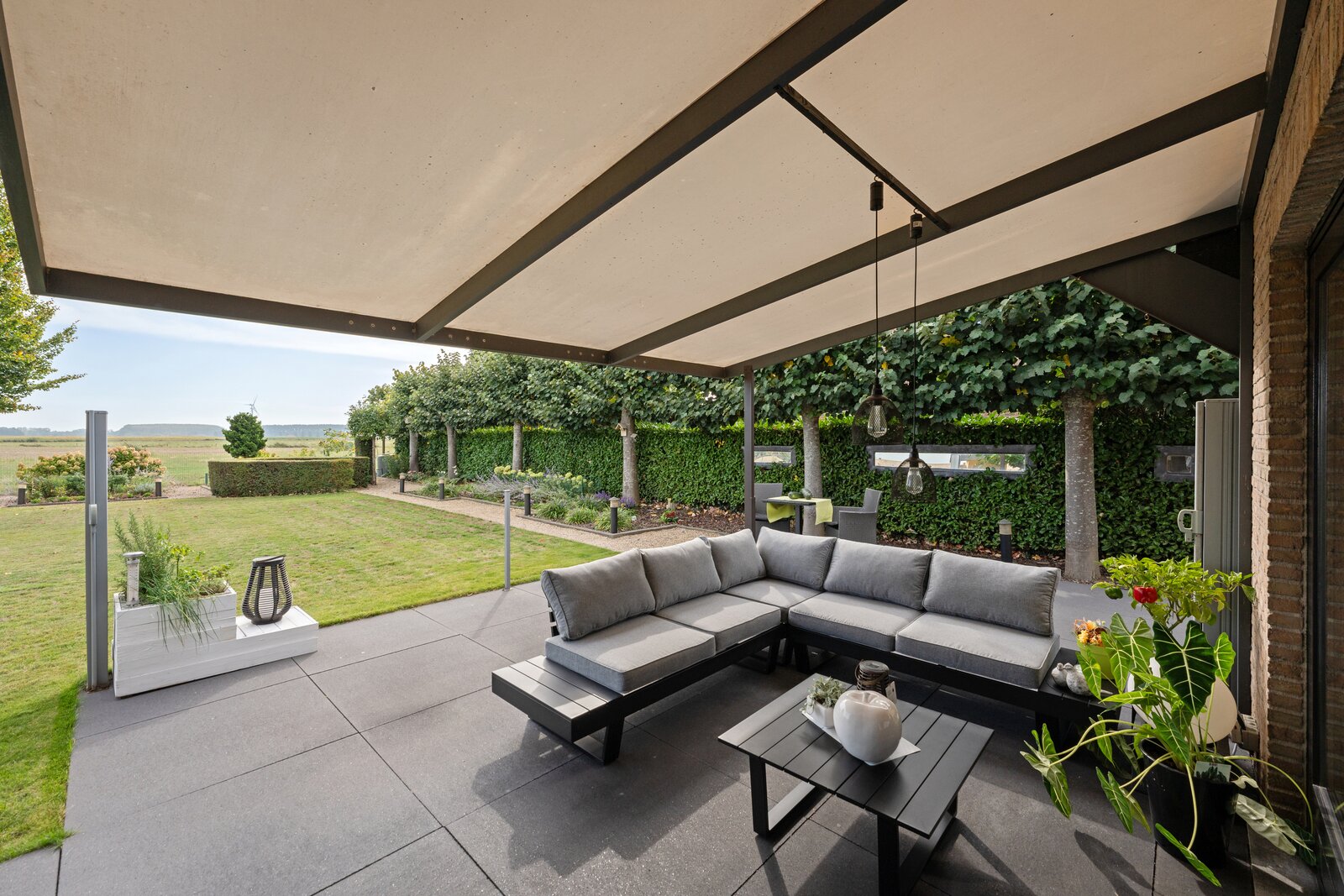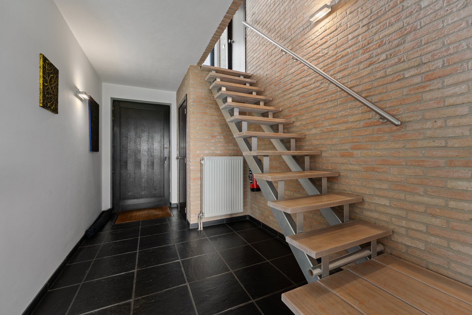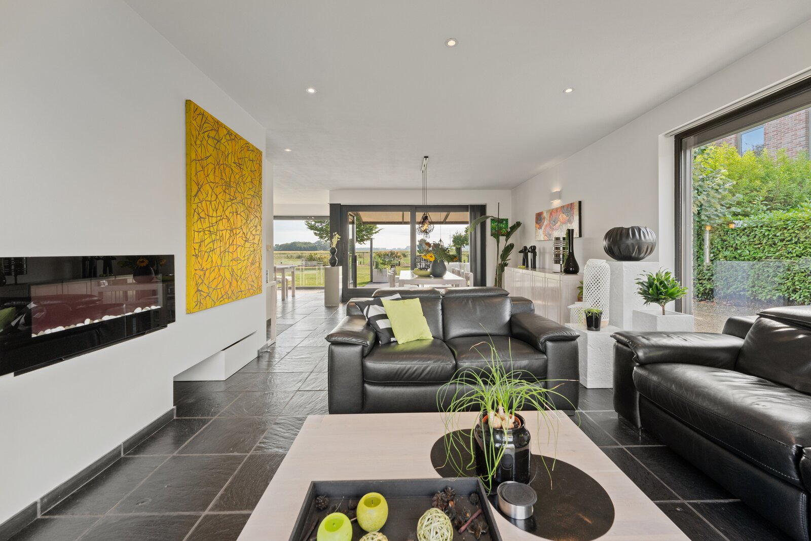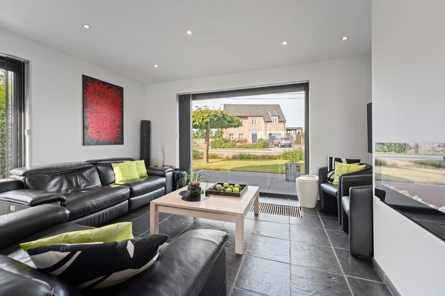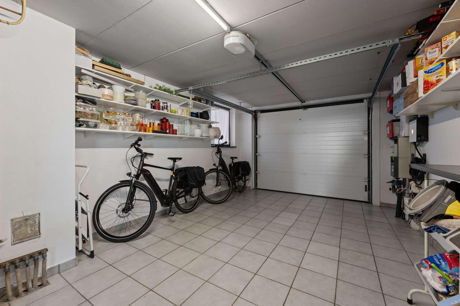 De inkomhal geeft toegang tot de lichtrijke leefruimte, waar grote raampartijen een prachtig zicht bieden op de tuin en het zwembad. De woonkamer sluit naadloos aan op de eetkamer en de volledig ingerichte keuken, waardoor een aangename openheid ontstaat. Elektrische zonne screens zorgen in elk seizoen voor comfort en controle over licht en warmte. Op het gelijkvloers zijn verder een praktische bijkeuken, een inpandige garage en een berging aanwezig.