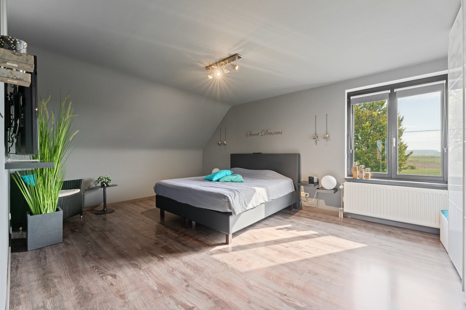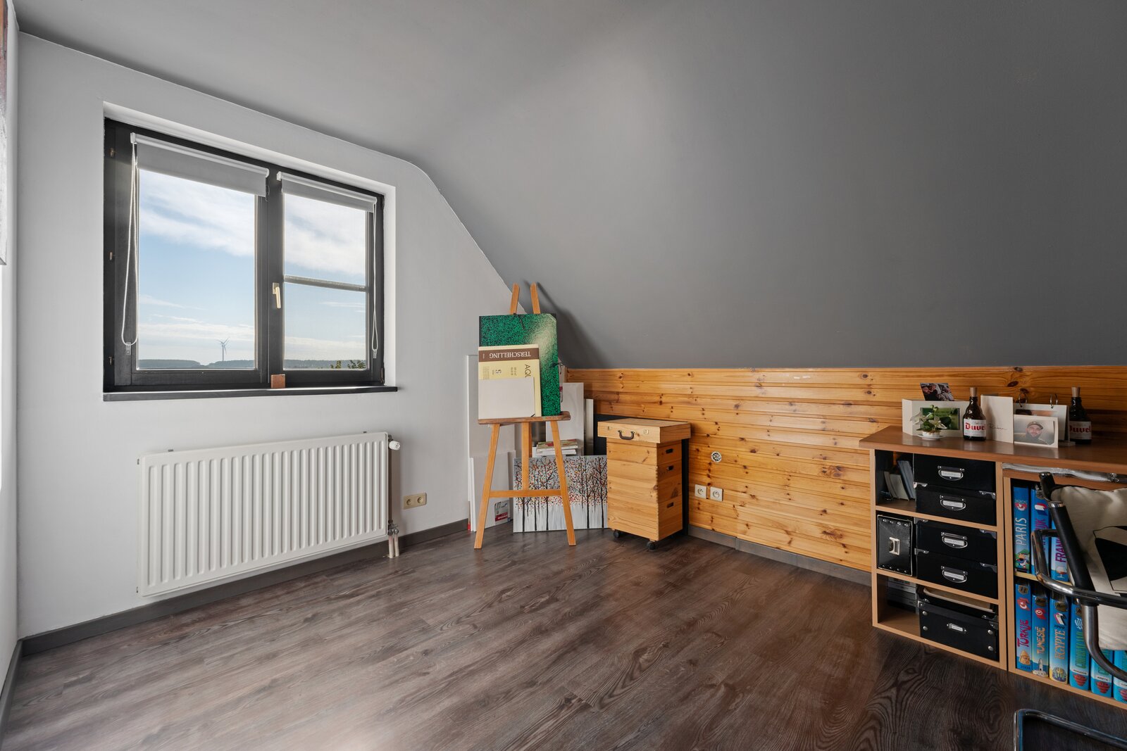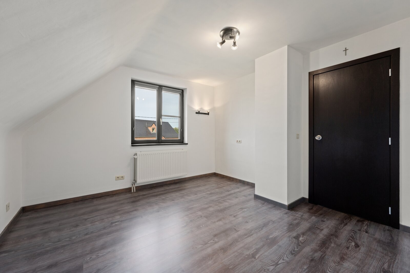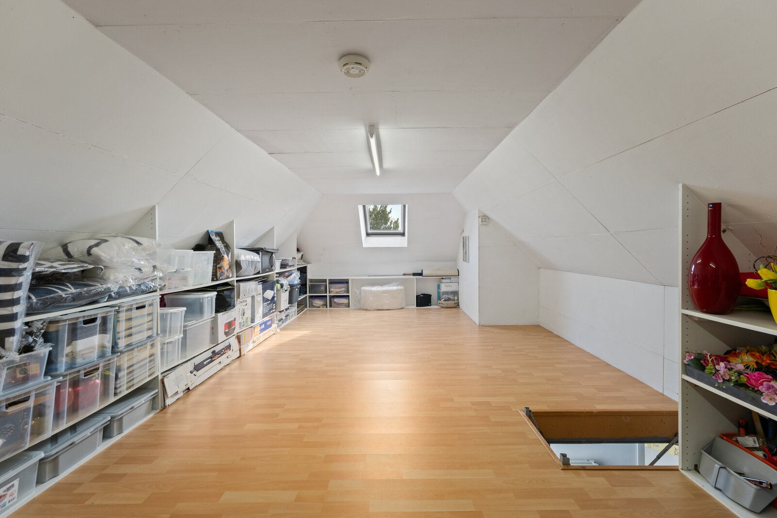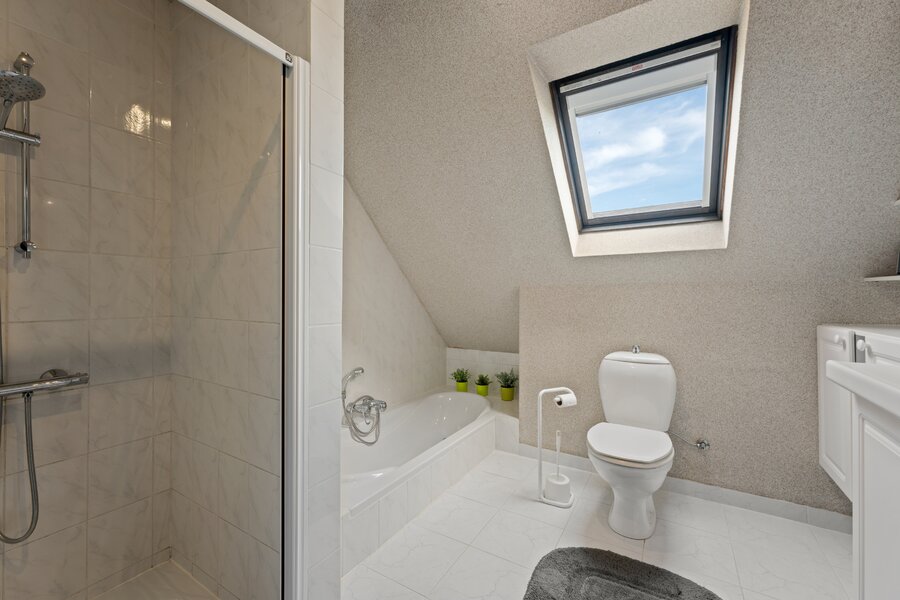 Op de eerste verdieping bevinden zich vier slaapkamers, waaronder een ruime master, en een badkamer met ligbad, douche en een badkamermeubel. De zolder voegt extra opbergruimte en flexibiliteit toe.