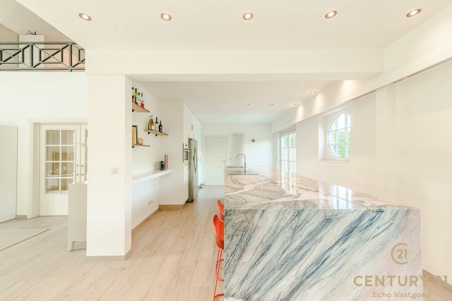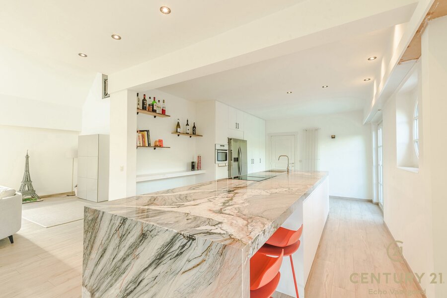 De volledig uitgeruste keuken sluit perfect aan op de woonkamer en is voorzien van alle hedendaagse comfort. In 2023 werd er bovendien een stijlvol keukeneiland in hoogwaardige natuursteen toegevoegd, wat zorgt voor extra werkruimte, een elegante uitstraling en een optimale kook- en leefbeleving. Aansluitend bevindt zich een praktische berging/wasplaats.