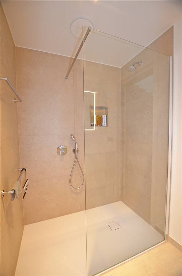 Via de nachthal bereiken we de masterbedroom, de douchekamer met verwarmde spiegel en een wasplaats met apart toilet.