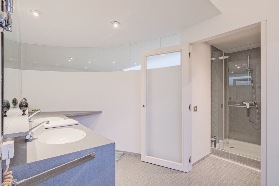 Op de eerste verdieping: Overloop, hoofdslaapkamer van circa 23 m² met een en-suite badkamer van 15 m² en een terras van circa 15 m² op het zuidwesten, drie extra slaapkamers van circa 18 m², 15 m² en 14 m², een terras van circa 12 m² op het oosten en twee extra badkamers.