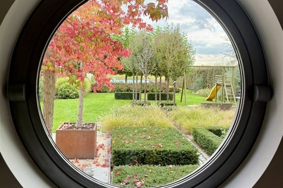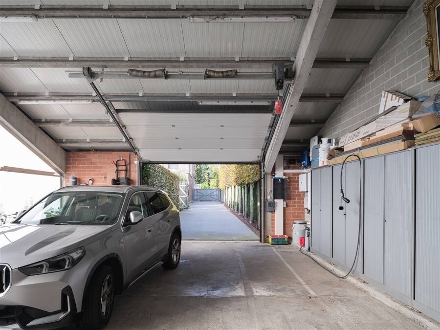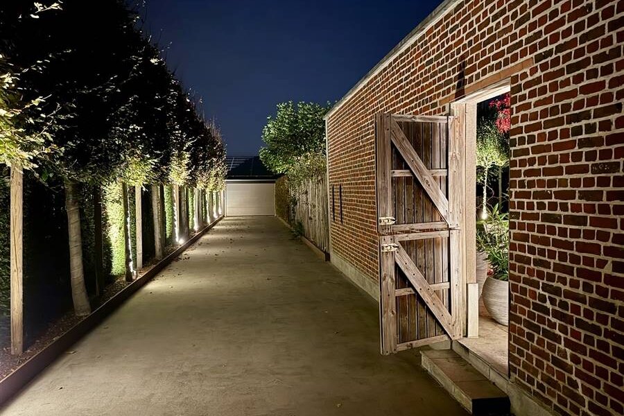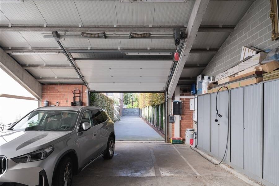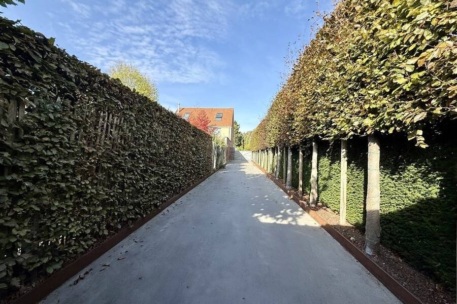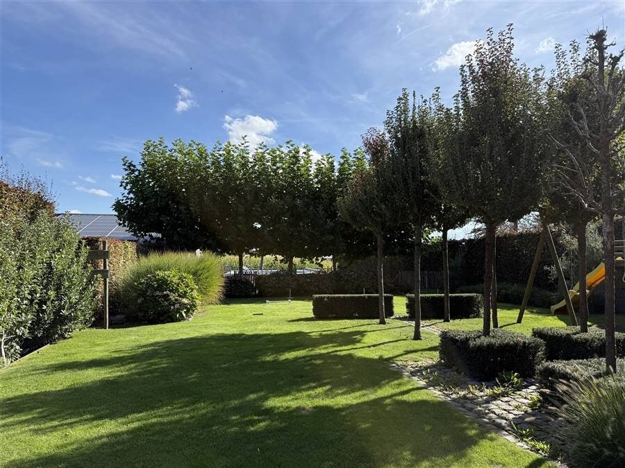 De volgroeide tuin met hoge hagen, (fruit)bomen en geometrische beplanting creëert een oase van rust en privacy. Achteraan ligt het zwembad met houten zonnedek, ideaal om te ontspannen of gasten te ontvangen.