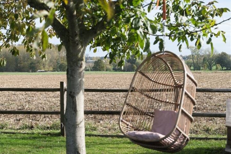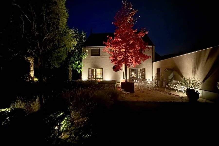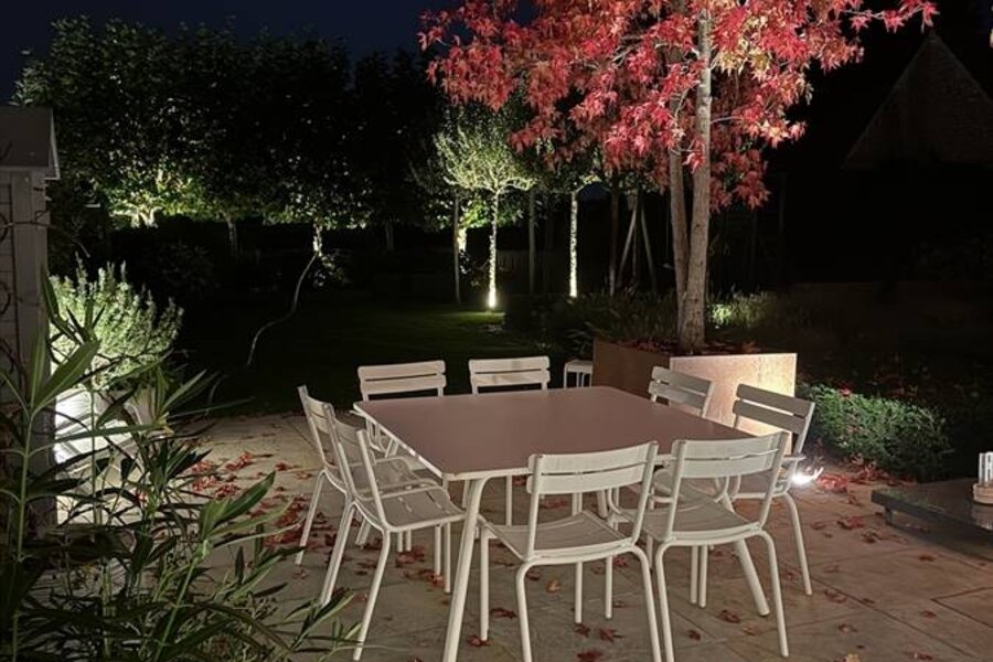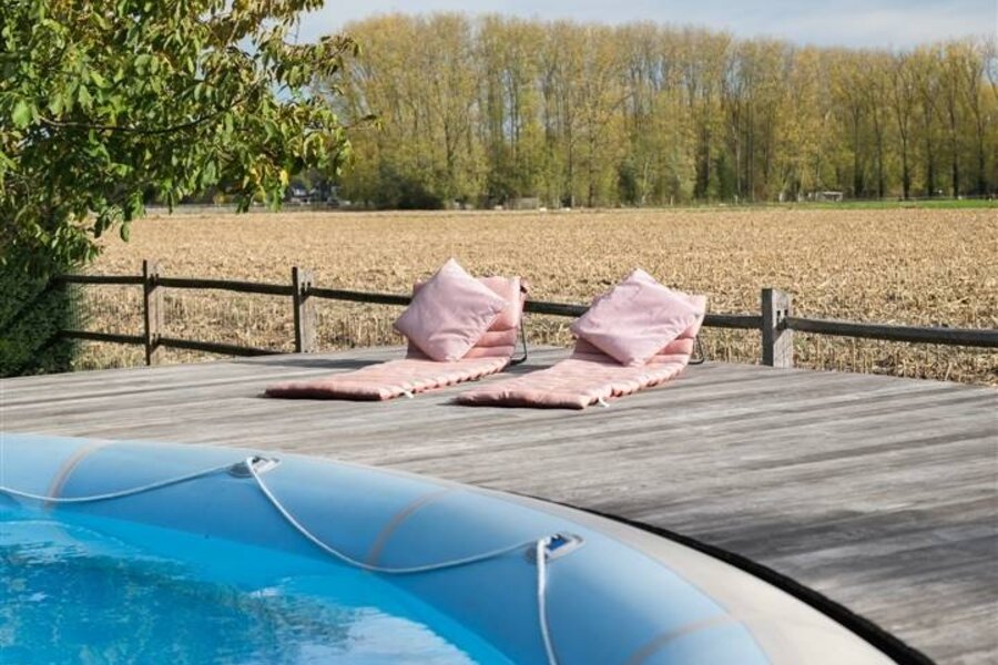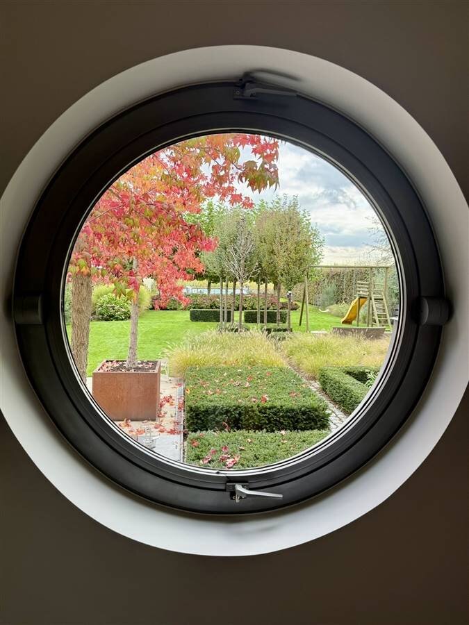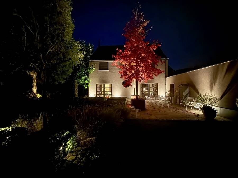 De volgroeide tuin met hoge hagen, (fruit)bomen en geometrische beplanting creëert een oase van rust en privacy. Achteraan ligt het zwembad met houten zonnedek, ideaal om te ontspannen of gasten te ontvangen.