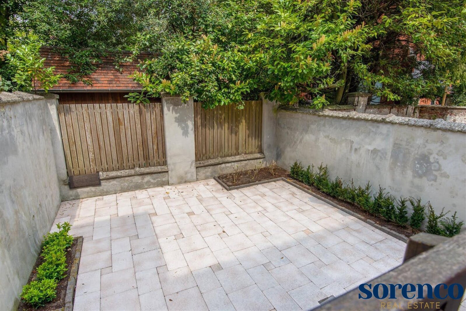 Via de inkomhal met mozaïekvloer komt u binnen in de lichtrijke woonkamer en eetruimte, beide voorzien van parket en een marmeren sierschouw. De volledig ingerichte keuken beschikt over opbergkasten en diverse toestellen, waaronder een 1,5 spoelbak, kookplaat, dampkap, koelkast, afwasmachine, magnetron en oven. Vanuit de leefruimte en keuken heeft u toegang tot het terras en de stadstuin. Daarnaast is er op de gelijkvloerse verdieping een apart toilet aanwezig.