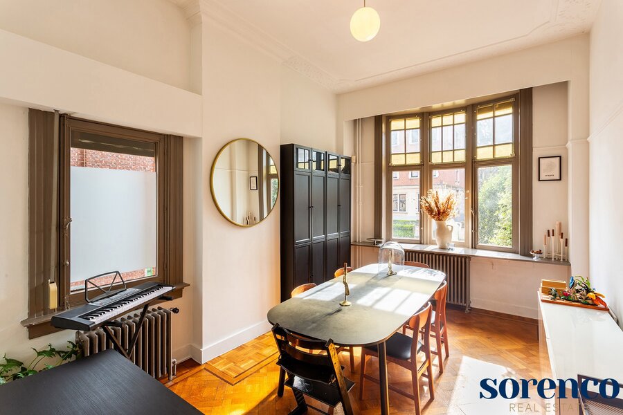 Tal van authentieke elementen zoals parketvloeren, mozaïek vloeren, originele schouwen en hoge plafonds.