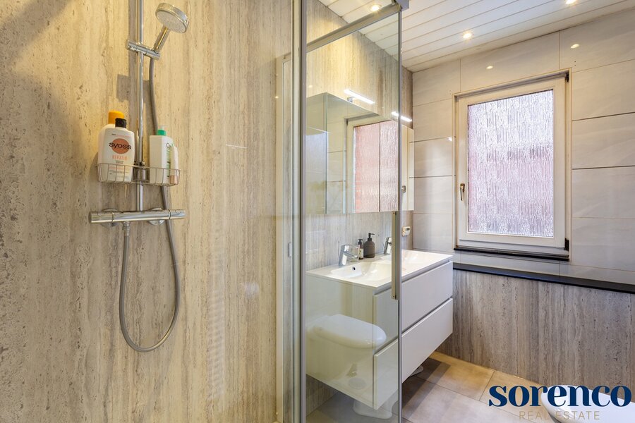 Ingerichte SOUTERRAIN met polyvalente ruimte/bureau, ideaal als thuiskantoor, hobbyruimte of ontspanningsruimte ca. 15m². Verder is er nog een apart toilet, een berging, een wasplaats, hal met ingebouwde kasten, en een technische ruimte/stookruimte. Deze verdieping geeft ook toegang tot de tuin.