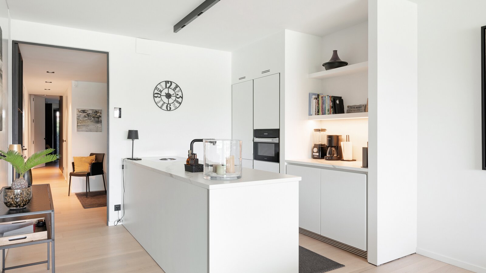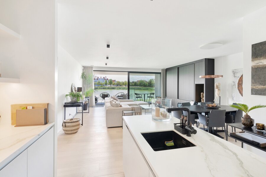 Vanuit de royale leefruimte met gezellige eethoek en groot salon kijkt u uit over het water. De volledig uitgeruste open keuken, voorzien van hoogwaardige apparatuur sluit hierop naadloos aan.