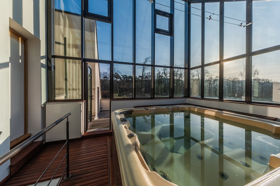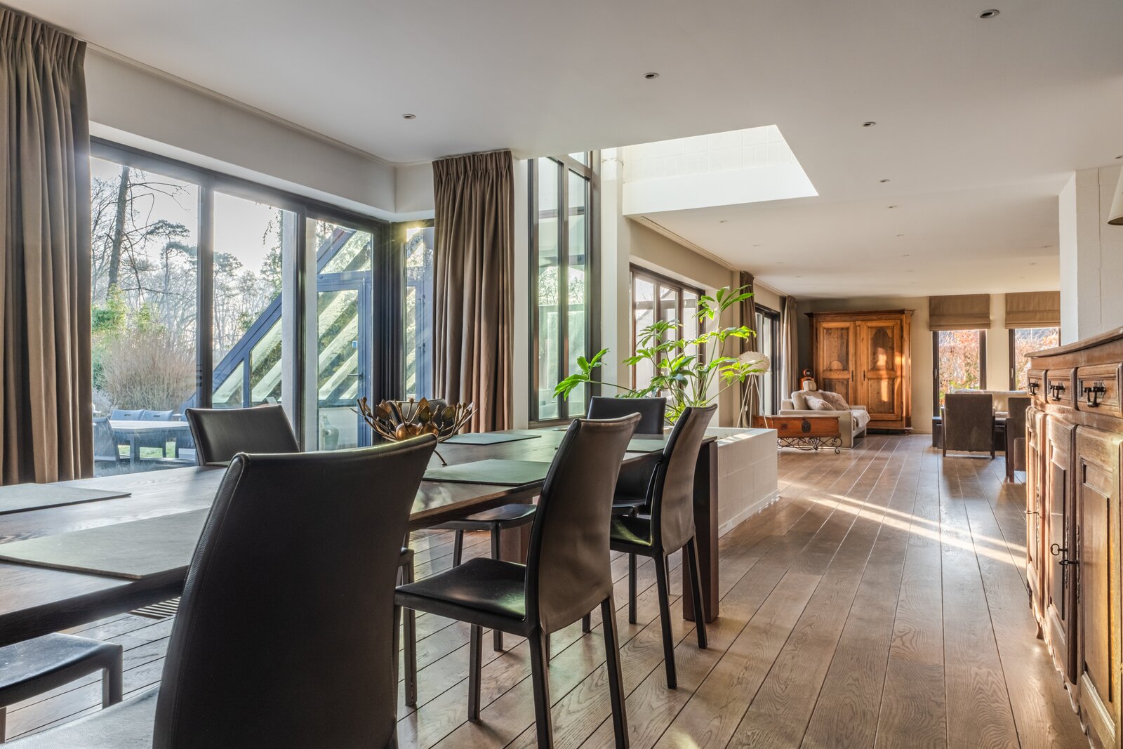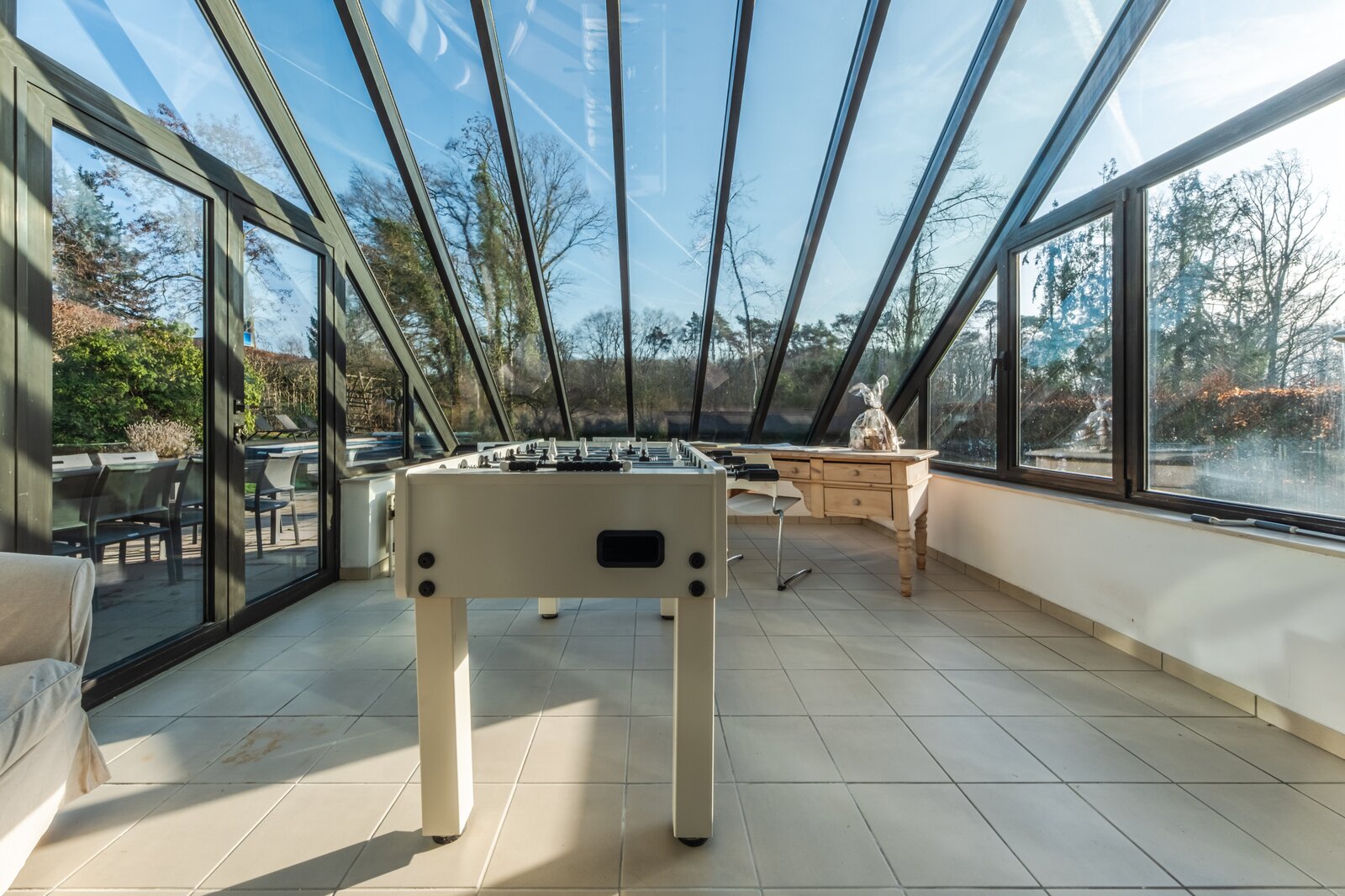 Een ruime woonkamer nodigt uit tot ontspanning en gezellig samenzijn, terwijl een groot bureau een comfortabele werkruimte biedt. Om dit uitzonderlijke eigendom compleet te maken, is er een volledig beglaasde wellnessruimte waar u in alle rust kan genieten met een prachtig uitzicht op de tuin. Ruime kelders vervolledigen het geheel, samen met een verwarmd buitenzwembad dat de zomerdagen veraangenaamt.