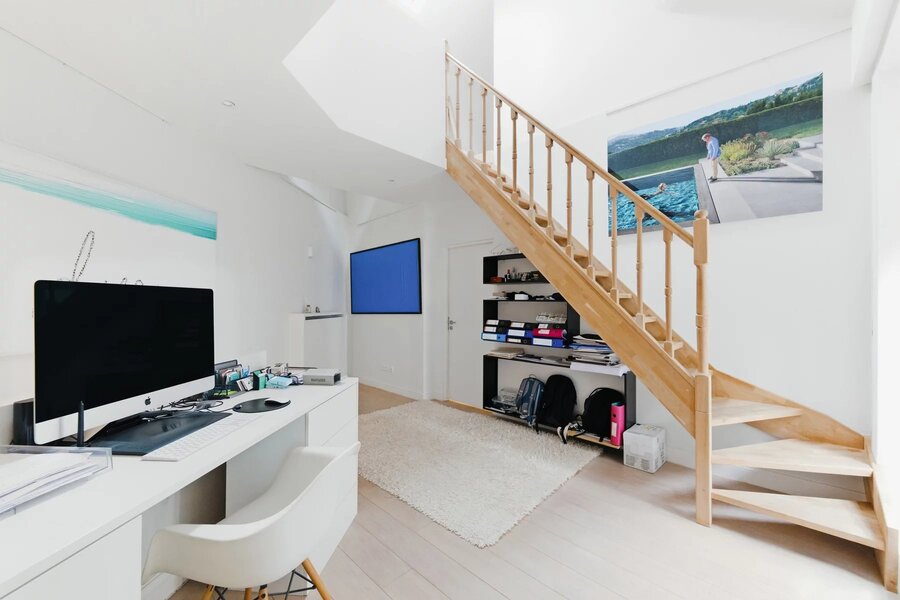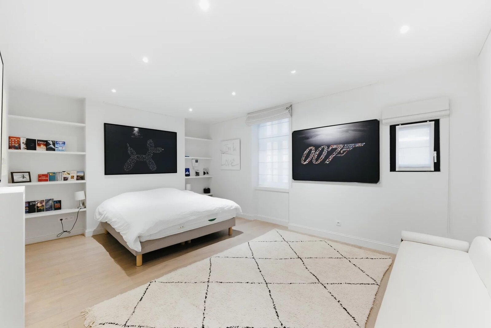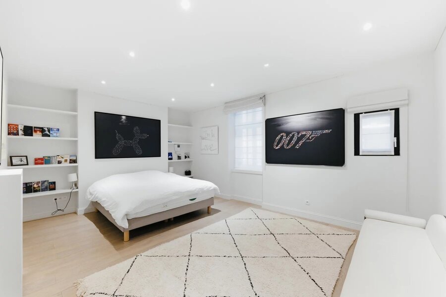 Op de eerste verdieping leidt een ruime overloop naar een master suite van ±40 m² met aangrenzende badkamer, een tweede slaapkamer van ±14 m² die momenteel is ingericht als ruime kleedkamer, eveneens met eigen badkamer, en een apart toilet.