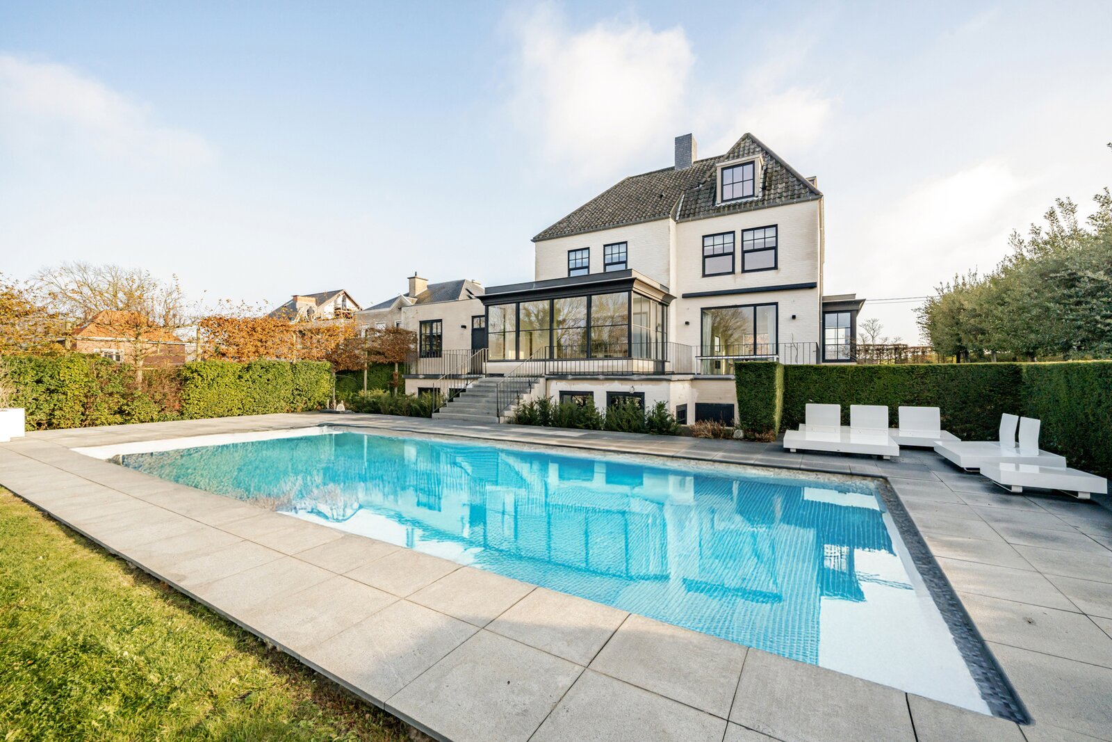 Ook buiten is het puur genieten: de aangelegde tuin met terras en zwembad vormt een waar paradijs voor ontspanning en gezelligheid, met opnieuw dat prachtige panoramische uitzicht.