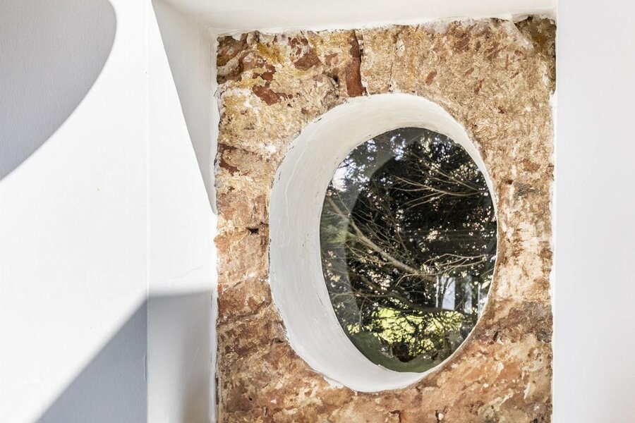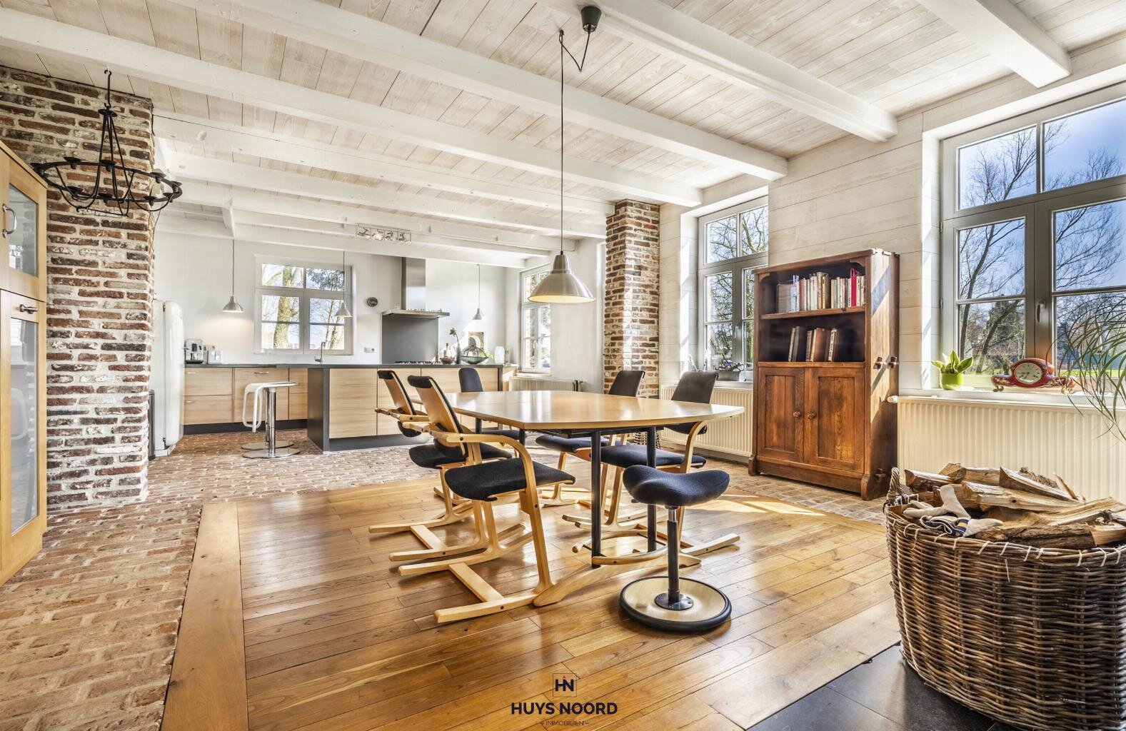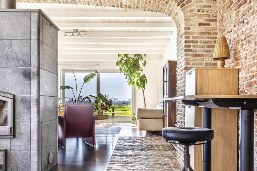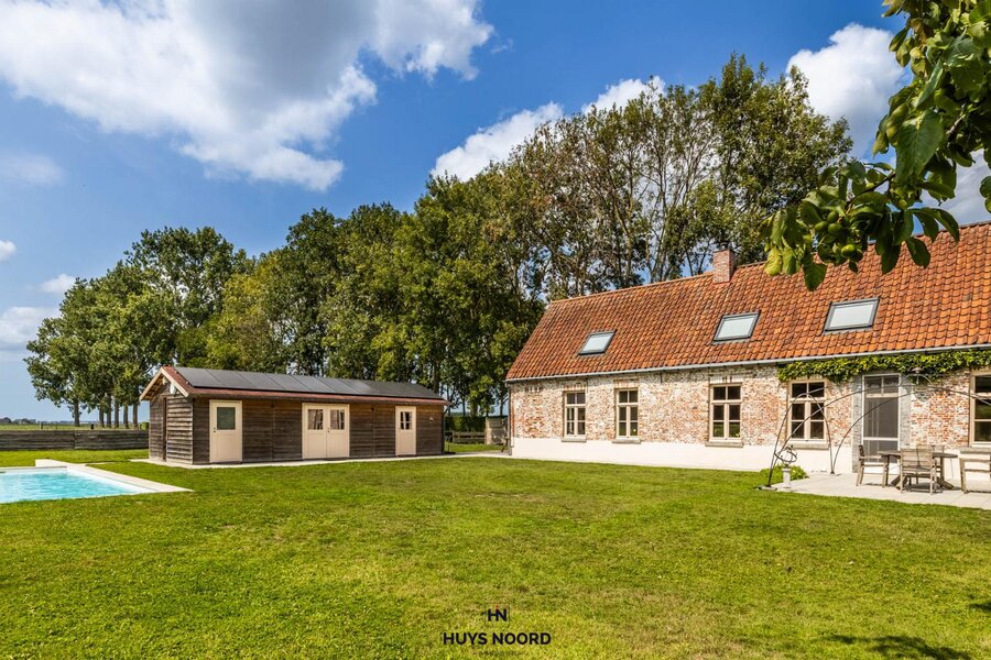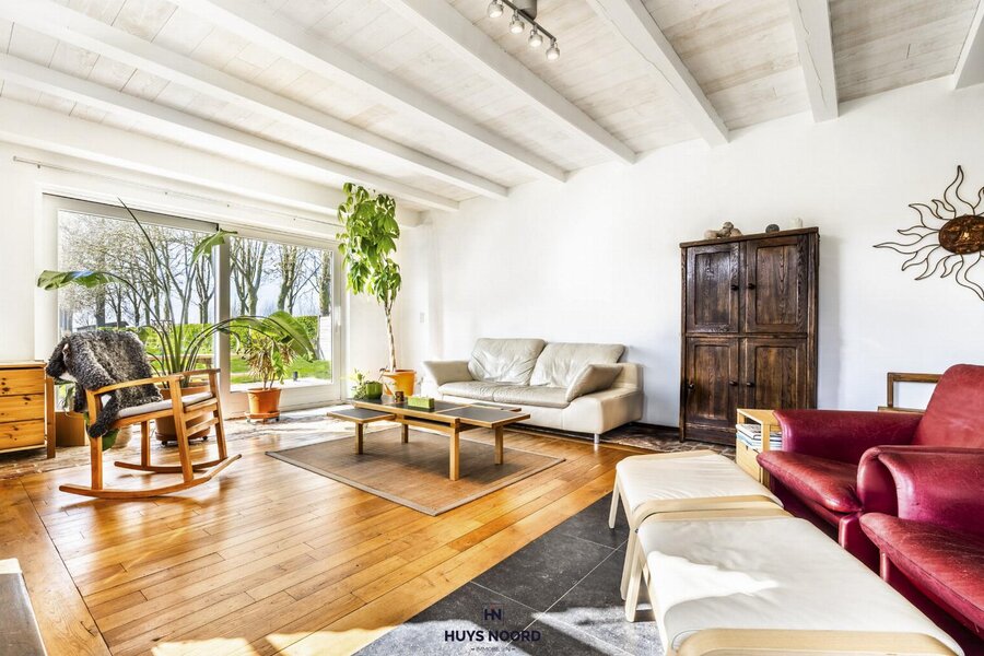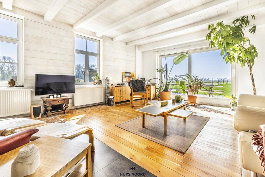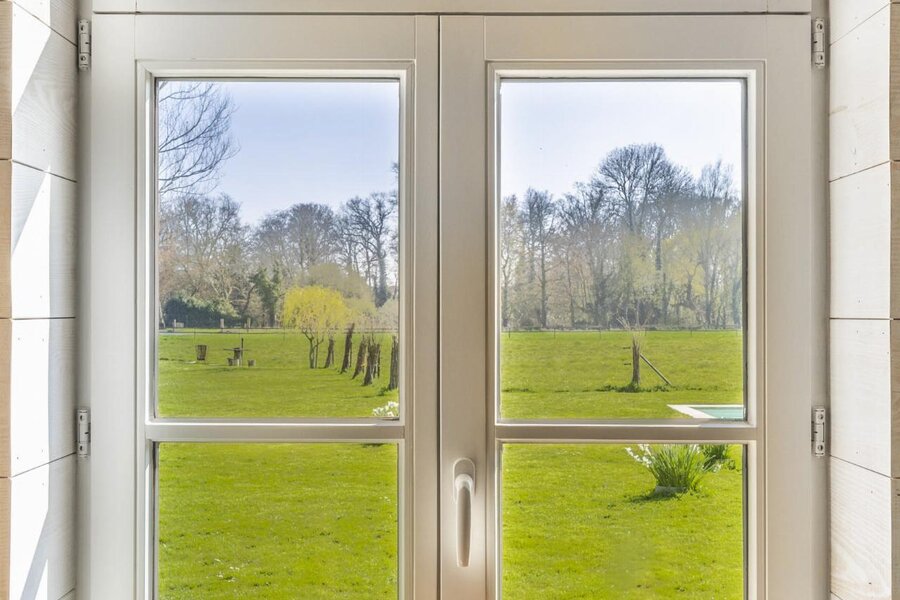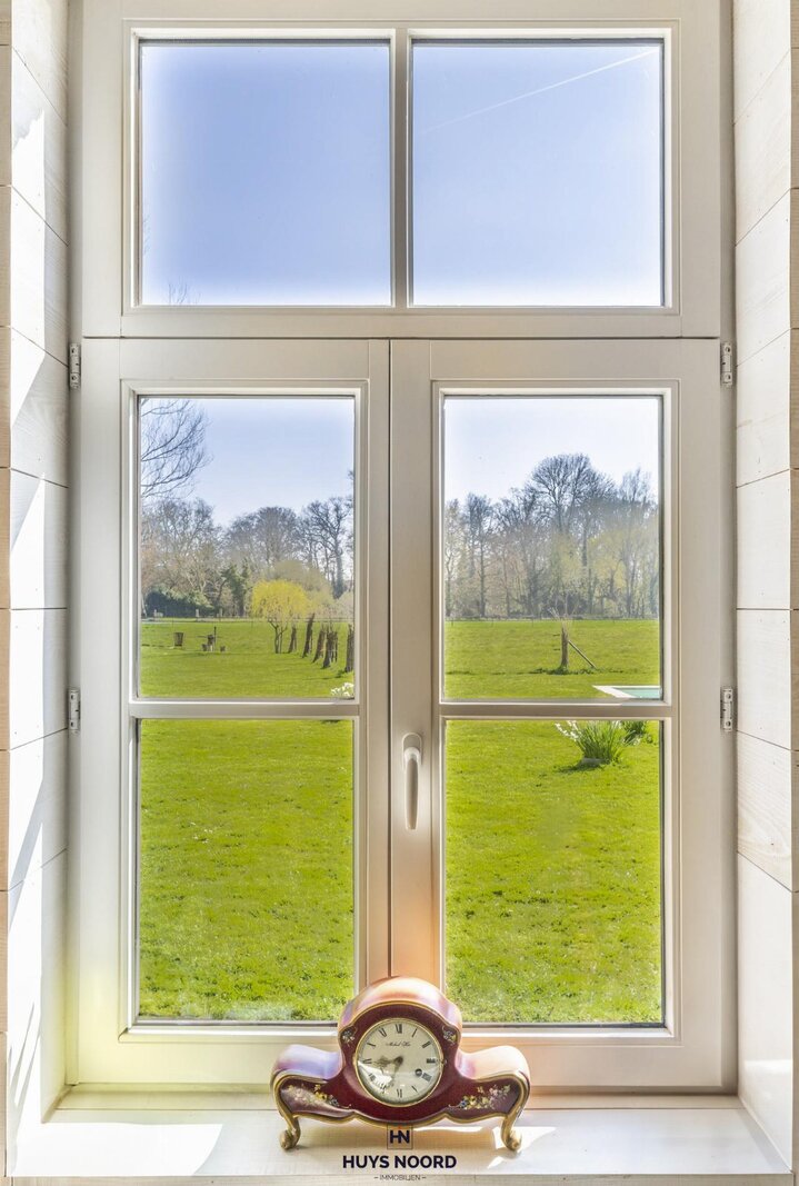 De grote raampartijen bieden een uniek zicht over de aangelegde tuin, weides en Sint-Annapolder.