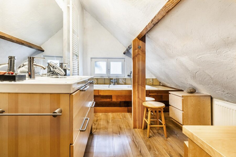 Een eerste verdiep beschikt over een master-slaapkamer en twee, achtereen gelegen, ruimtes die momenteel dienst doen als slaapkamers en/of polyvalente ruimtes.