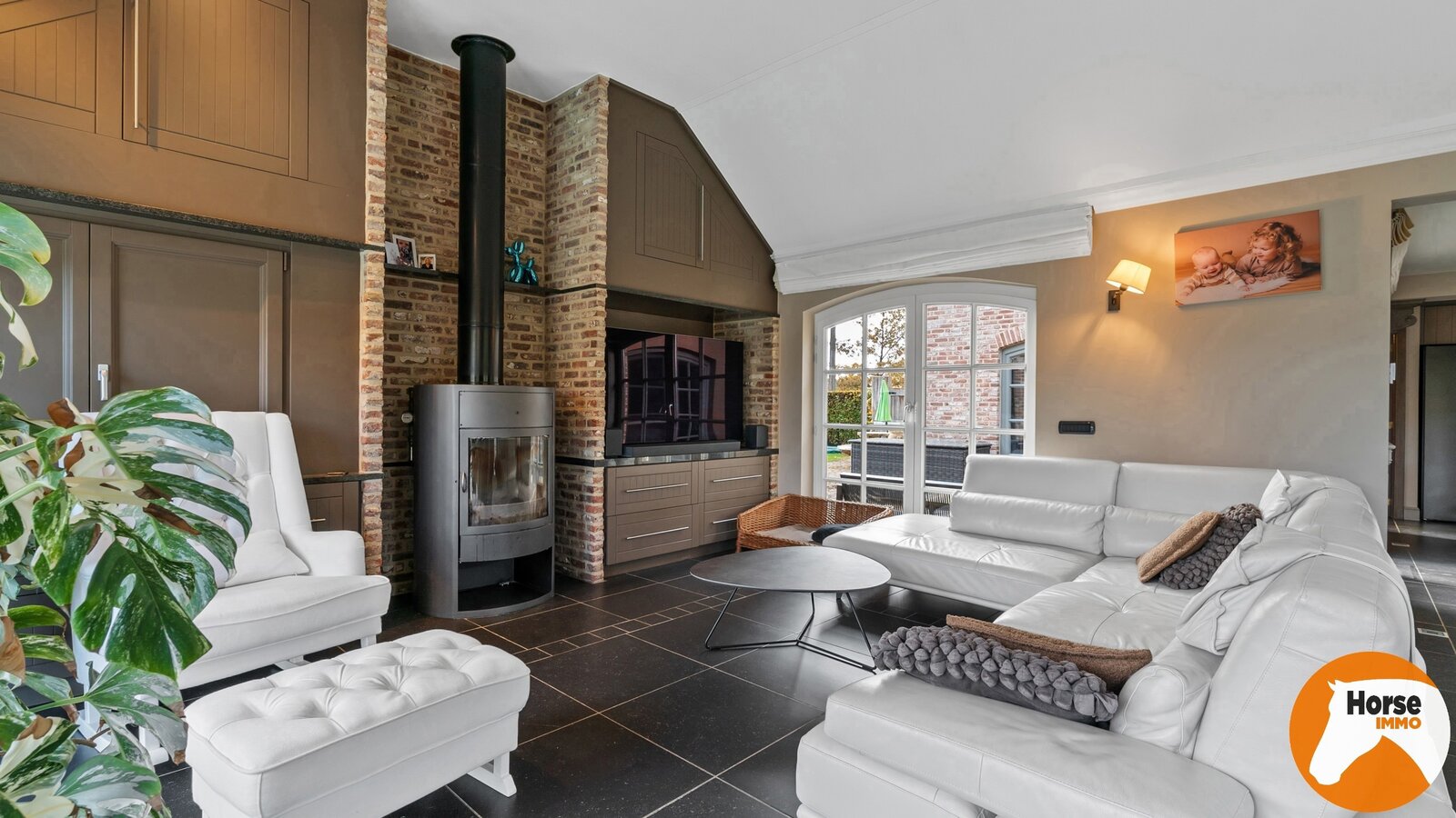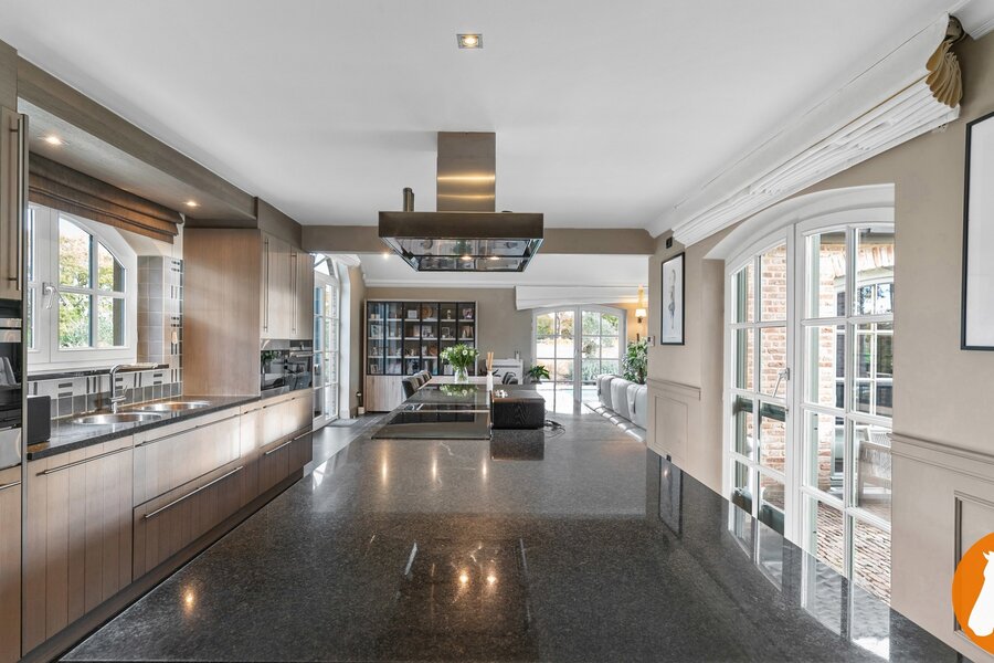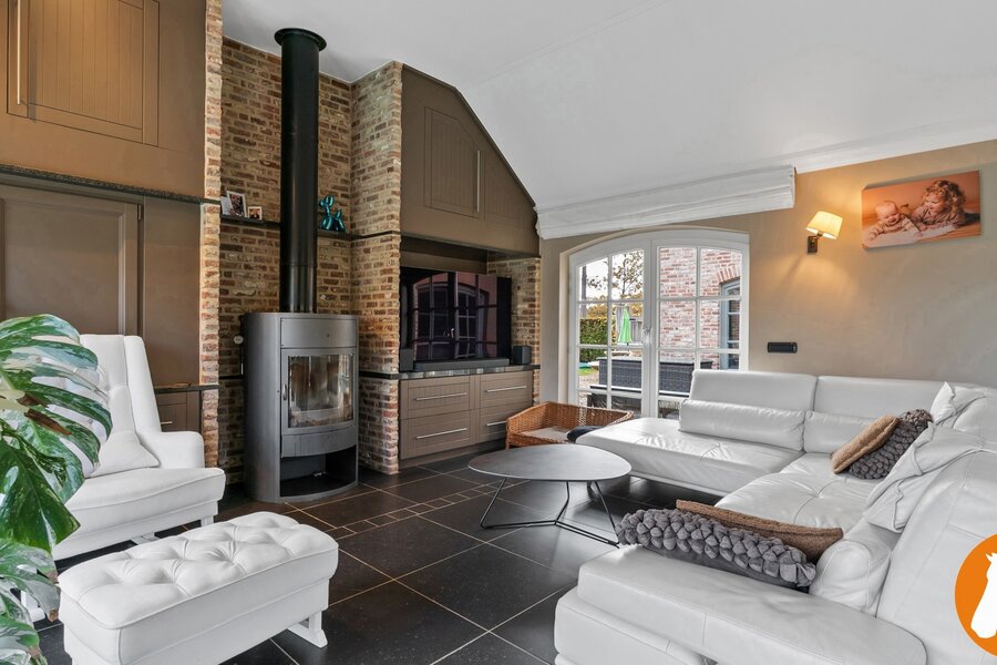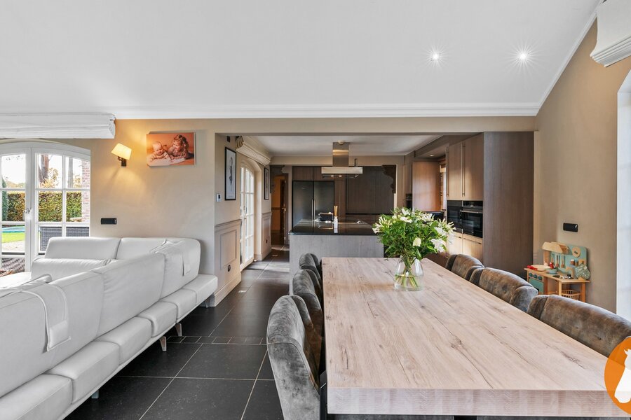 De lichte en ruime living vormt samen met de open keuken het hart van de woning. Grote raampartijen zorgen voor een overvloed aan natuurlijk licht en bieden een prachtig uitzicht op de fraai aangelegde tuin en het zwembad. De living straalt warmte en elegantie uit dankzij de stijlvolle tegelvloer, maatwerkkasten en gezellige houtkachel.