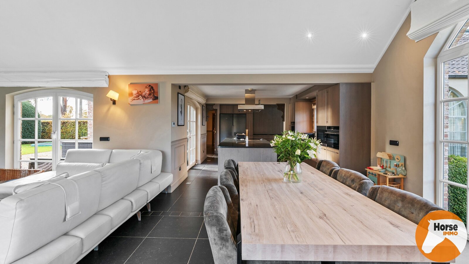 De open keuken combineert functionaliteit met een tijdloze uitstraling en is uitgerust met kwalitatieve inbouwtoestellen en een royaal kookeiland met natuurstenen werkblad.