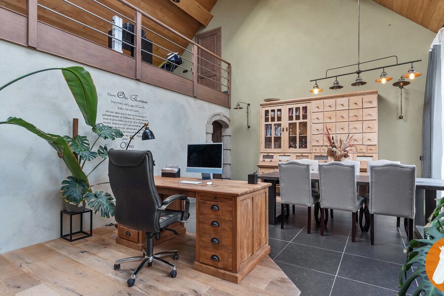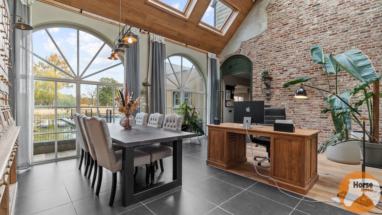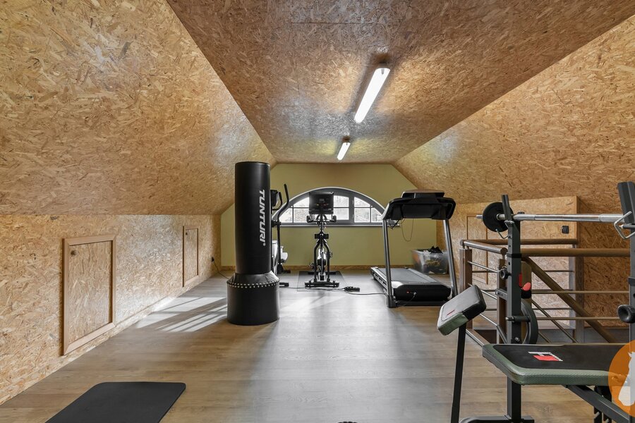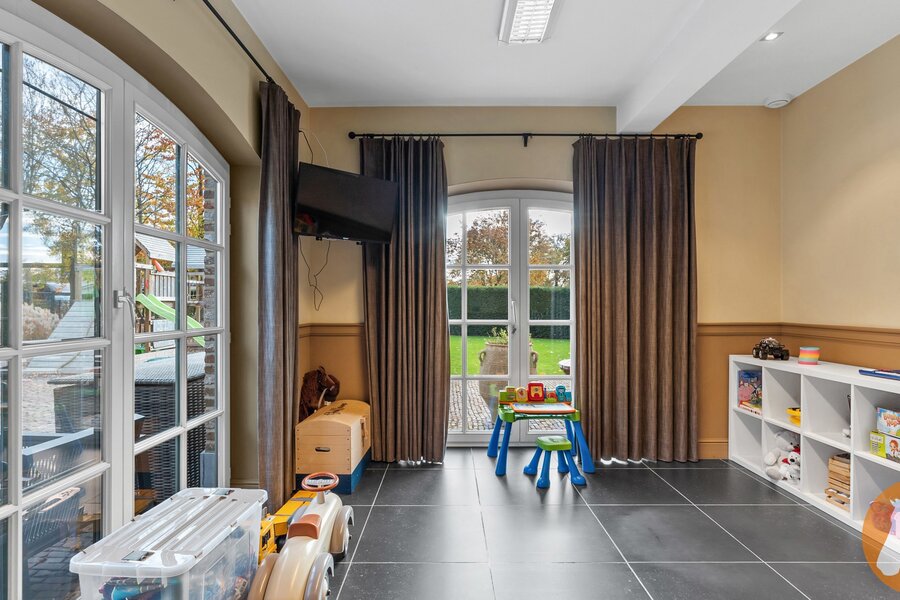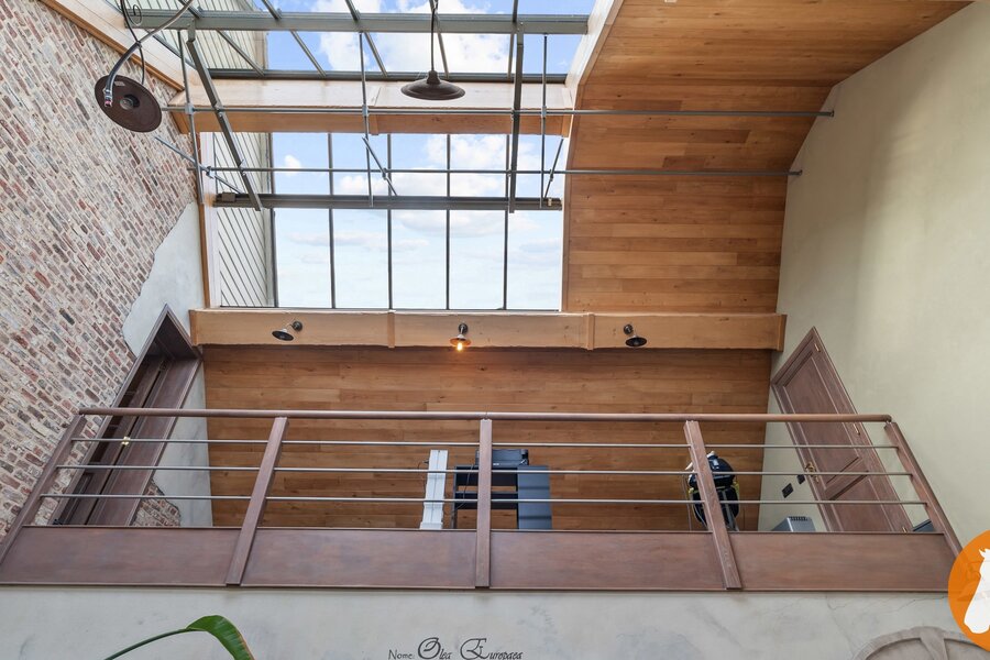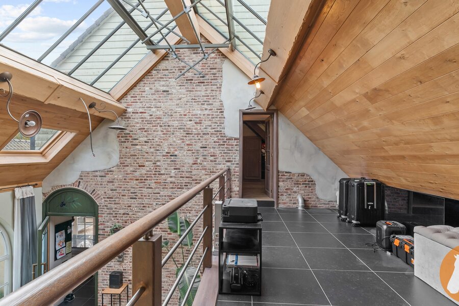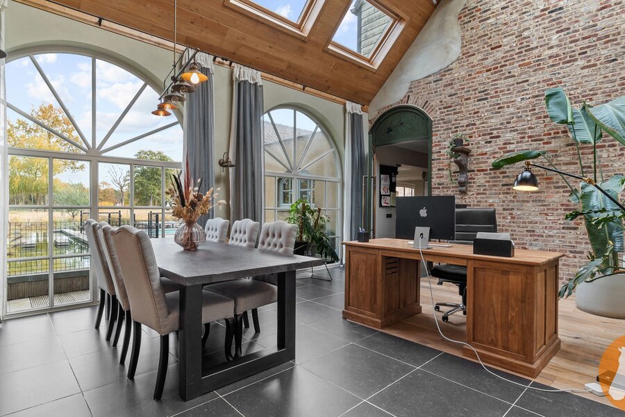 De karaktervolle orangerie is een echte blikvanger. Met haar elegante vensters, hoge plafonds en authentieke bakstenen muren baadt deze ruimte in het licht en geniet u van een prachtig uitzicht op de tuin. De ruimte leent zich bovendien uitstekend als stijlvol thuiskantoor en biedt zicht op de mezzanine, wat het open karakter extra benadrukt.