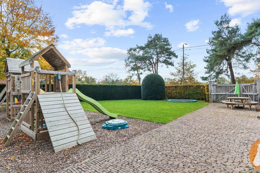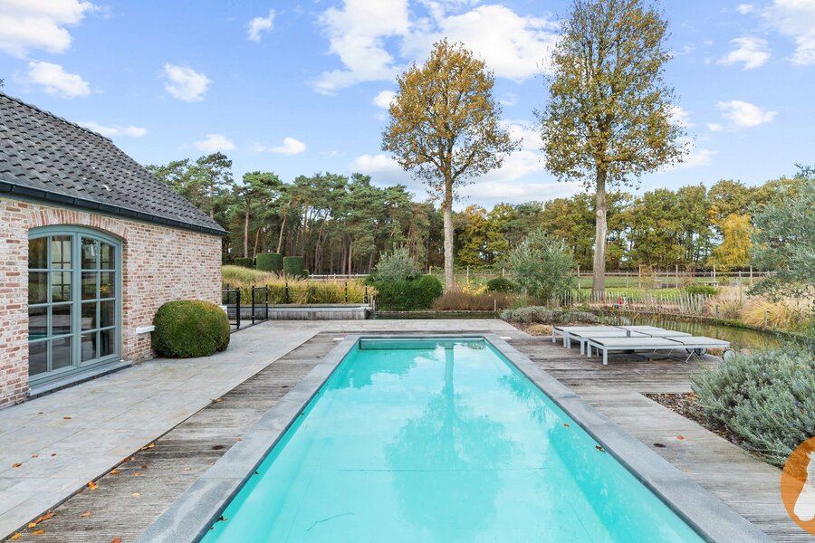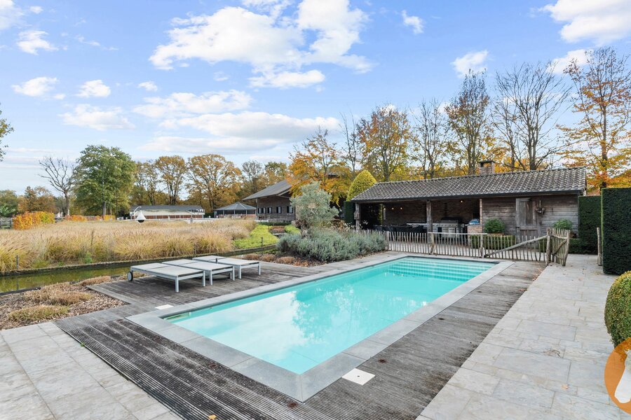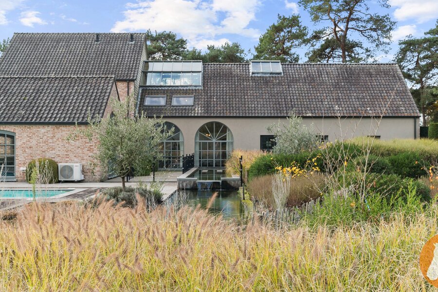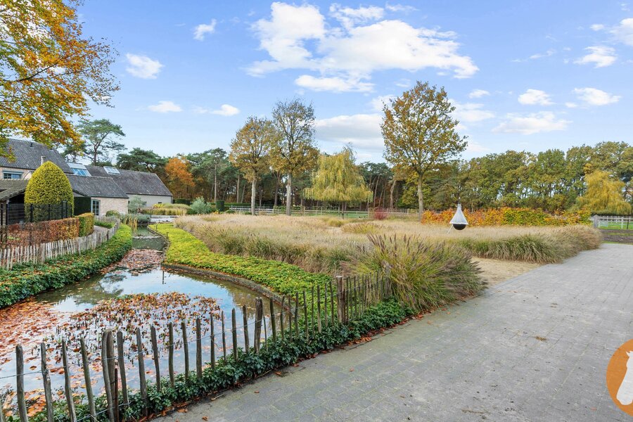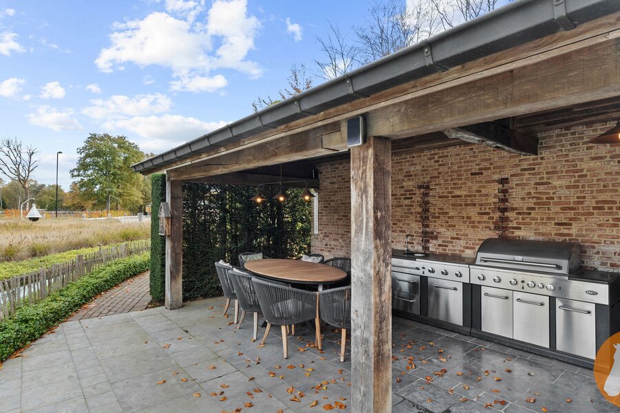 De fraai aangelegde tuin vormt een oase van rust en privacy. Het zwembad met zonneterras nodigt uit tot ontspanning, terwijl de overdekte buitenruimte met volledig uitgeruste buitenkeuken ideaal is voor gezellige momenten met familie en vrienden. De vijverpartij versterkt de natuurlijke charme van het domein.