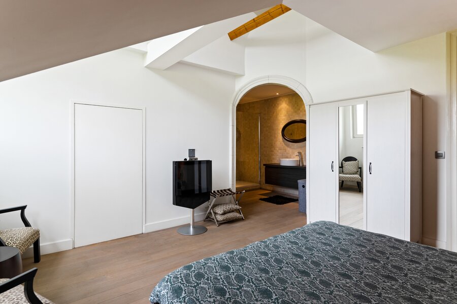 Op de eerste verdieping bevindt zich de indrukwekkende masterbedroom, met een prachtige houten vloer en karakteristieke pilaren, die uitkijkt over de Leien. Aansluitend een ruime tussenkamer met airconditioning en een en-suite badkamer die luxe ademt, voorzien van een inloopdouche, een ligbad en design wastafels.