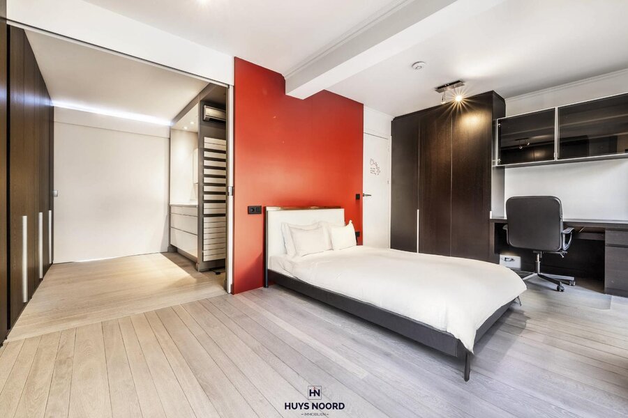 De tweede ruime slaapkamer geniet zeer veel maatwerk kasten, bureaumeubel en badkamer met enkel wastafelmeubel en inloop regendouche.