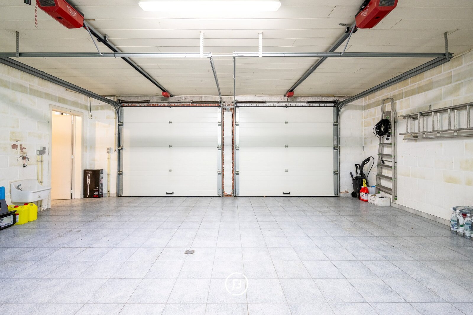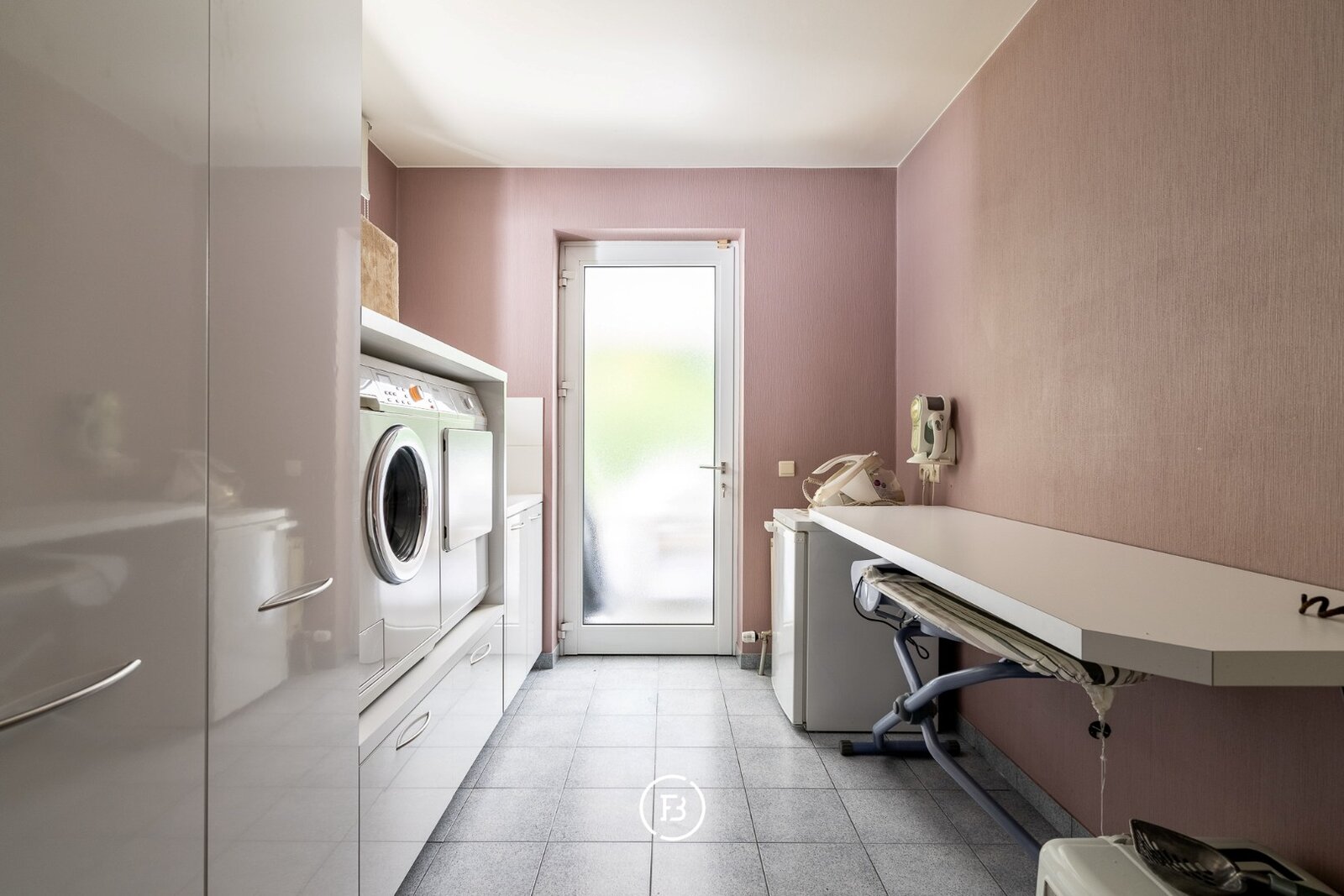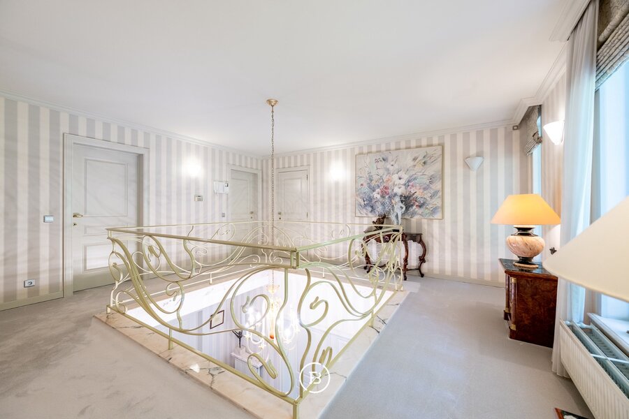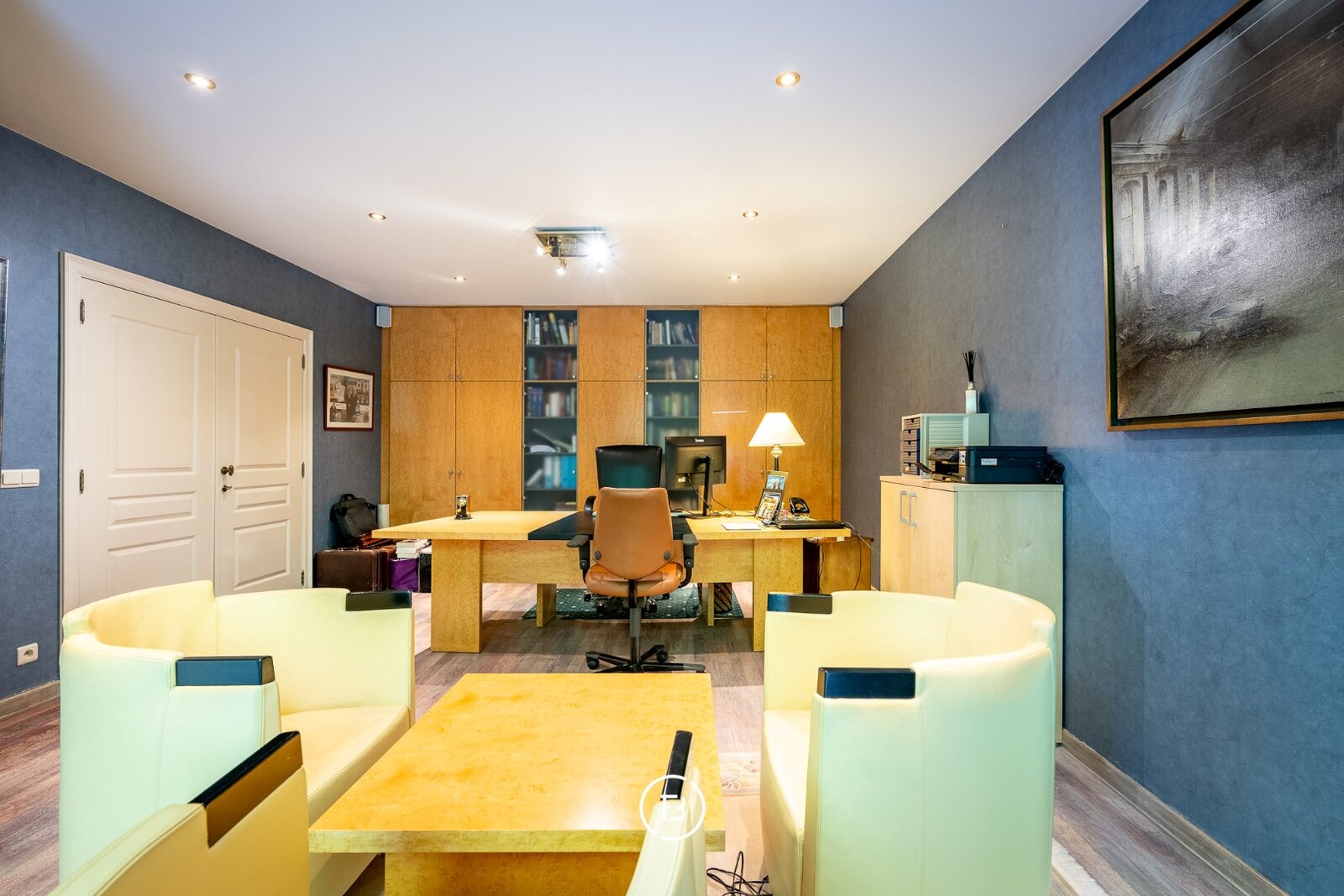 Via de royale inkomhal met gastentoilet en vestiaire komt u binnen in een sfeervol geheel. Op de gelijkvloerse verdieping bevindt zich een ruime bureauruimte die tal van mogelijkheden biedt, een lichtrijke eetkamer, een gezellige woonkamer en een aparte zithoek die uitkijkt op de tuin. De keuken sluit hier mooi bij aan en geeft rechtstreeks toegang tot het overdekte terras. Daarnaast zijn er een praktische wasplaats met douche, een extra berging en drie inpandige garages aanwezig.