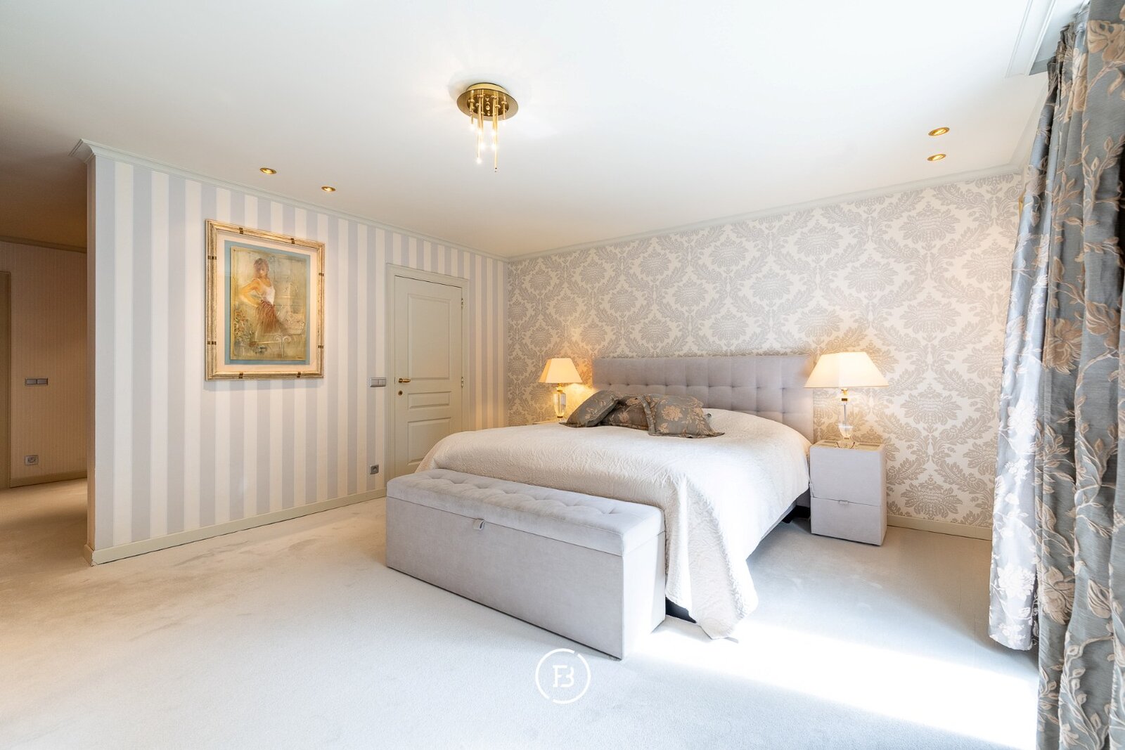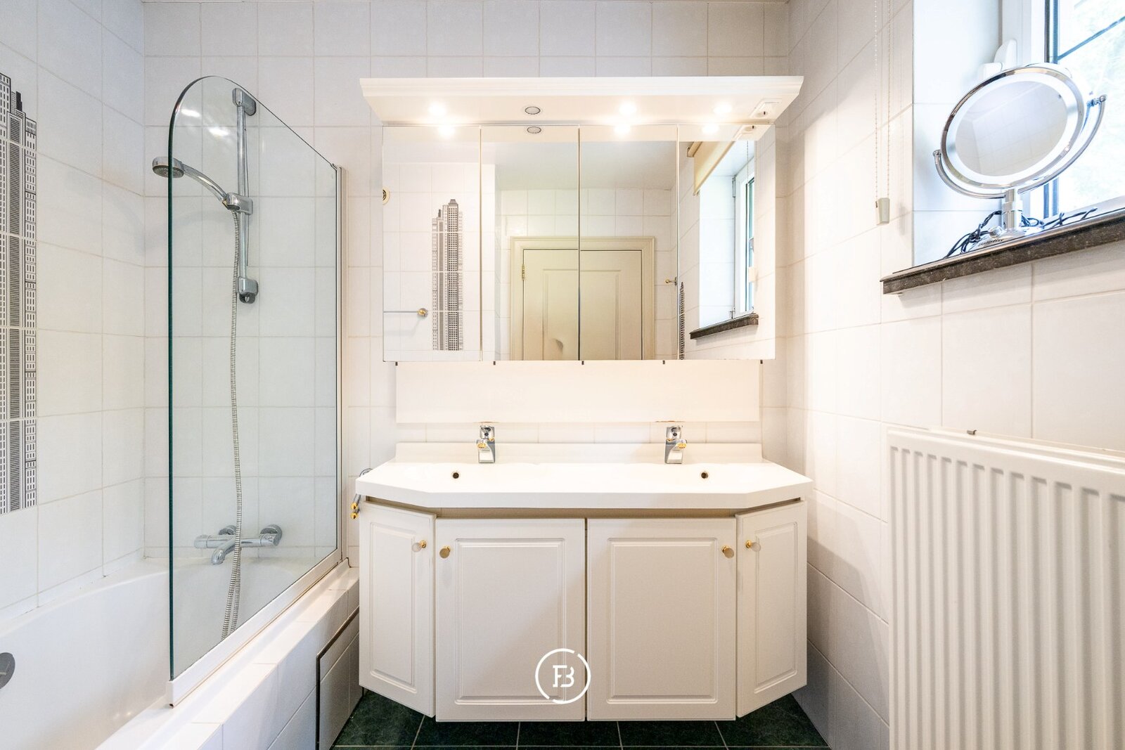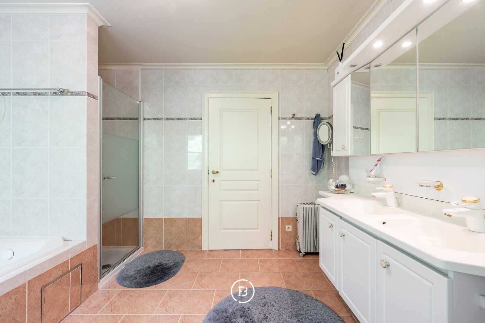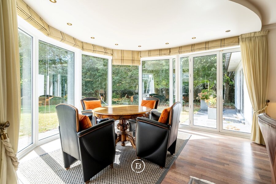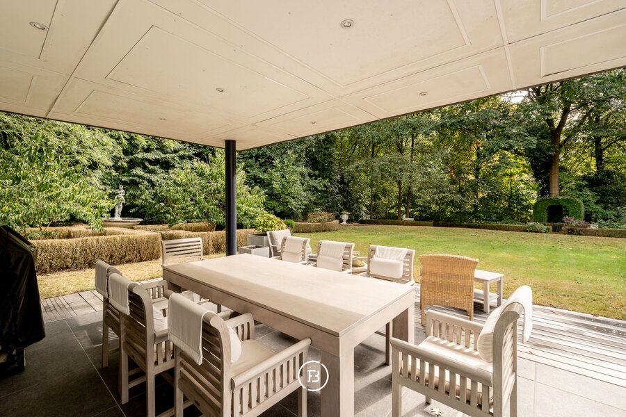 Via de royale inkomhal met gastentoilet en vestiaire komt u binnen in een sfeervol geheel. Op de gelijkvloerse verdieping bevindt zich een ruime bureauruimte die tal van mogelijkheden biedt, een lichtrijke eetkamer, een gezellige woonkamer en een aparte zithoek die uitkijkt op de tuin. De keuken sluit hier mooi bij aan en geeft rechtstreeks toegang tot het overdekte terras. Daarnaast zijn er een praktische wasplaats met douche, een extra berging en drie inpandige garages aanwezig.