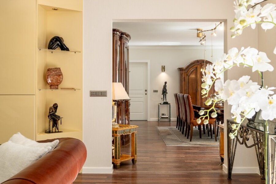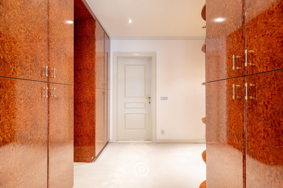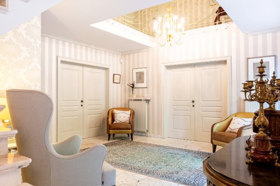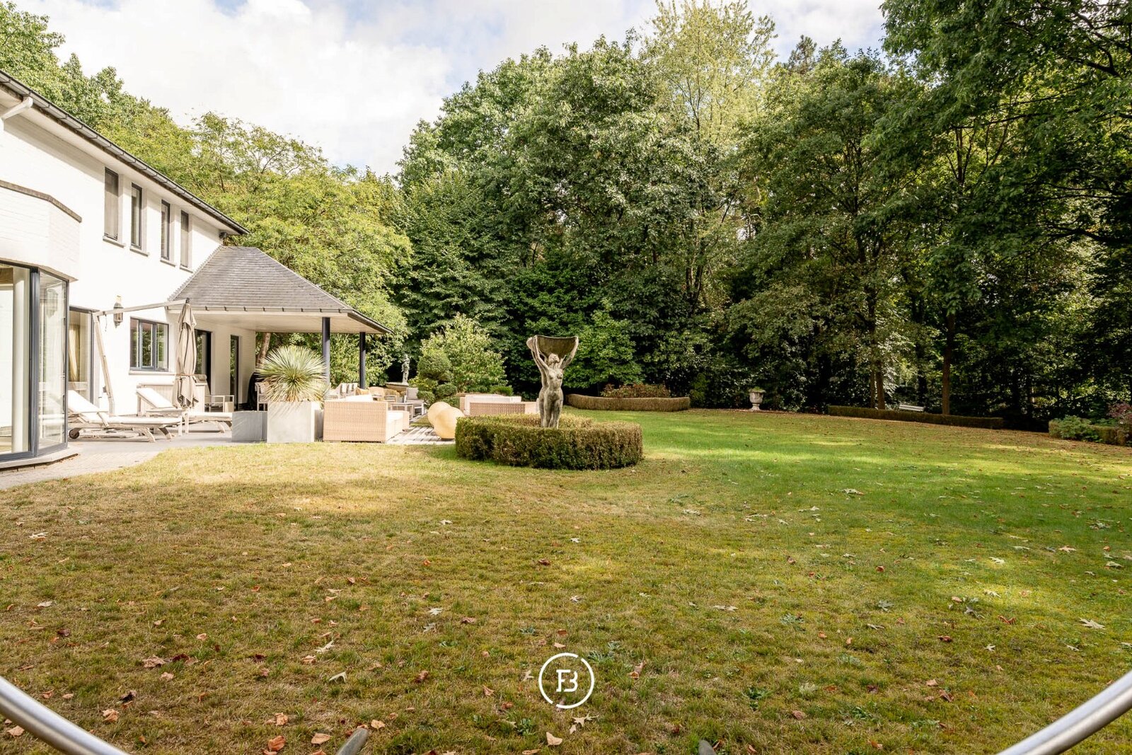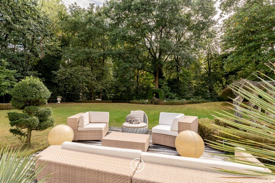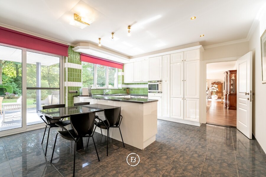 Via de royale inkomhal met gastentoilet en vestiaire komt u binnen in een sfeervol geheel. Op de gelijkvloerse verdieping bevindt zich een ruime bureauruimte die tal van mogelijkheden biedt, een lichtrijke eetkamer, een gezellige woonkamer en een aparte zithoek die uitkijkt op de tuin. De keuken sluit hier mooi bij aan en geeft rechtstreeks toegang tot het overdekte terras. Daarnaast zijn er een praktische wasplaats met douche, een extra berging en drie inpandige garages aanwezig.