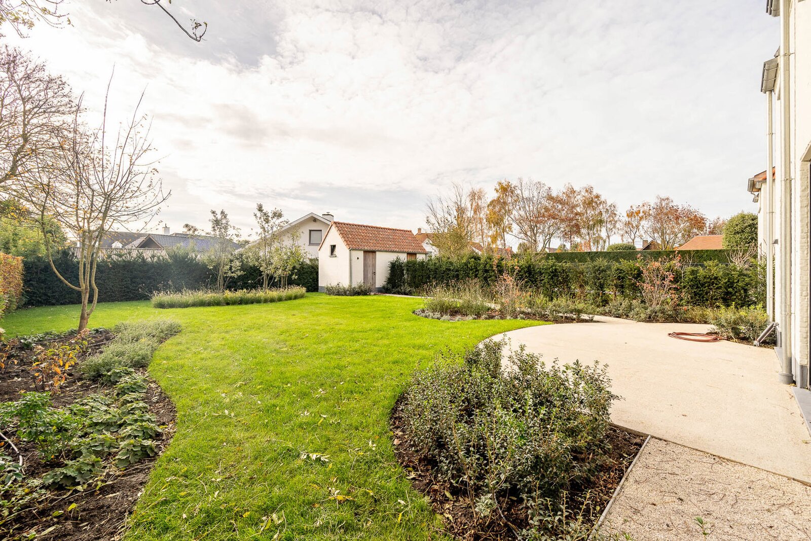 De inkomhal met vestiaire en gastentoilet geeft toegang tot een ruime leefruimte, badend in natuurlijk licht. De eetkamer opent uit op een groot terras en een zonnige tuin.
