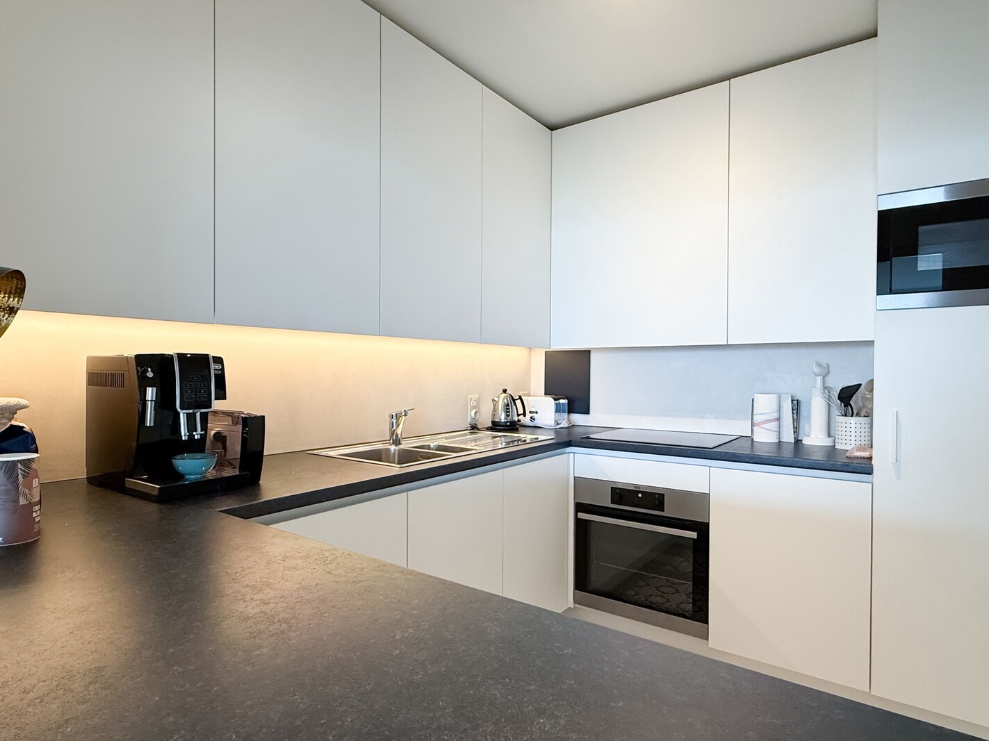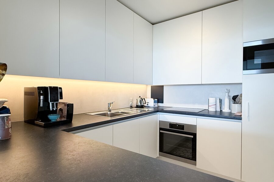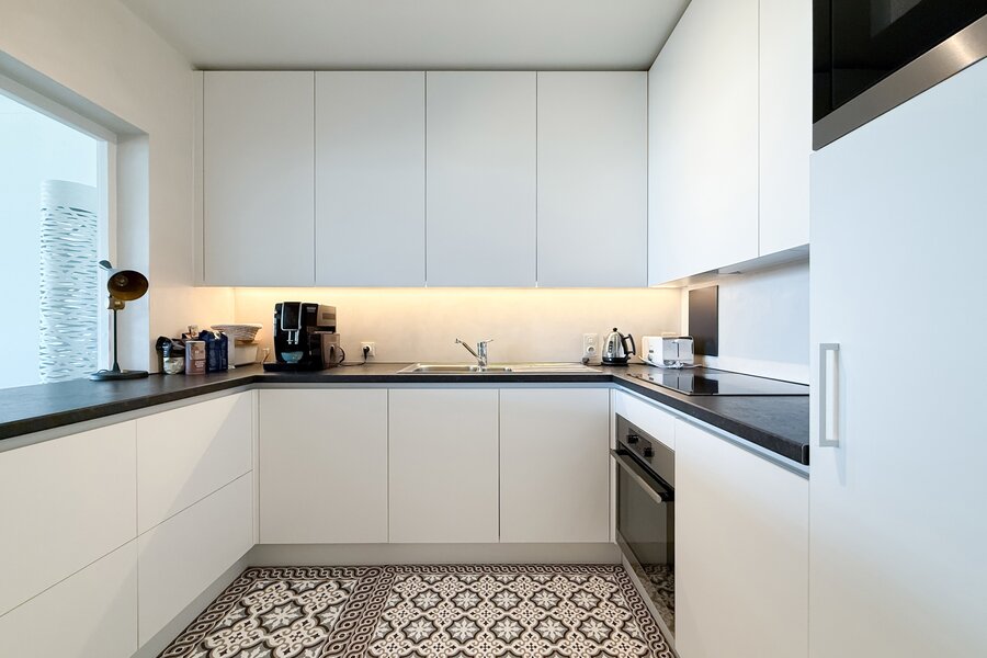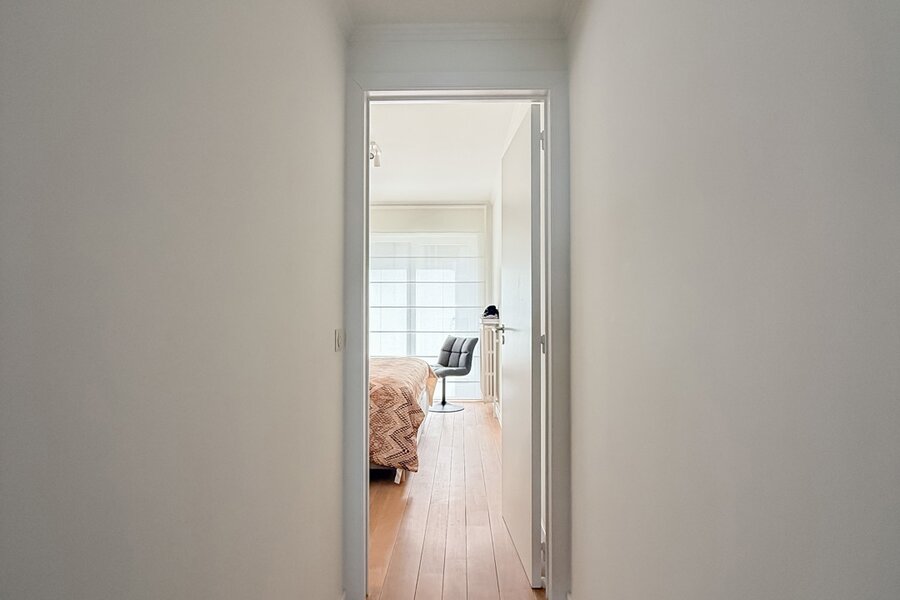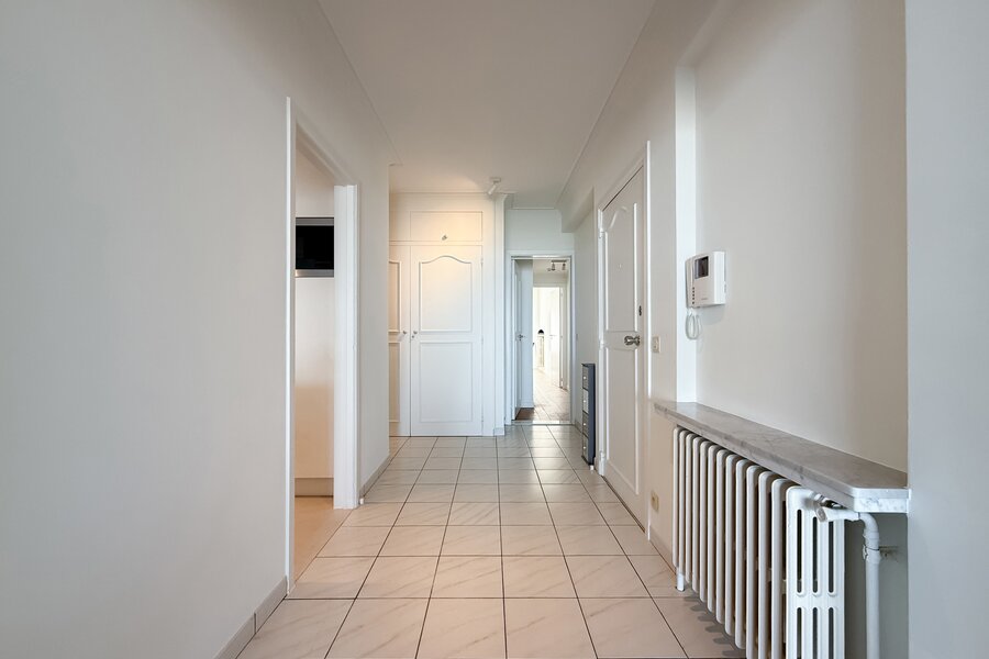 De ruime inkomhal met vestiaire en gastentoilet leidt naar de lichtrijke woonkamer met parketvloer, die uitgeeft op een royaal terras over de volledige gevelbreedte. Hier geniet u in alle seizoenen van een prachtig panoramisch uitzicht op zee. De halfopen keuken is volledig uitgerust met kwaliteitsvolle toestellen en wordt aangevuld met een praktische berging.