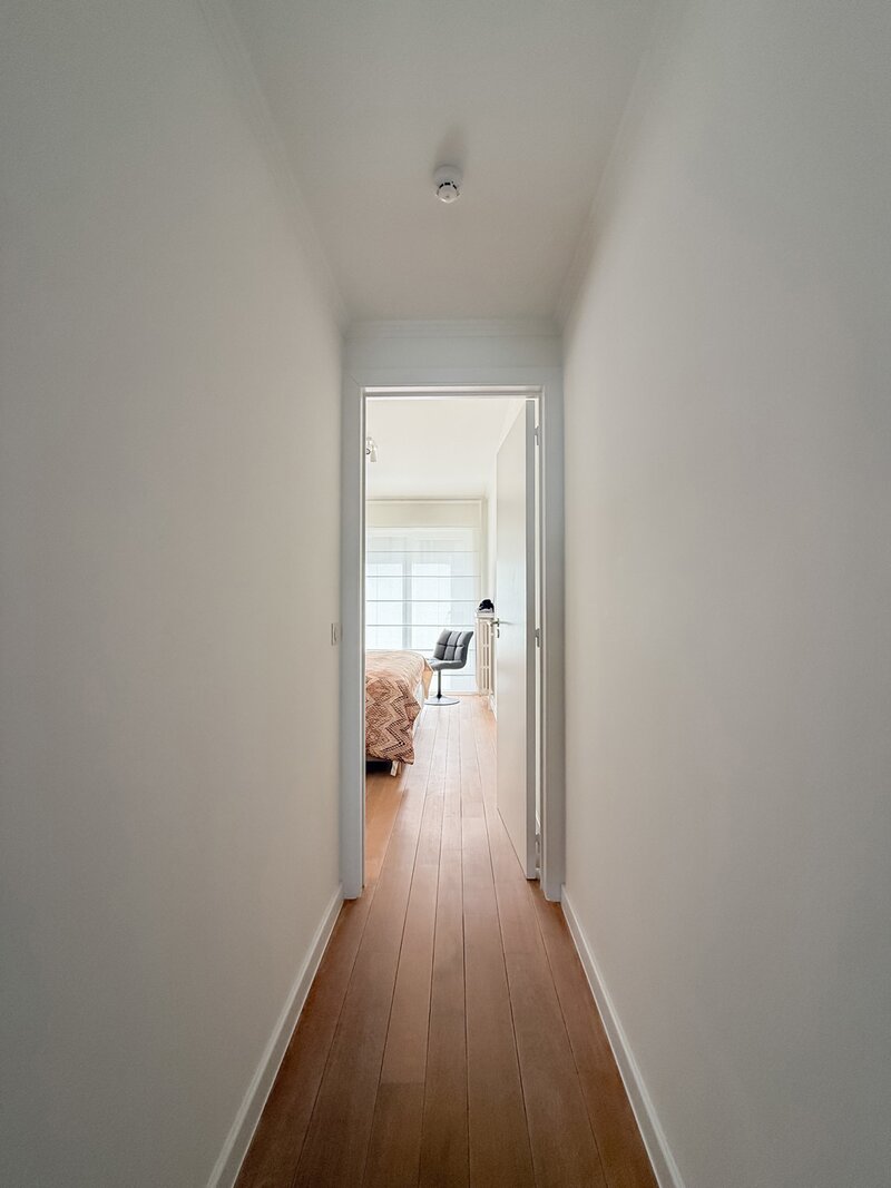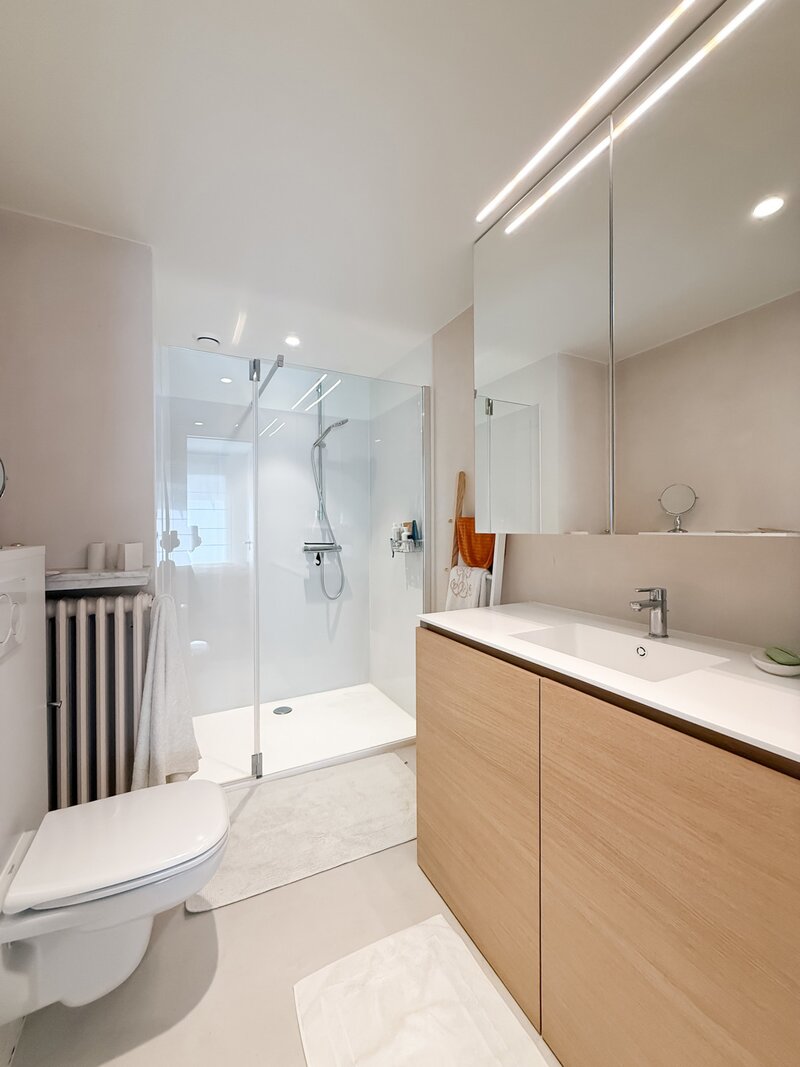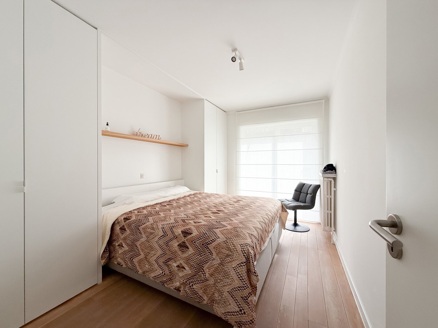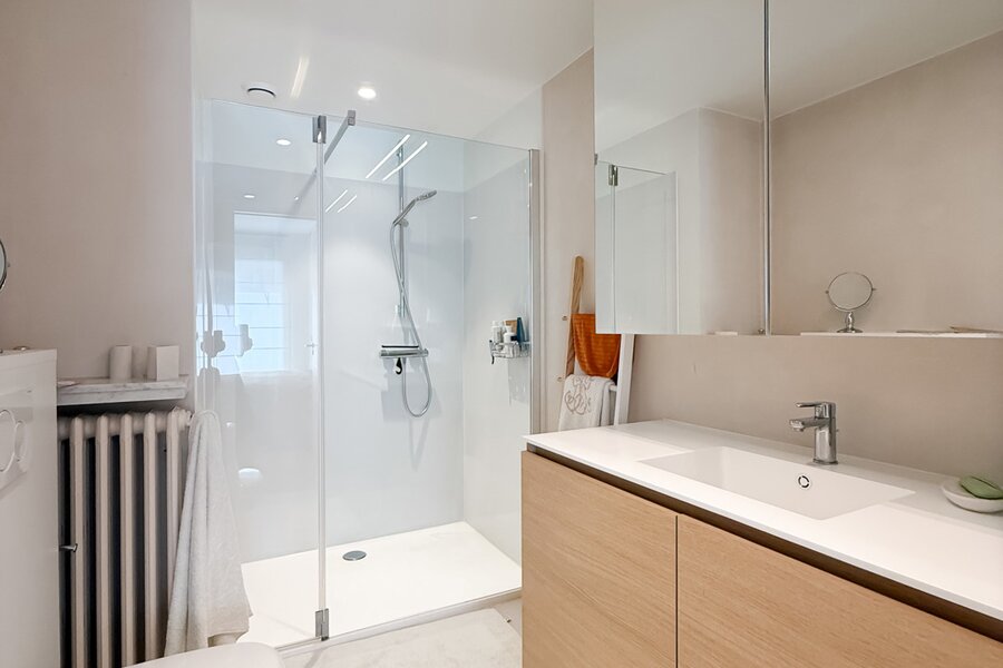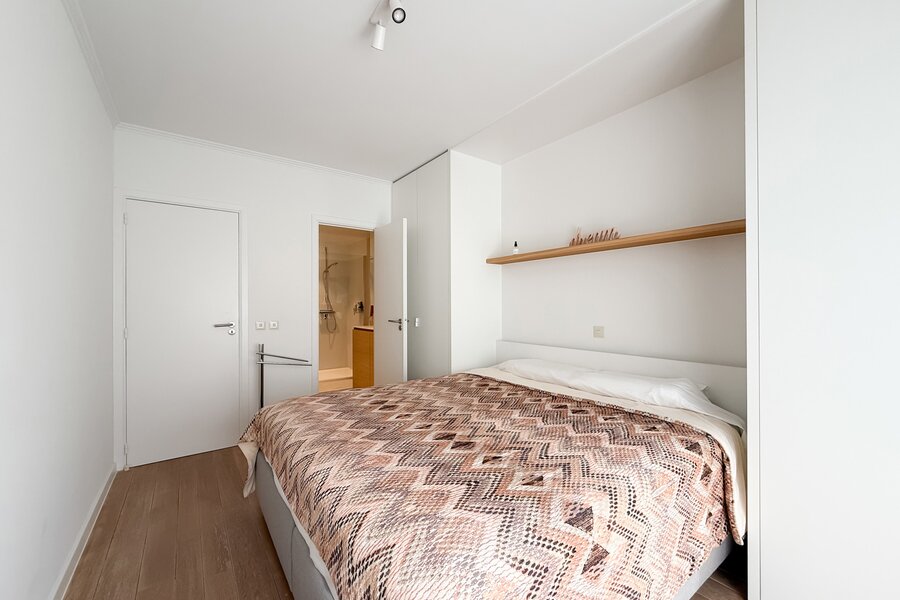 Achteraan bevindt zich een volwaardige slaapkamer met ingemaakte kasten en toegang tot een zonnig, zuidgericht terras — een rustige plek om te ontspannen. De badkamer is stijlvol ingericht met lavabo, ruime inloopdouche en toilet.