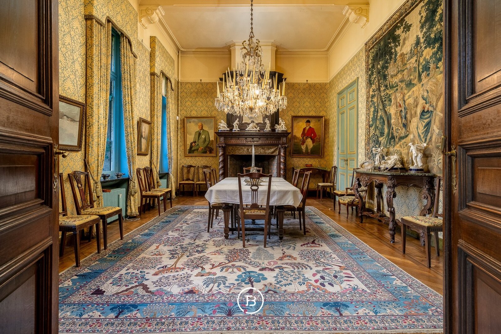 Op het gelijkvloers betreedt u het kasteel via een statige centrale trappenhal, die enerzijds toegang geeft tot het gezellige salon en anderzijds tot de royale eetkamer en de keuken met bijkeuken.