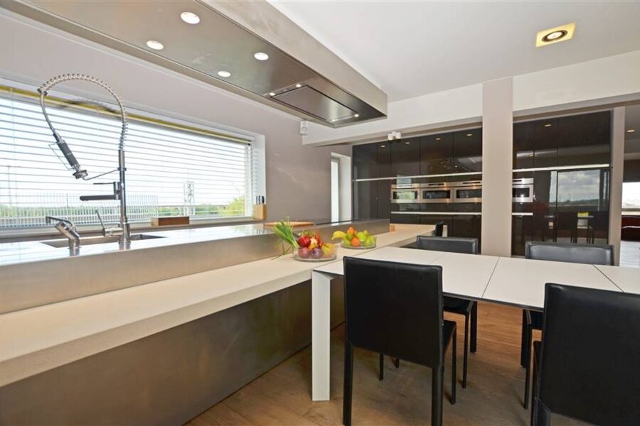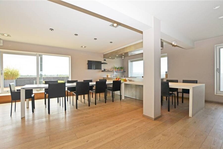 Dit exclusieve penthouse, gelegen op de achtste verdieping, werd volledig gestript en heringericht in ±2007-2008 met focus op ruimtebeleving en duurzame kwaliteitsmaterialen. De grote troeven van dit appartement zijn de bewoonbare oppervlakte, het ruime terras met panoramisch zicht, veel natuurlijk daglicht en privacy. Het leefgedeelte is een open aaneenschakeling van een ruime zithoek, een bibliotheek, een eetplaats en een leefkeuken van Siematic. Deze is volledig geïnstalleerd naar hedendaags comfort met een ontbijthoek en ATAG-toestellen (stoomoven, heteluchtoven, combi-oven, microgolf, vaatwasser, 5-pit inductiekookplaat, Novy dampkap, …). De open keuken zorgt voor een leuke connectie met de eetplaats. Een aangename woonsfeer en ruimtegevoel worden gecreëerd dankzij hoge plafonds en veel lichtinval. Het nachtgedeelte omvat een mastergedeelte met inbouwkasten en een ensuite badkamer met ligbad, inloopdouche en dubbele wastafel. Daarnaast is er een tweede slaapkamer met inbouwkasten, een bureelruimte die omgevormd kan worden tot derde slaapkamer en een zithoek. Deze zithoek kan mogelijks ook omgevormd worden zodat het appartement over vier slaapkamers beschikt. Verder is er een tweede badkamer met ligbad en wastafel, een apart toilet, een kleine berging en een ruime wasplaats. Uitzonderlijk is het terras van maar liefst 150m². Door de gunstige oriëntatie kunt u heel de dag genieten van volledige privacy en een prachtig vergezicht over heel Hasselt. Op het terras is er nog een berging van 18m², ideaal als extra stockageruimte. Er zijn twee ondergrondse garageboxen optioneel aan te kopen aan 30 000,- per stuk. Gemeenschappelijke kosten per maand: ± 350,- EUR per maand inclusief verwarming en warm water inbegrepen. Extra’s: lift (2016), nieuwe cv-installatie van 2024-2025 (CV is een individuele aansluiting op een gemeenschappelijke stookinstallaties. Idem voor warm water), inbouwpots met ledverlichting, veiligheidsdeur, aluminium ramen met hoog isolerend en deels zonwerend glas, schilderijrails, NAD-geluidsinstallatie, Niko-inbus systeem, dak bijkomende thermische isolatie aangebracht in 2007 (10cm polystyreen met betondekking), gevels van het penthouse extra geïsoleerd met 2 x 60mm rotswol, …