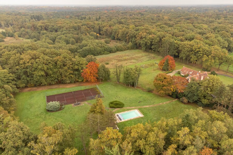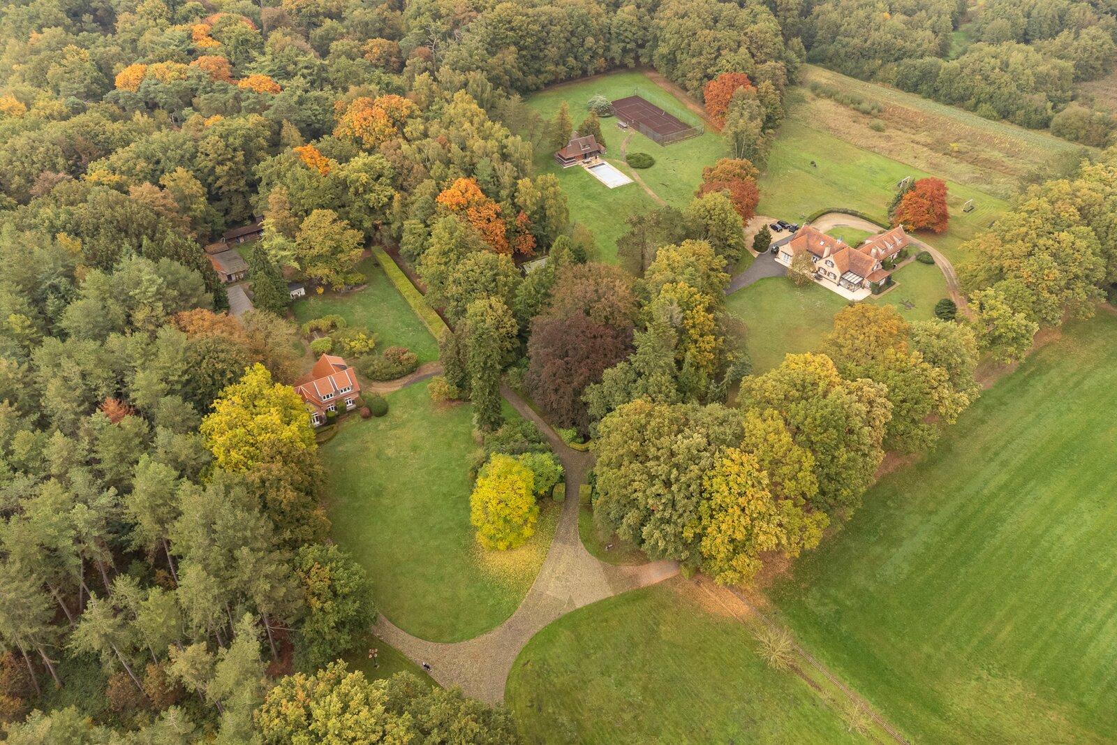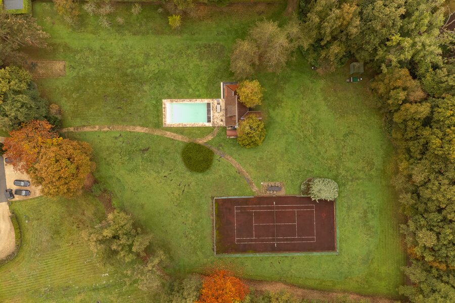 Een privédomein dat rust, klasse en natuurbeleving uitstraalt — met twee afzonderlijke woningen, een zwembad met poolhouse en bar, een tennisveld, stallen en diverse bijgebouwen.