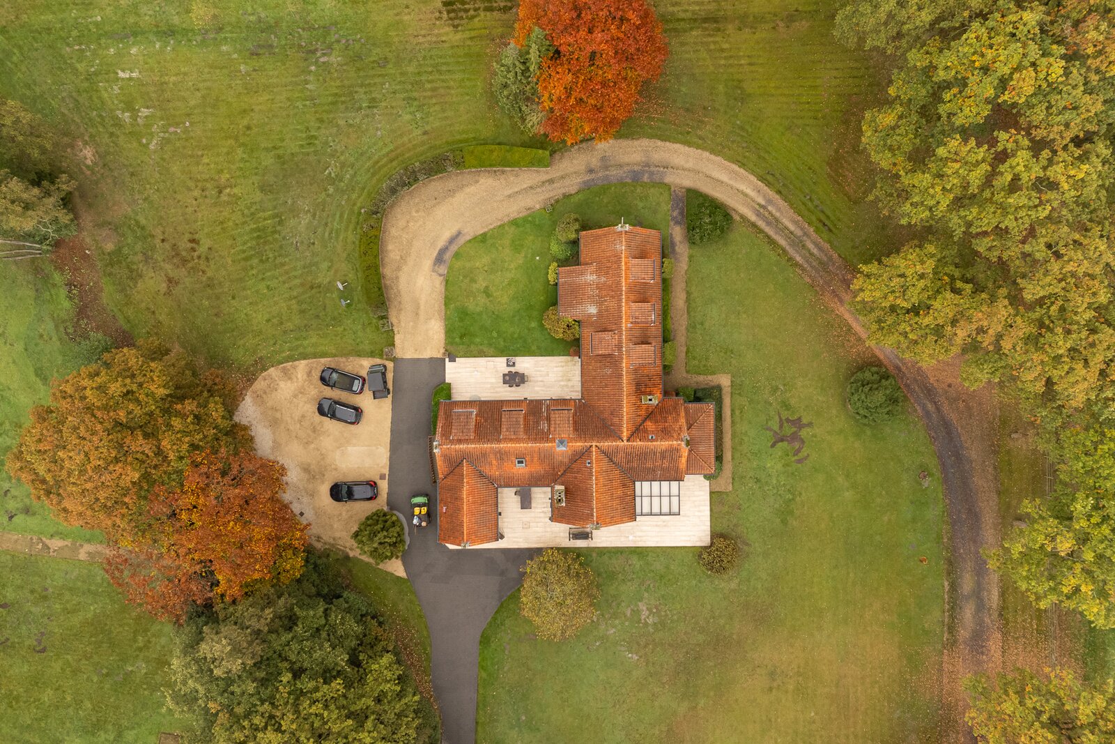De lange oprijlaan met smeedijzeren toegangspoorten garandeert volledige privacy en een statige aankomst.