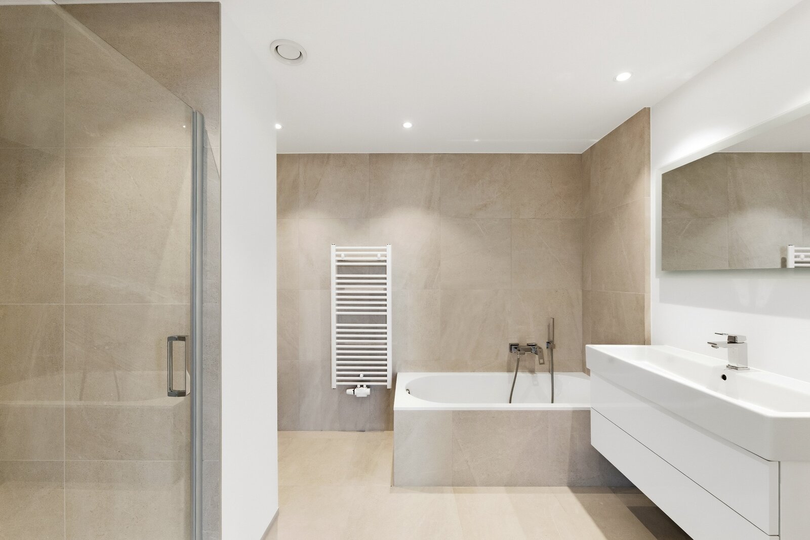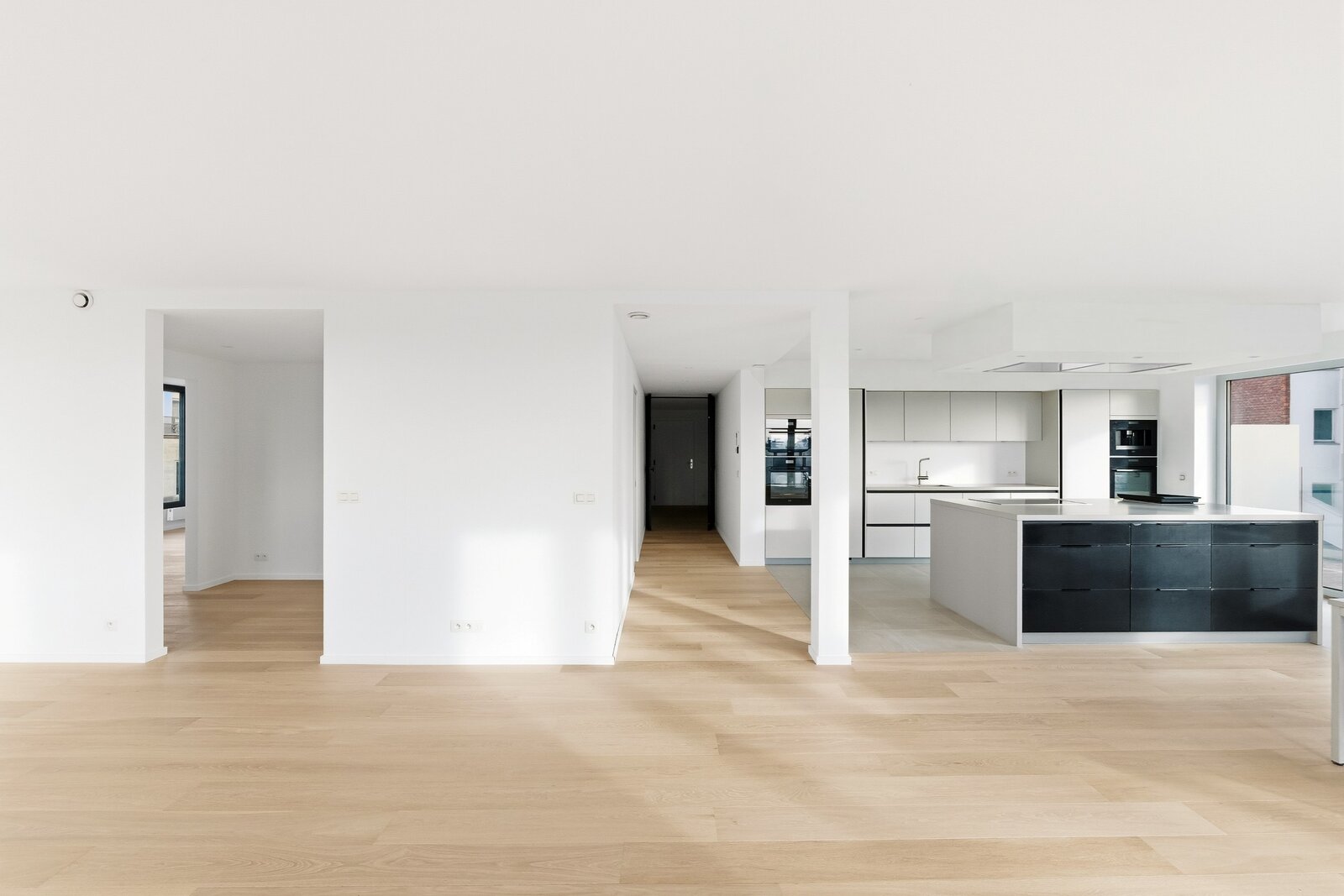 Bij binnenkomst geeft de inkomhal met op maat gemaakte vestiaire en gastentoilet meteen de toon aan. De grote, met licht overgoten leefruimtes openen naar een zuidgericht terras. De volledig uitgeruste open keuken sluit aan op een praktische bijkeuken en een aparte wasruimte. Het nachtgedeelte beschikt over twee ruime slaapkamers, elk met dressing en en-suite badkamer, die esthetiek en functionaliteit combineren.