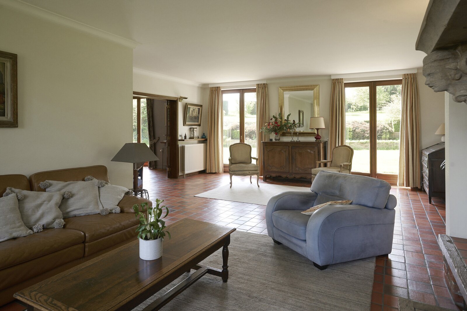 Het gelijkvloers omvat een inkomhal met vestiaire en toilet, een bureau, ruime leef- en ontvangstruimten met open haard en eetkamer die uitgeven op het terras en de tuin, een gezinskeuken met ontbijthoek, wasruimte, berging en een ruime dubbele garage met atelier en toegang tot de tuin.