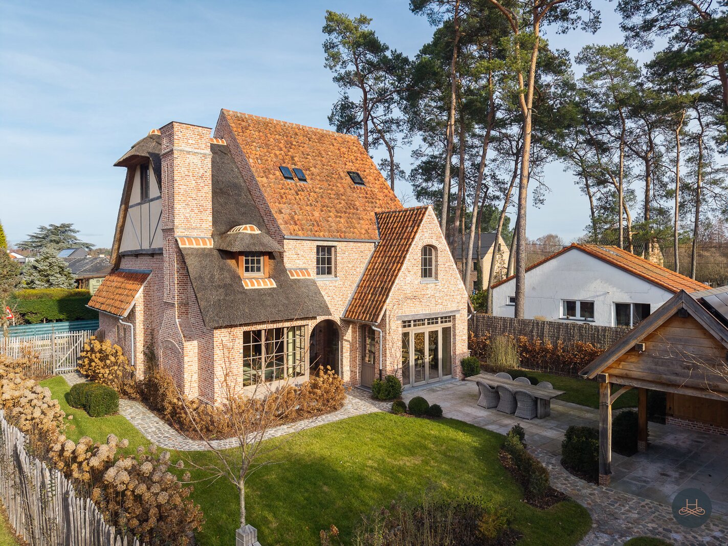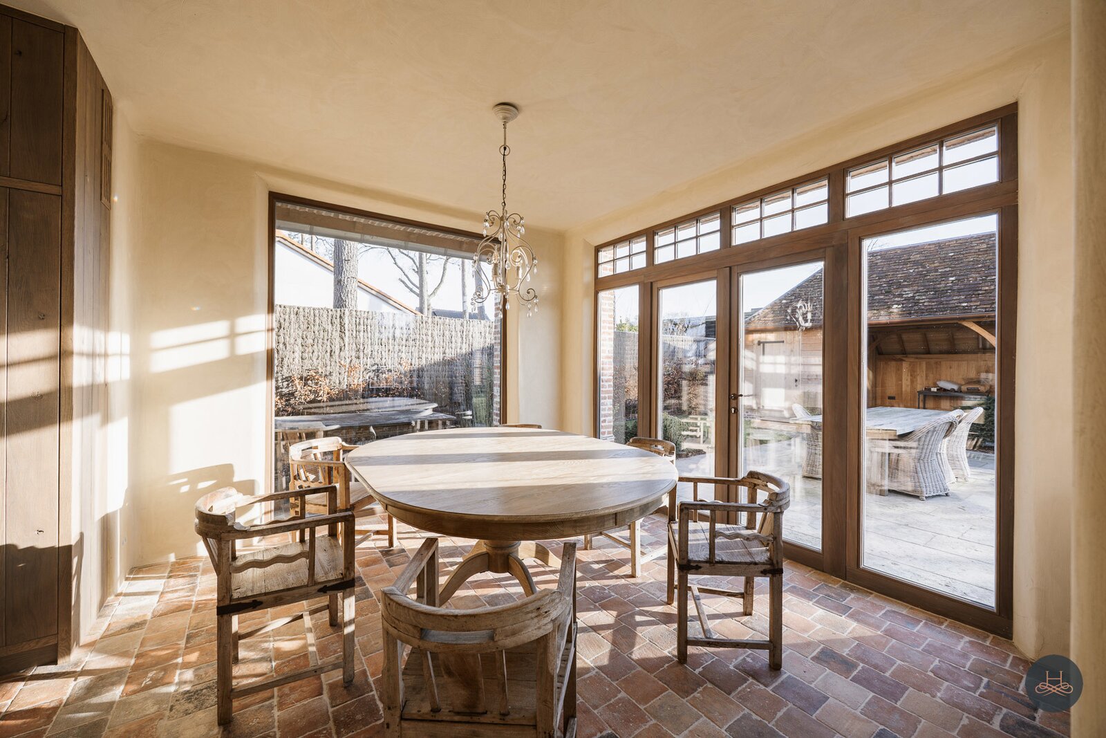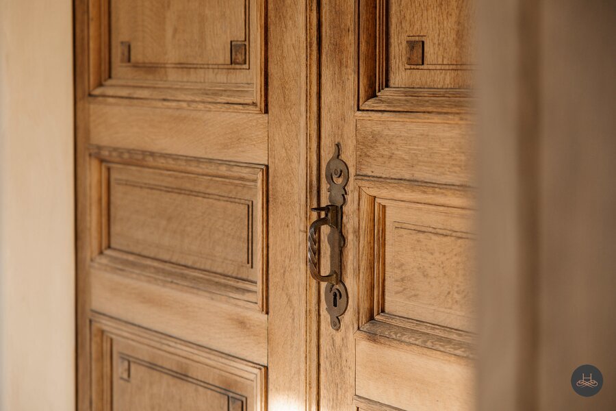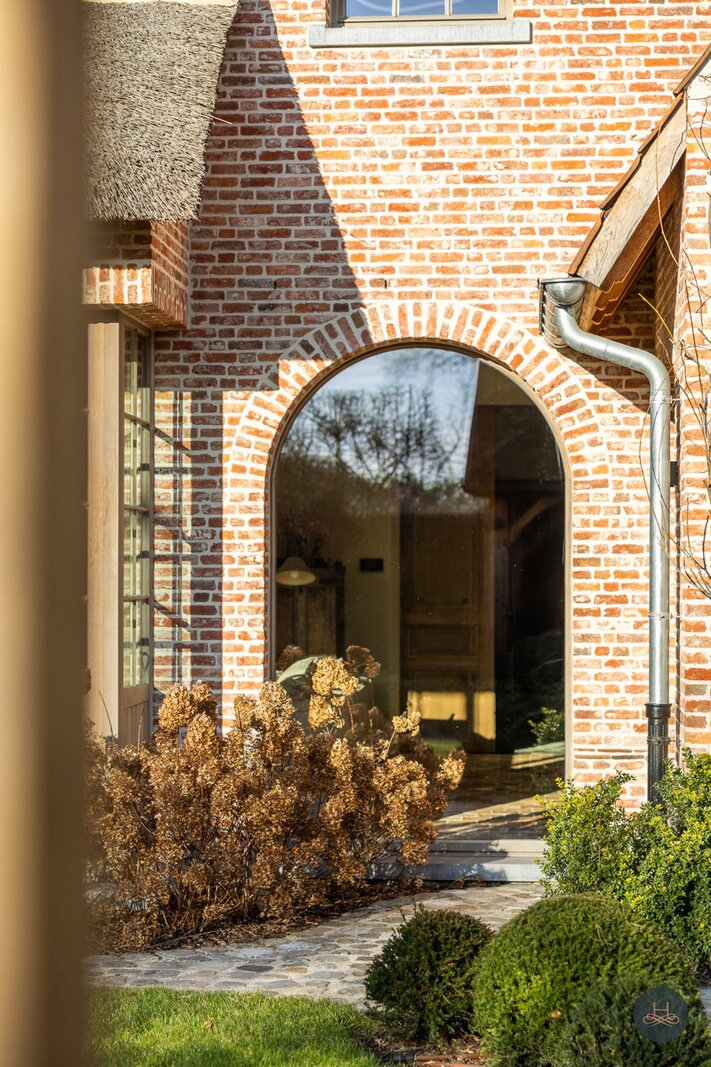 Reeds bij het betreden van de woning wordt de toon gezet door een karaktervolle terracotta vloer in een uniek diamantpatroon, die een tijdloze elegantie uitstraalt. Deze focus op hoogwaardige materialen vertaalt zich in ambachtelijke metseltechnieken, massief eiken keuken, authentieke deuren uit Franse kastelen, massieve Afromosia-schrijnwerk, oude Boomse pannen (1850),... en wordt prachtig doorgetrokken naar het riante bijgebouw, dat met zijn oude bourgondische tegelpannen en massieve houten balken het exclusieve karakter van het geheel vervolledigt.
