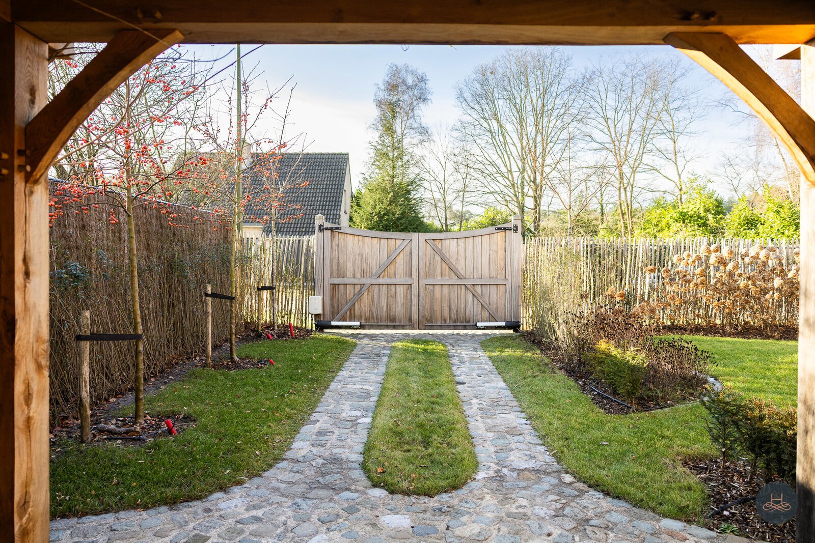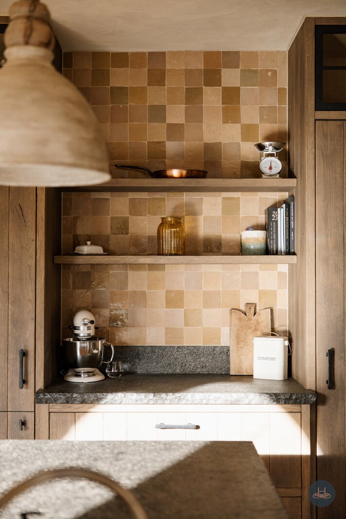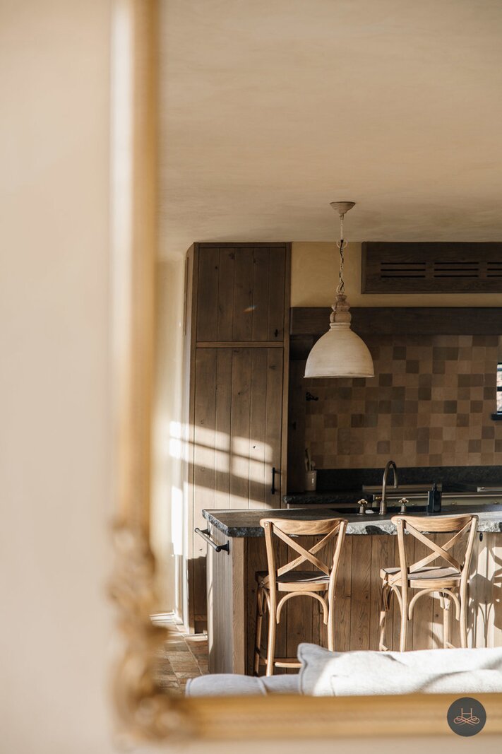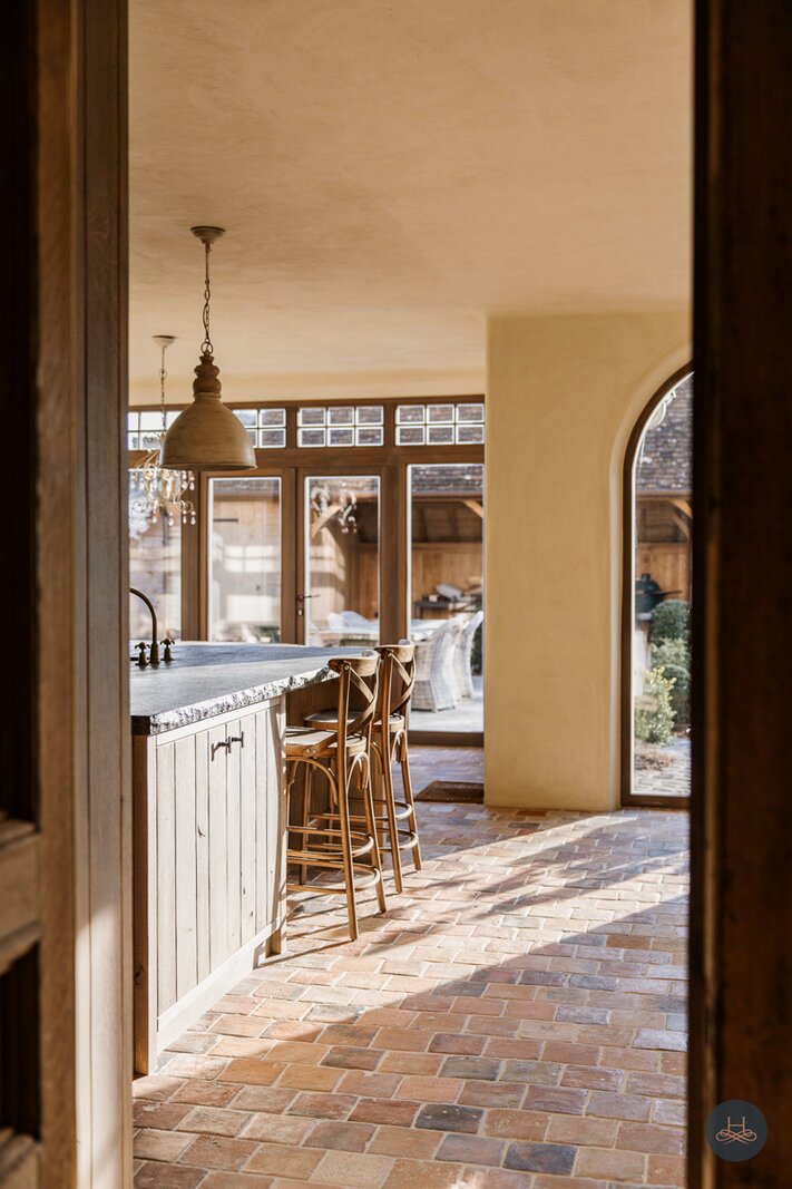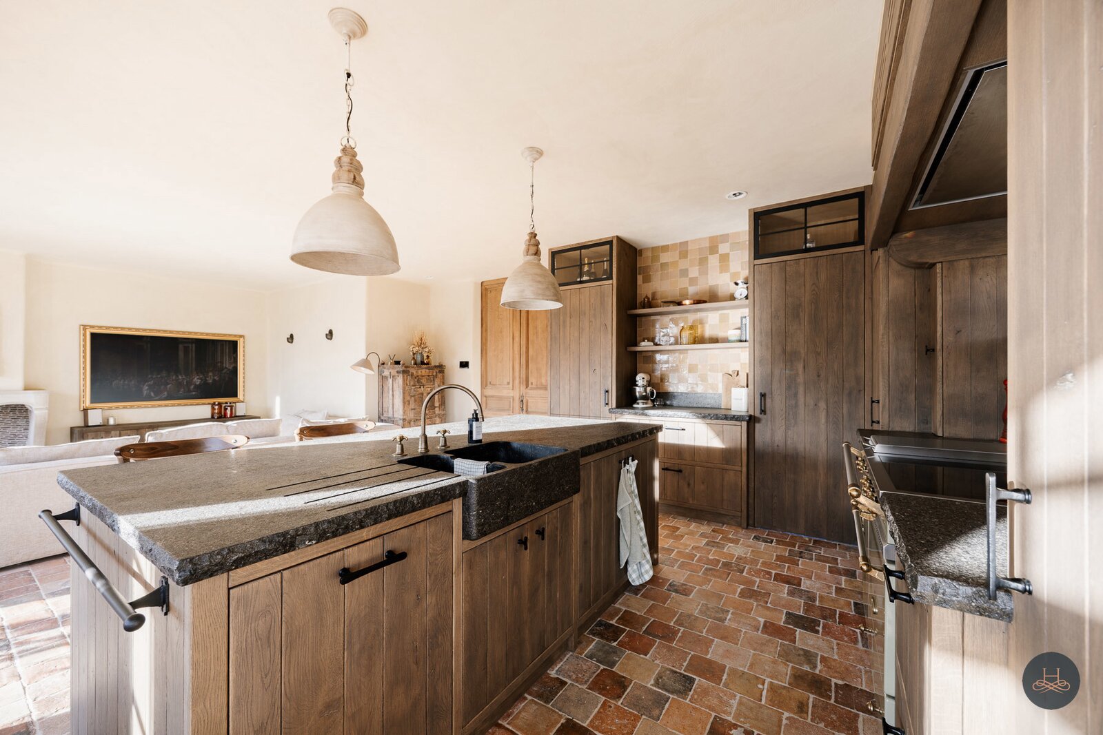 Reeds bij het betreden van de woning wordt de toon gezet door een karaktervolle terracotta vloer in een uniek diamantpatroon, die een tijdloze elegantie uitstraalt. Deze focus op hoogwaardige materialen vertaalt zich in ambachtelijke metseltechnieken, massief eiken keuken, authentieke deuren uit Franse kastelen, massieve Afromosia-schrijnwerk, oude Boomse pannen (1850),... en wordt prachtig doorgetrokken naar het riante bijgebouw, dat met zijn oude bourgondische tegelpannen en massieve houten balken het exclusieve karakter van het geheel vervolledigt.