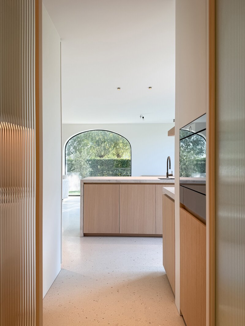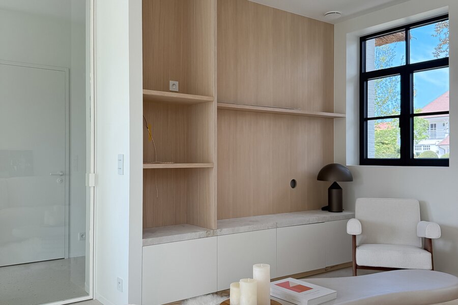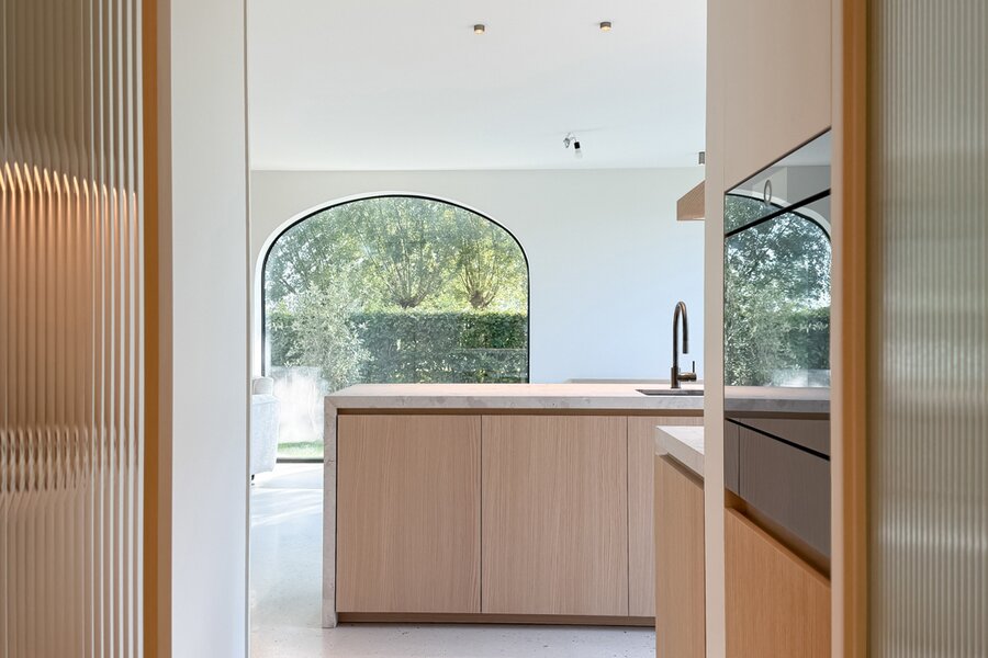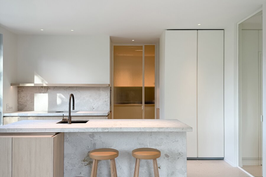Via een stijlvolle inkomhal met vestiaire en gastentoilet betreedt u een zonovergoten leefruimte, waar natuurlijke lichtinval en warme materialen een harmonieus geheel vormen. De gezellige eetruimte sluit naadloos aan op een royaal terras en prachtig aangelegde tuin. De open keuken met kookeiland, afgewerkt in natuursteen en terrazzo, is uitgerust met topapparatuur van V-Zug. Een charmante koffiehoek en functionele bijkeuken vervolledigen deze leefruimte.