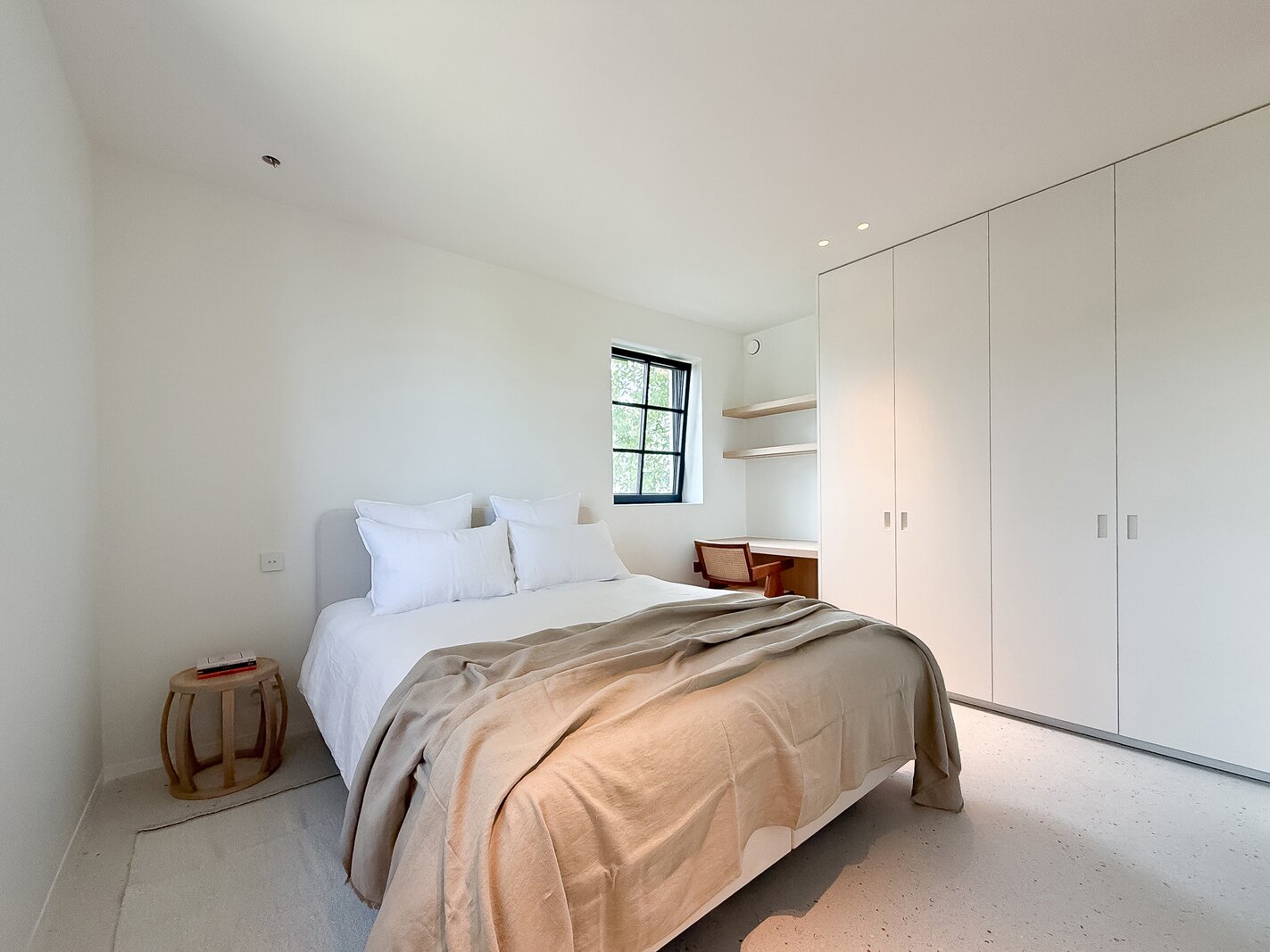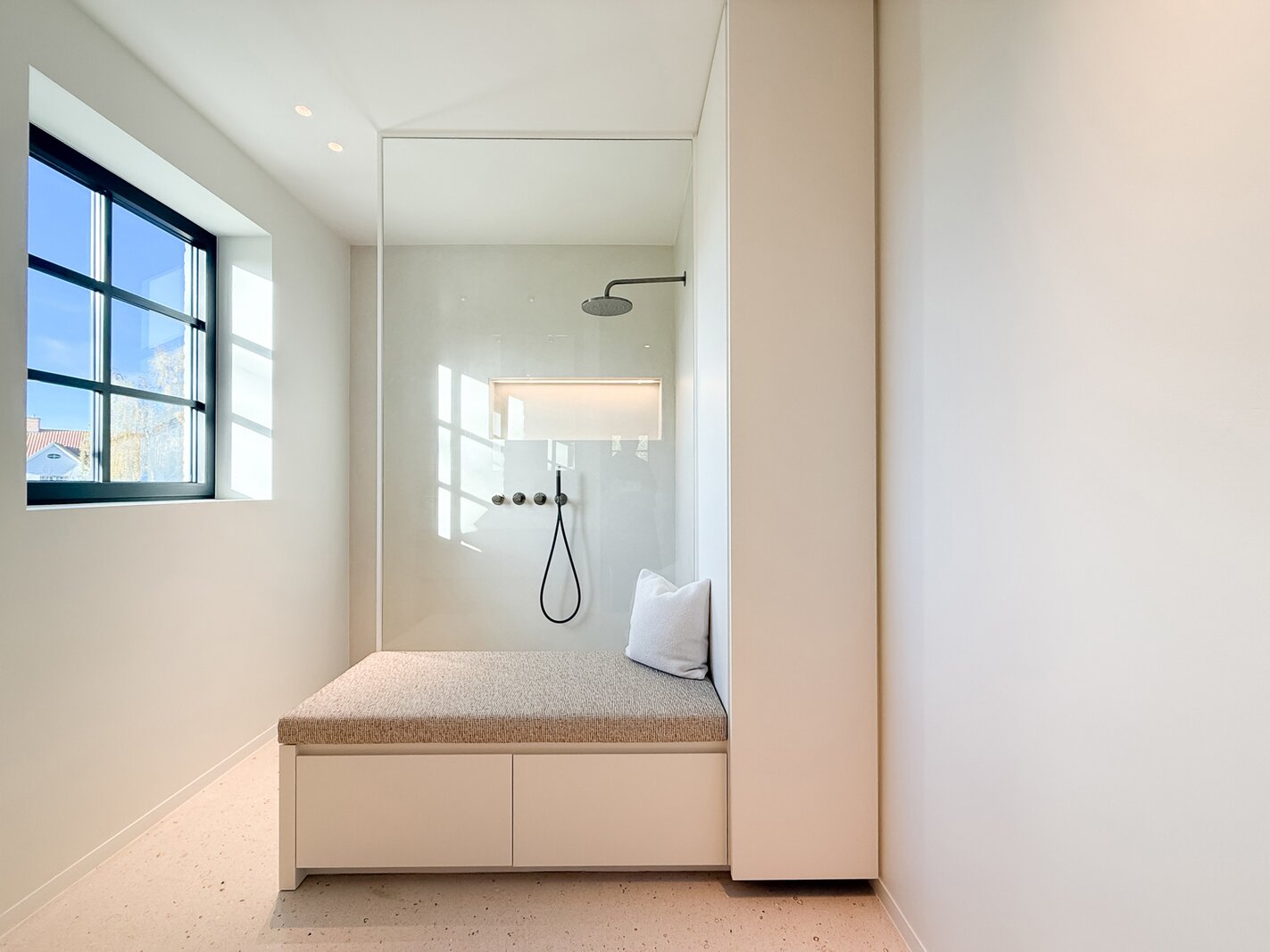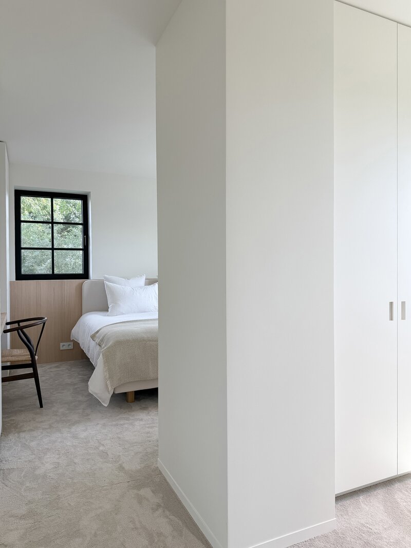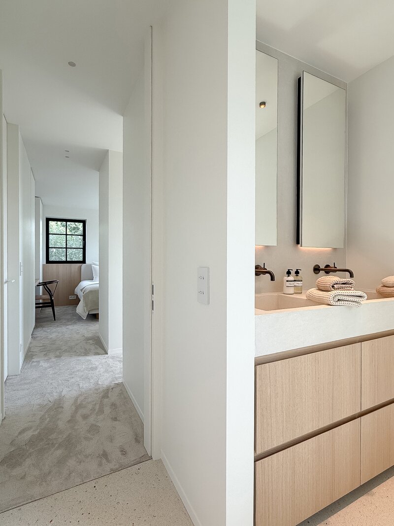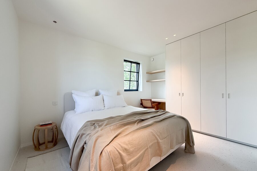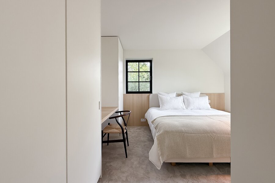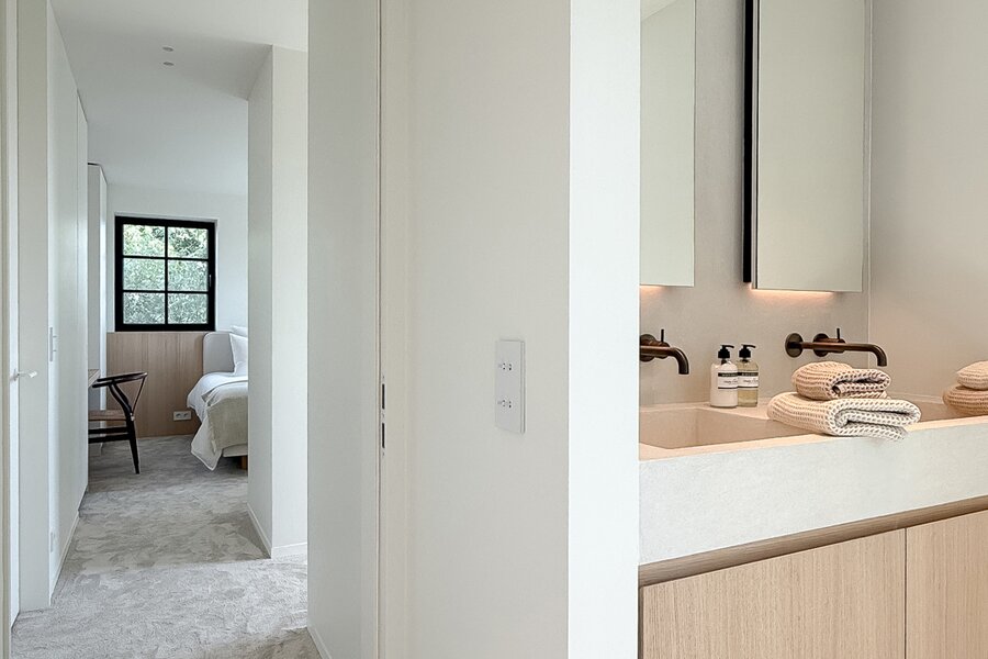 Op de eerste verdieping vindt u 3 ruime slaapkamers, elk met ingemaakte kasten en een eigen badkamer. De master suite beschikt over een ensuite badkamer, dressing en hoogwaardige afwerkingen in forcrete en terrazzo. De bovenverdieping herbergt een 4e royale slaapkamer met bureelhoek en ensuite douchekamer, evenals een polyvalente 5e kamer die als extra slaapkamer, hobbyruimte of ontspanningsruimte kan worden gebruikt.